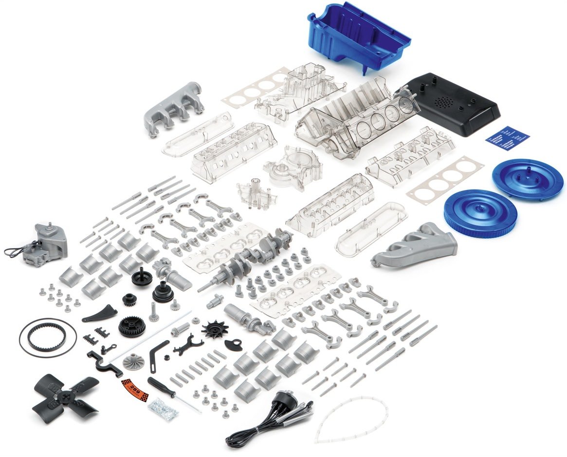 Once assembled the built-in electric motor will turn the crankshaft which sets the cam, valves, pistons, and connecting rods in motion just like the real engine – it even has LEDs in each cylinder that fire like spark plugs at the correct moment.