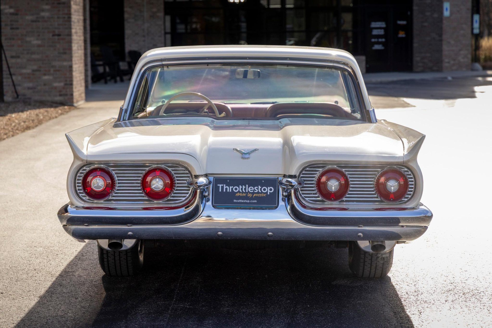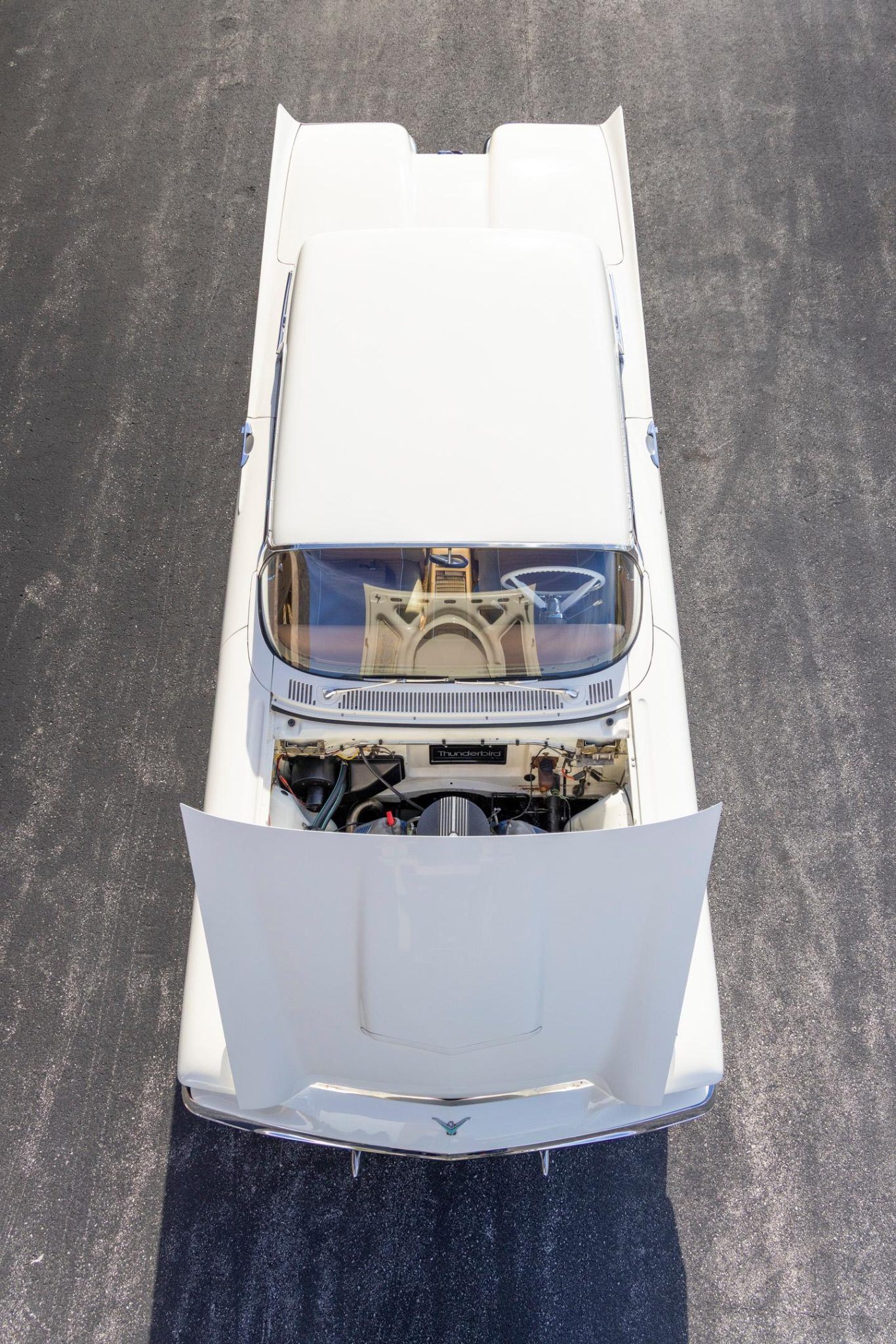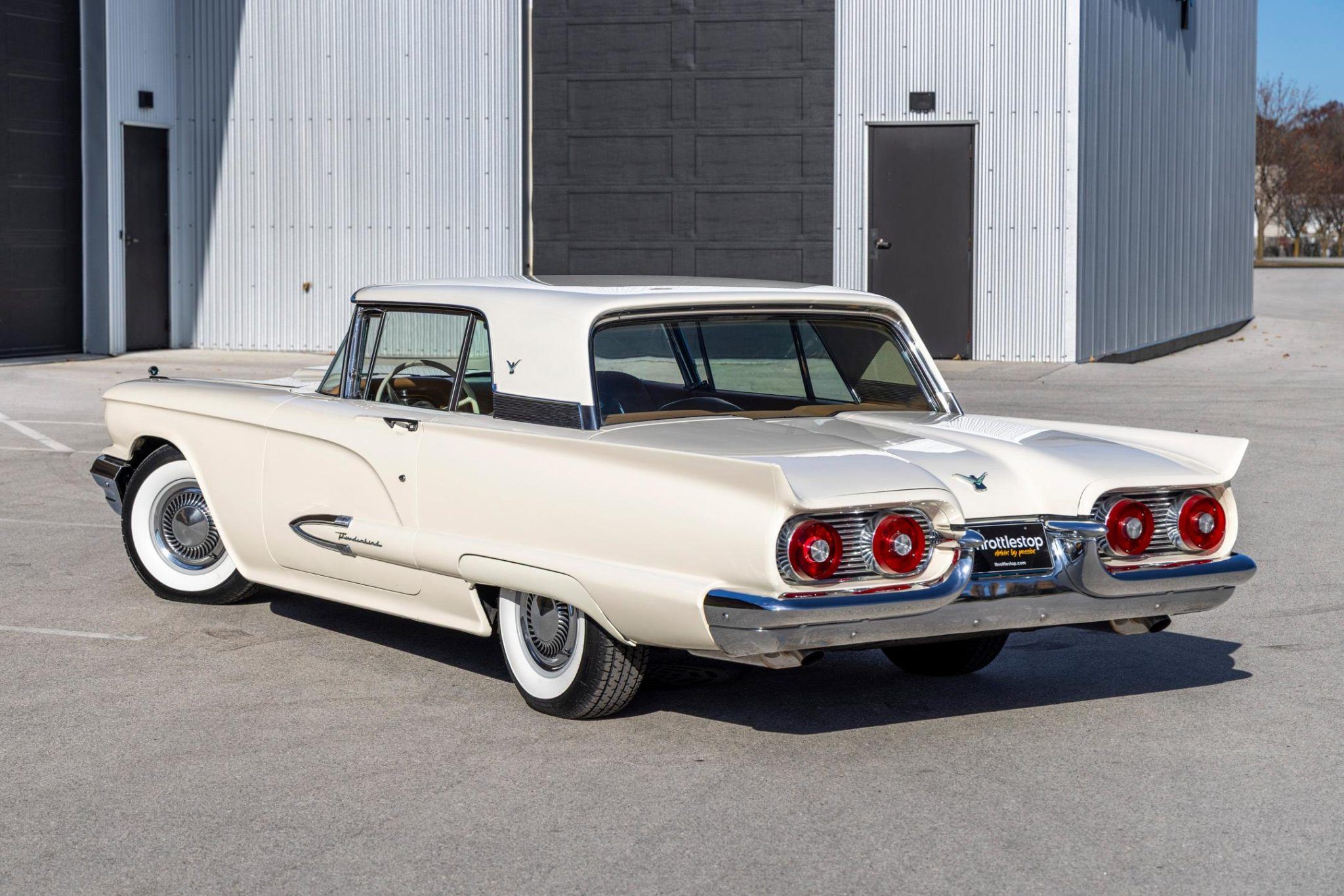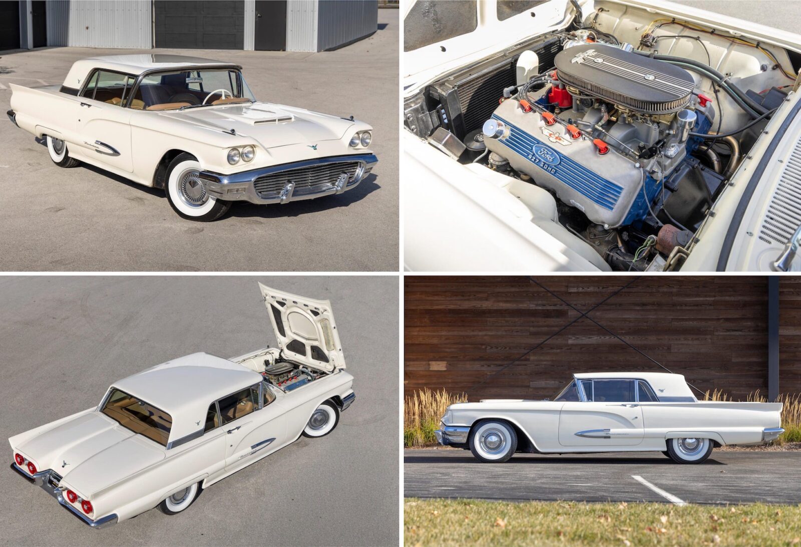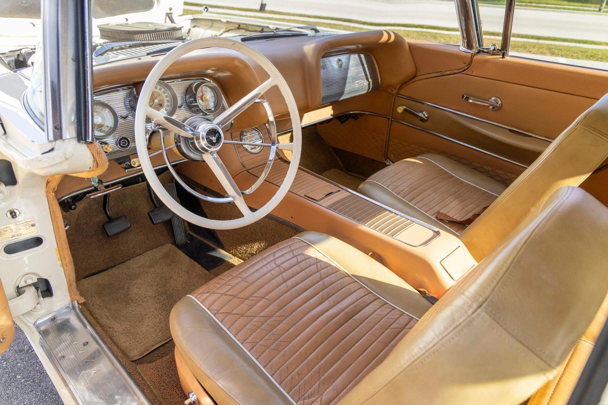 This 1959 Thunderbird has power steering and a 3-speed manual transmission, a custom exhaust system, and Colonial White paintwork over a Hickory Tan leather interior. It rides on 14″ steel wheels with chrome covers that are shod with 225/75 Coker Classic whitewall tires, and it has drum brakes at each corner.