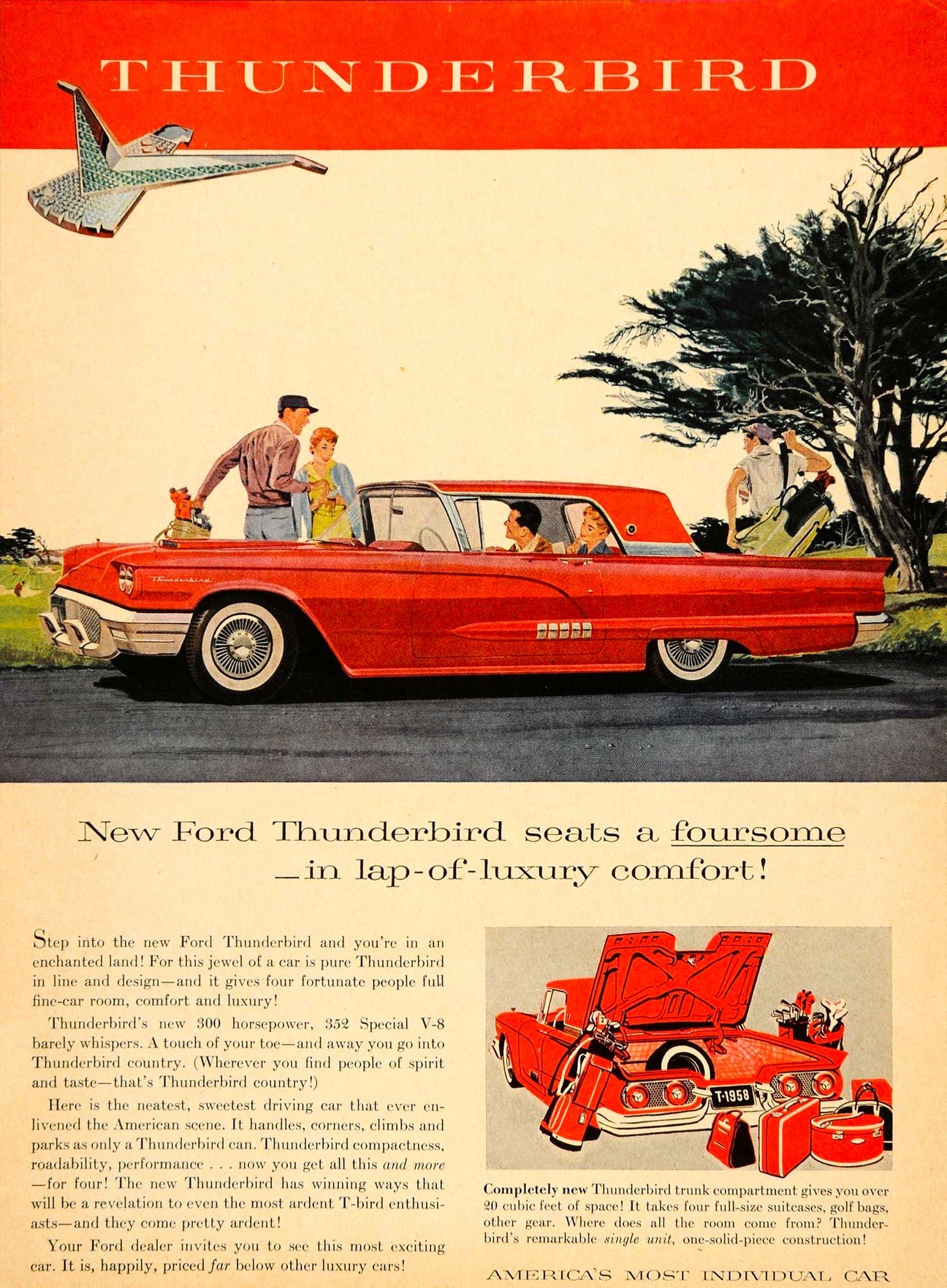- Mechanically, Square Birds were all about V8 torque and interior refinement, powered by the 352 cubic inch FE V8 and optional 430 cubic inch MEL V8. The car had independent front suspension, a coil-sprung live rear axle, and unibody construction. Despite its luxury focus, the model achieved a number of major NASCAR race wins in the late 1950s.