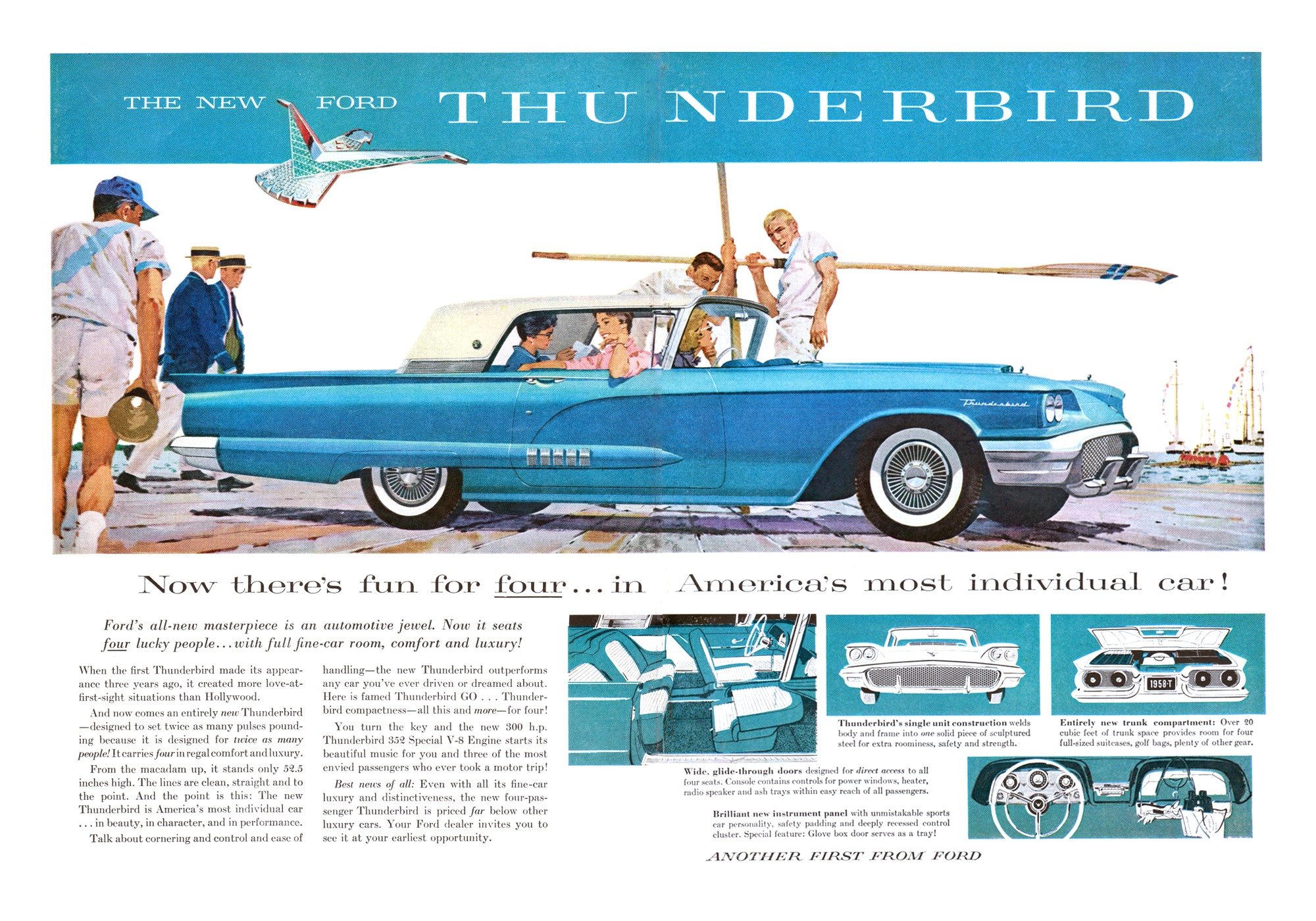 - The second-generation Thunderbird debuted for 1958 and was nicknamed the “Square Bird,” it shifted the model series from a two-seat personal car to a four-seat luxury tourer. Designed under Joe Oros, it emphasized Jet Age styling, comfort, interior space, and visual presence, abandoning any real sports car pretensions in favor of luxury cruising appeal.