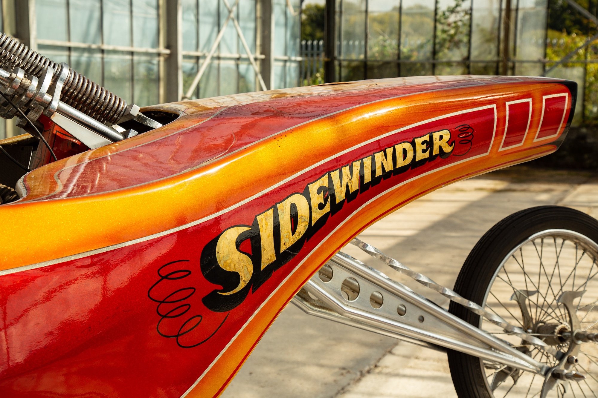 Drive is sent through an automatic transmission to a double chain and sprocket system linked to a three-inch floating rear axle, with gear selection handled by an Ansen posi-shift unit. The engine sits sideways in a tripod-style frame that doubles as a structural cradle, giving rise to the “Sidewinder” name.