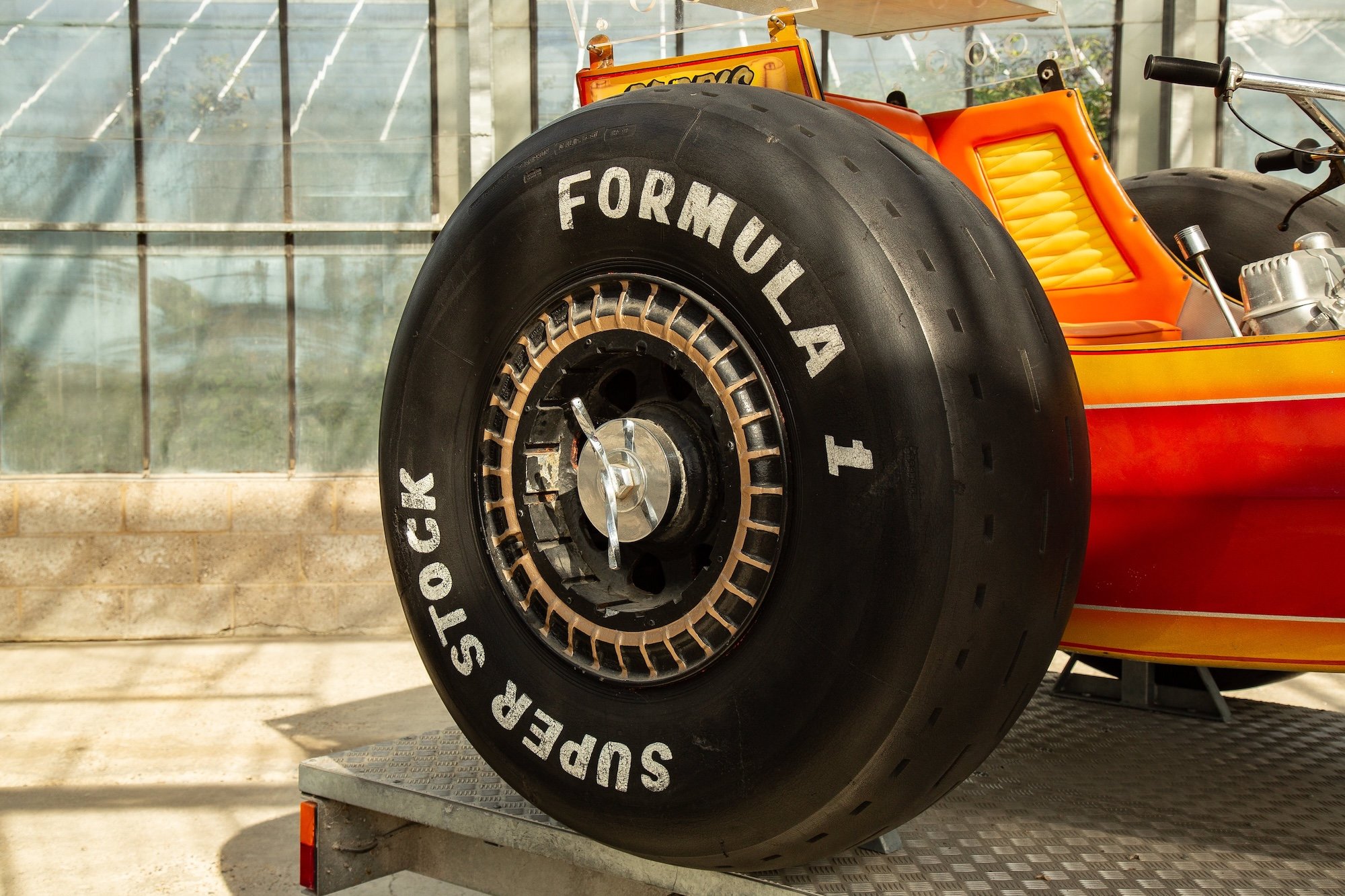 Stopping power comes from twin Hurst/AirHeart discs for low-speed braking, supplemented by dual Dietz parachutes (non-functional) for deceleration at high speed.