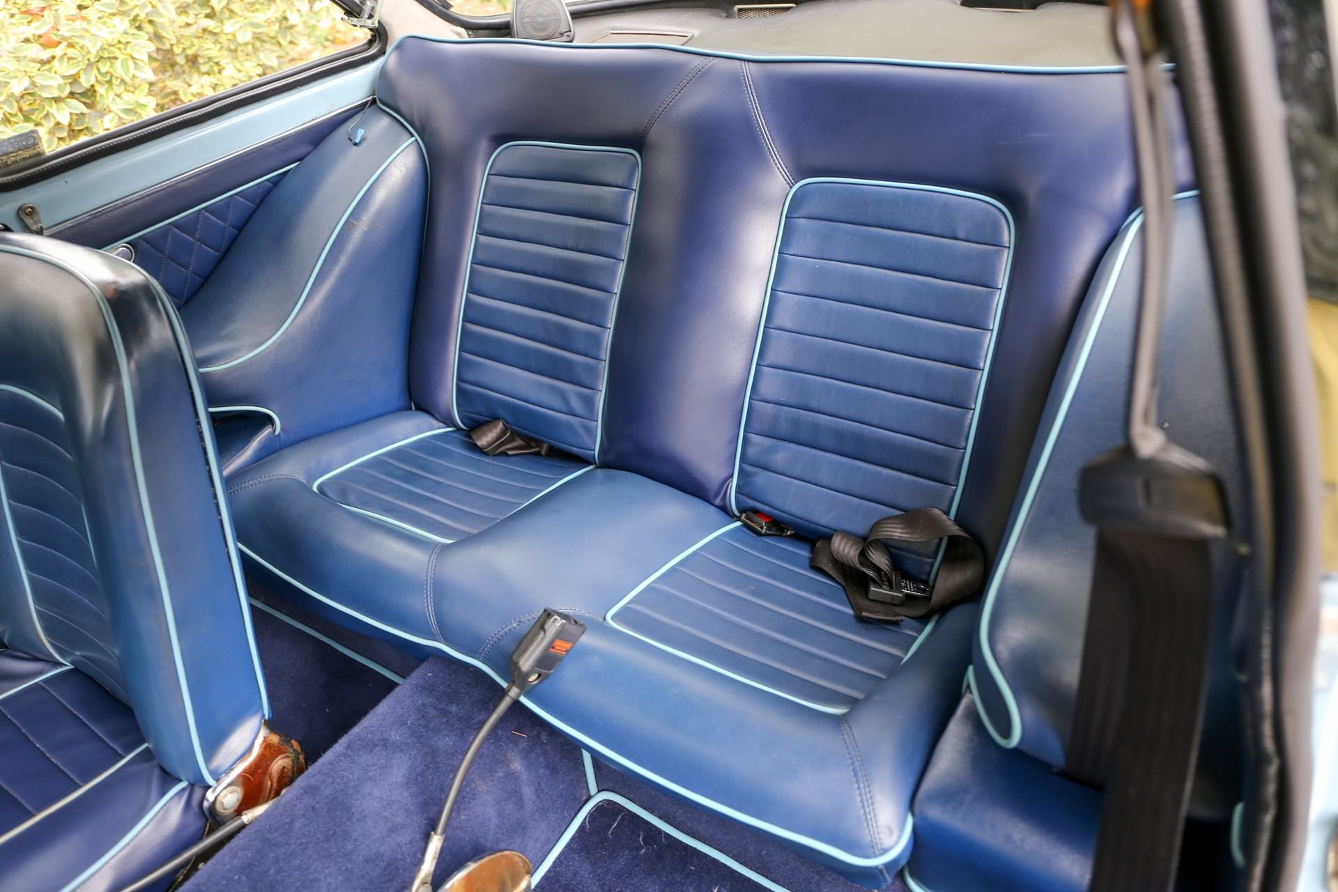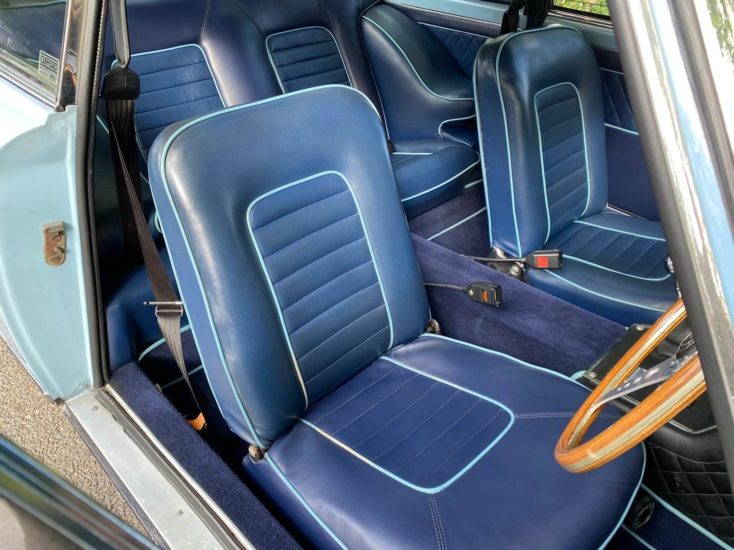 It’s finished in a tasteful light blue over a dark blue interior with light blue piping on the upholstery. It has a classic black dashboard with ample instrumentation, a radio, and a wood-rimmed steering wheel.