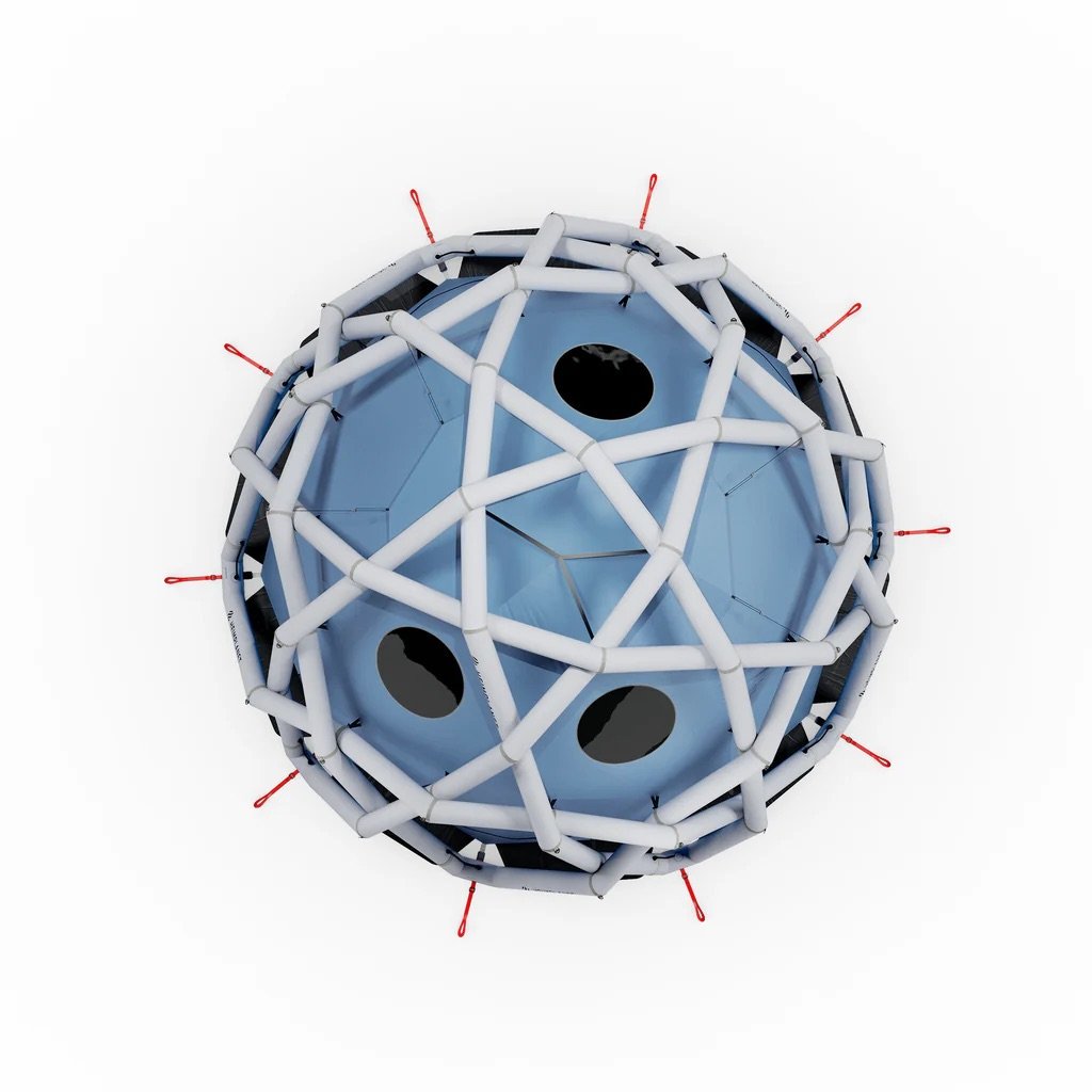 The Blue Ice variant was developed from the original Mavericks design, further refining the geodesic “Inflatable Diamond Grid” frame that originally made Heimplanet famous in the outdoor and camping sector.