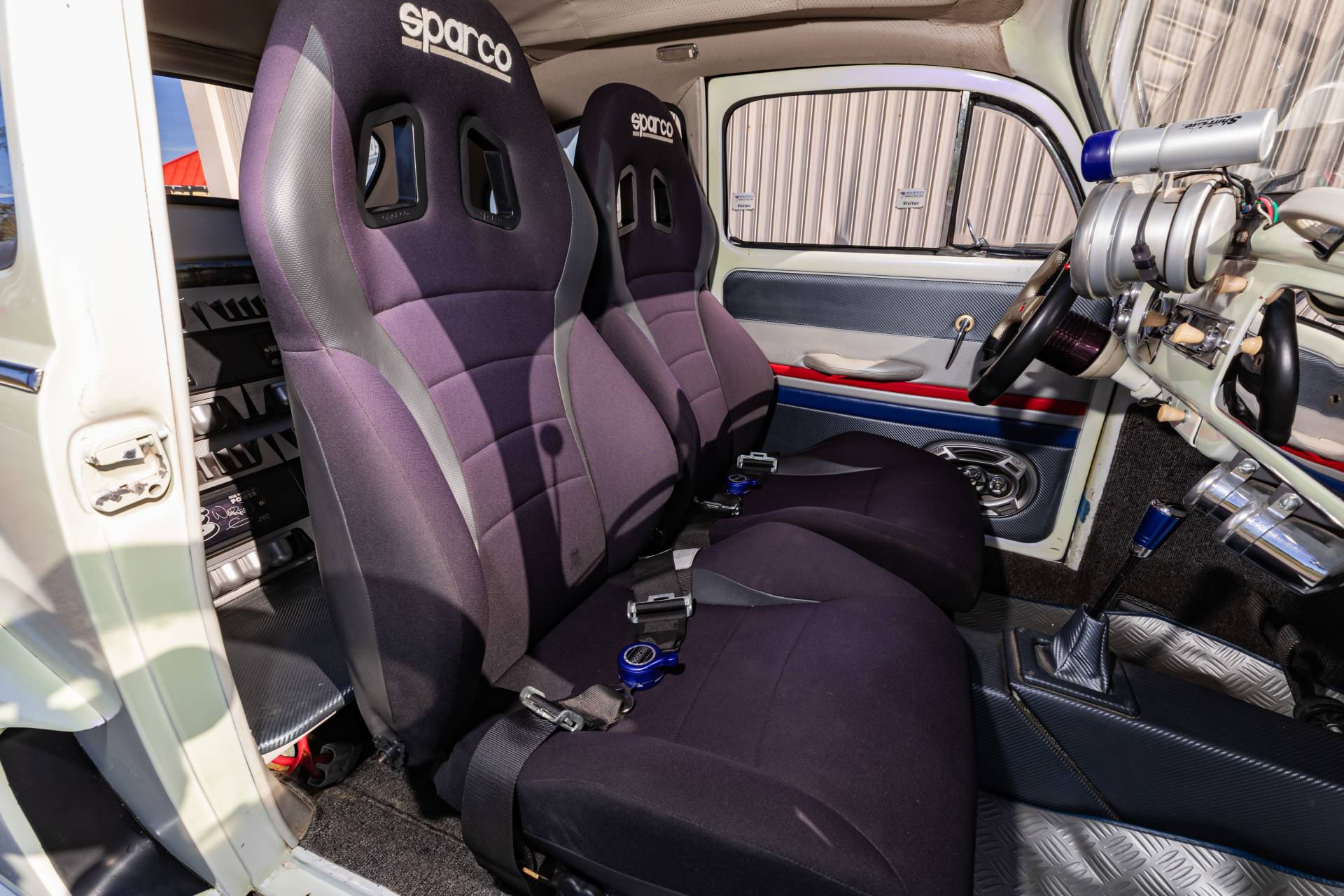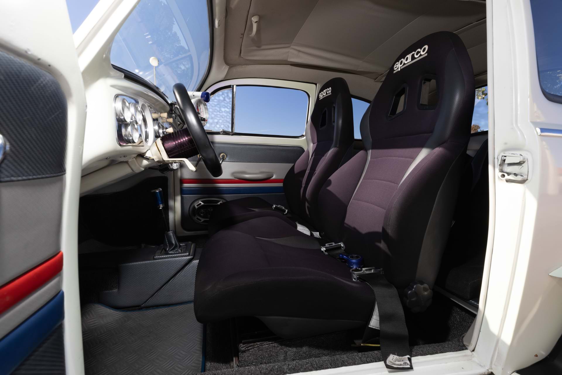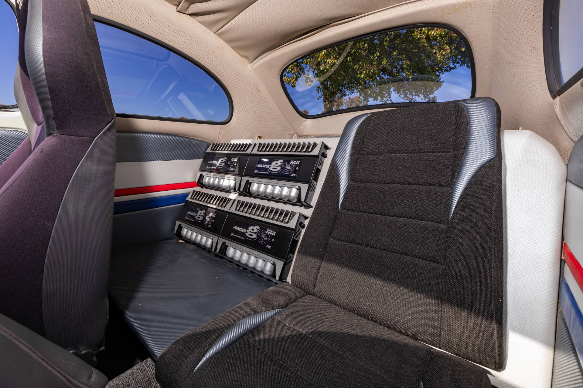 Inside the car you’ll find Sparco racing seats, a Grant GT steering wheel, a custom dash with white dial gauges, a dash-mounted AutoMeter tach, custom door panels, and JVC Warren G amplifiers with subwoofers behind the rear seat.