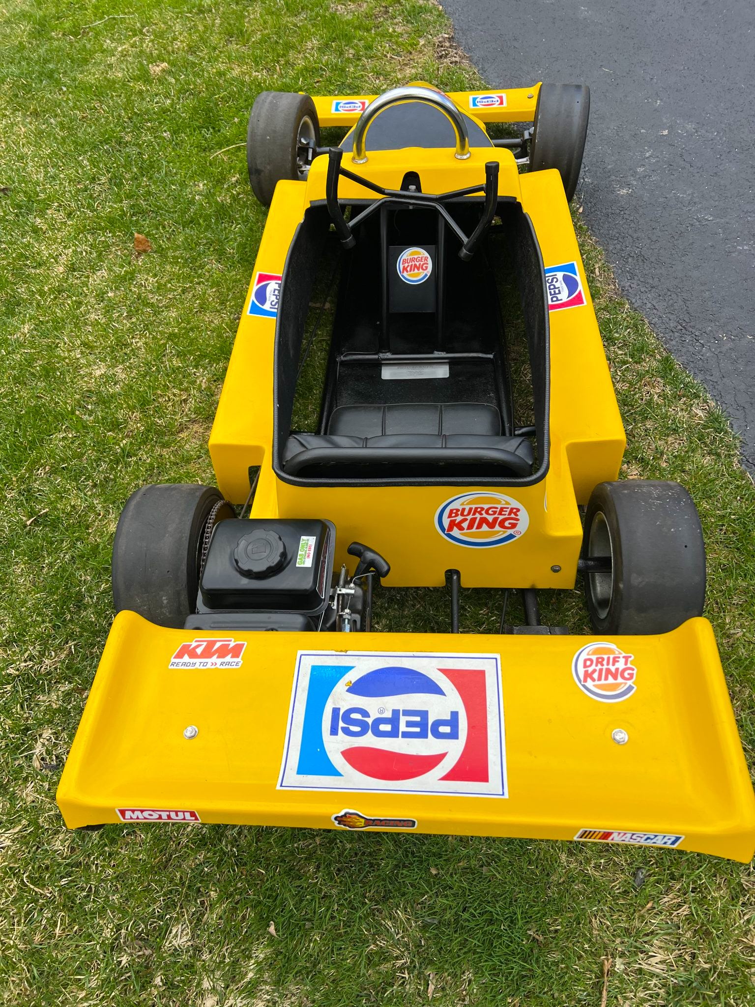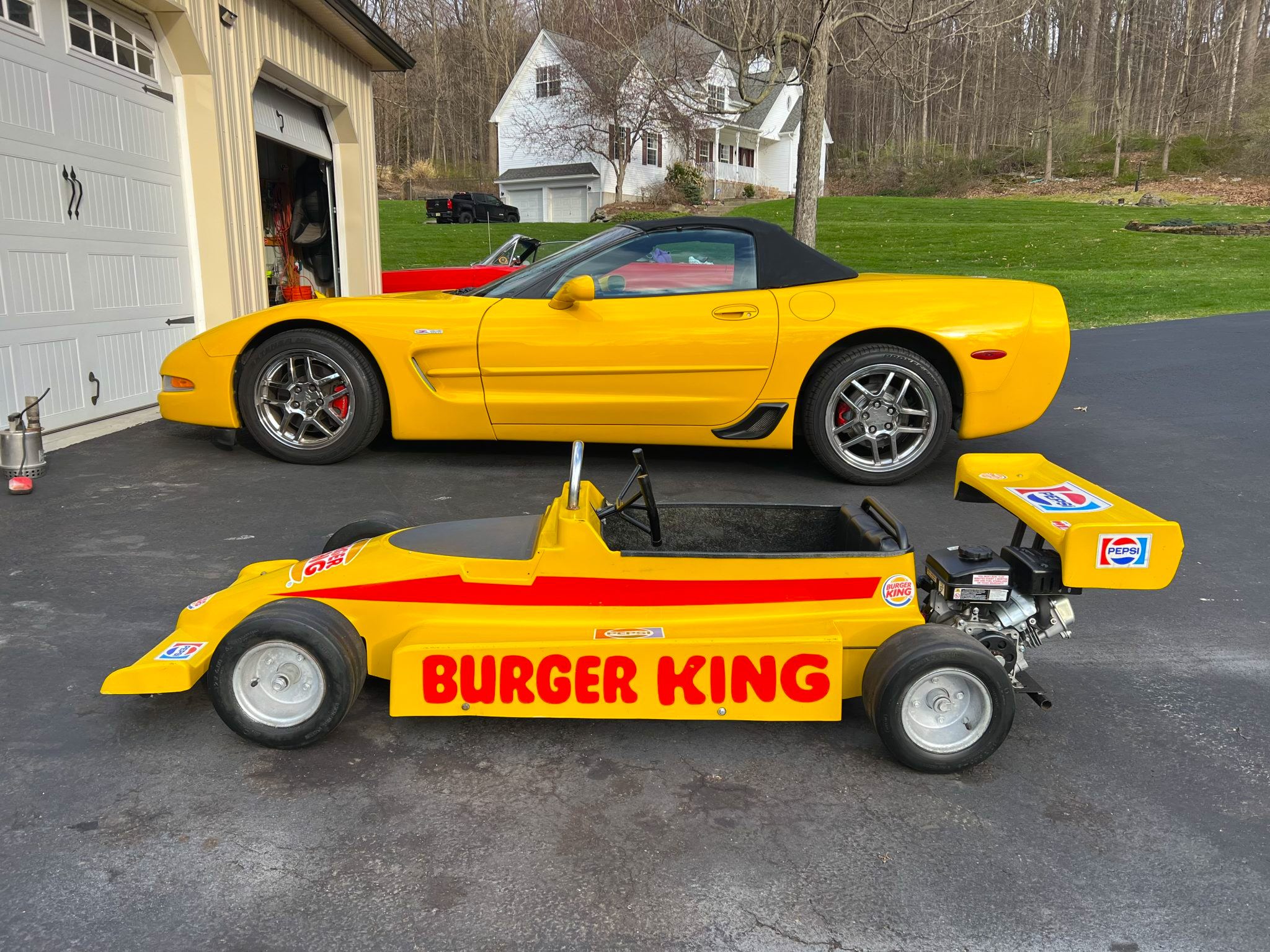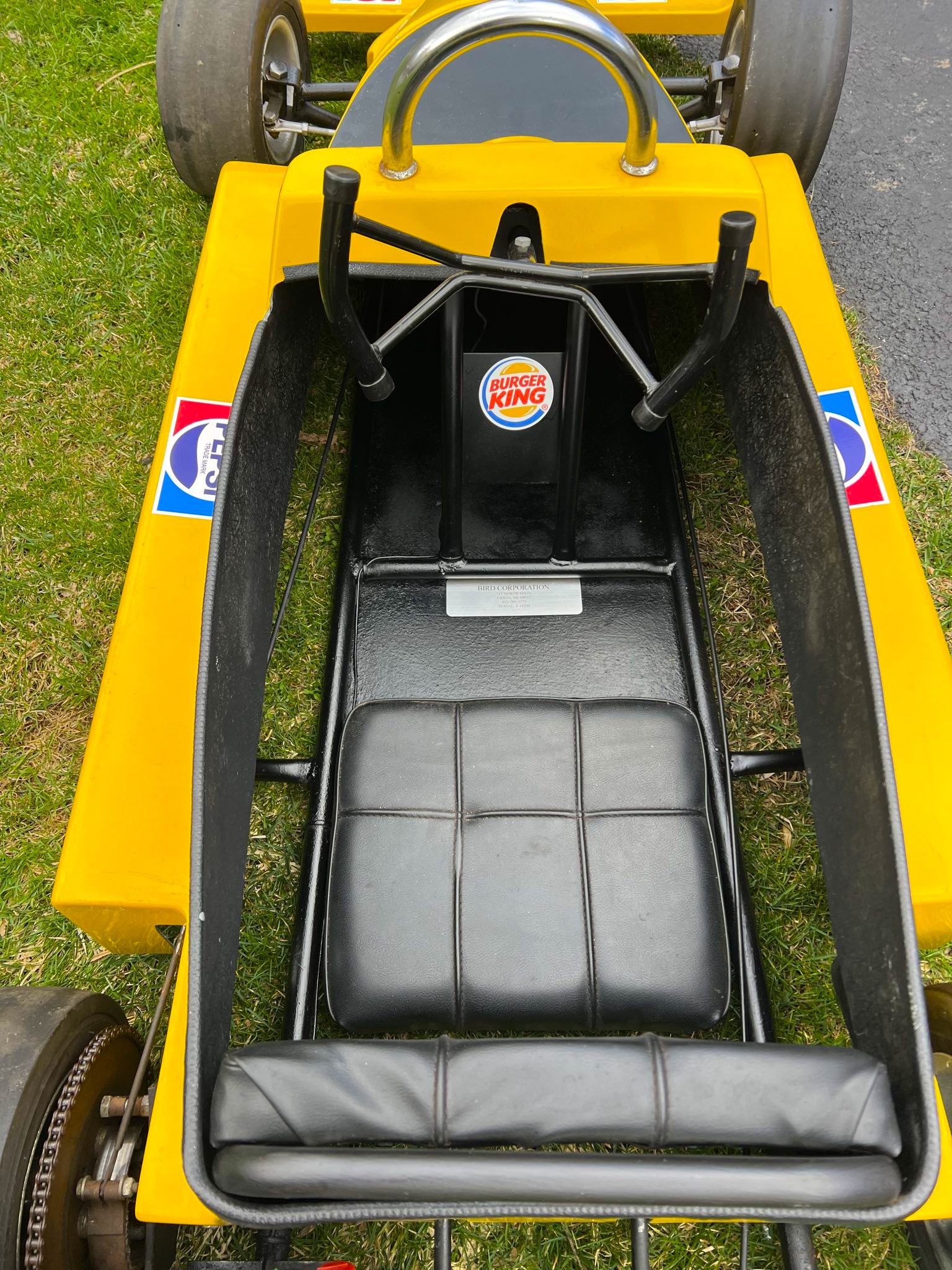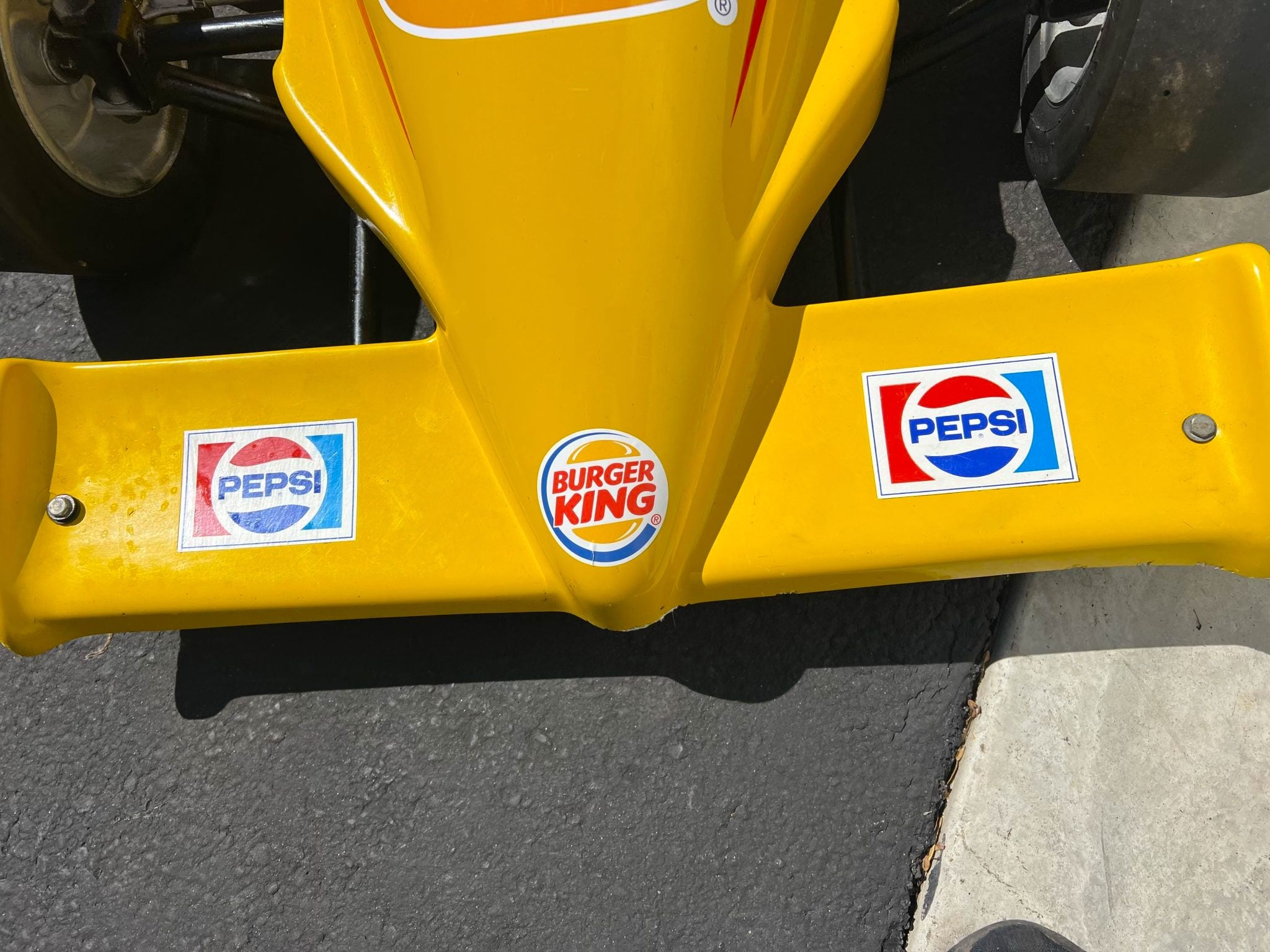 This Bird Corporation Indy Car go kart is finished in yellow fiberglass bodywork wearing a red Burger King livery with Pepsi decals, and it has front and rear wings along with a chrome front roll hoop.