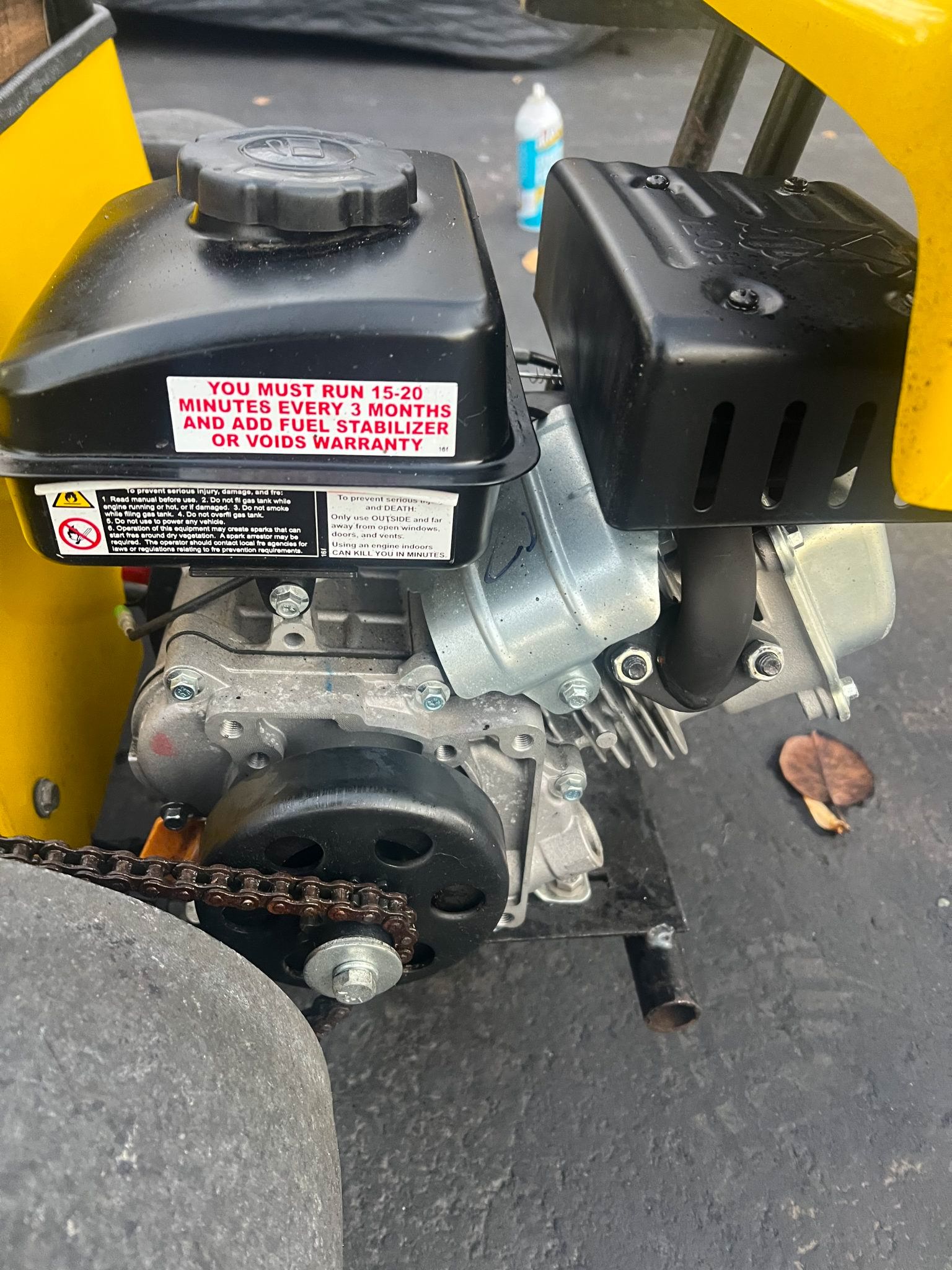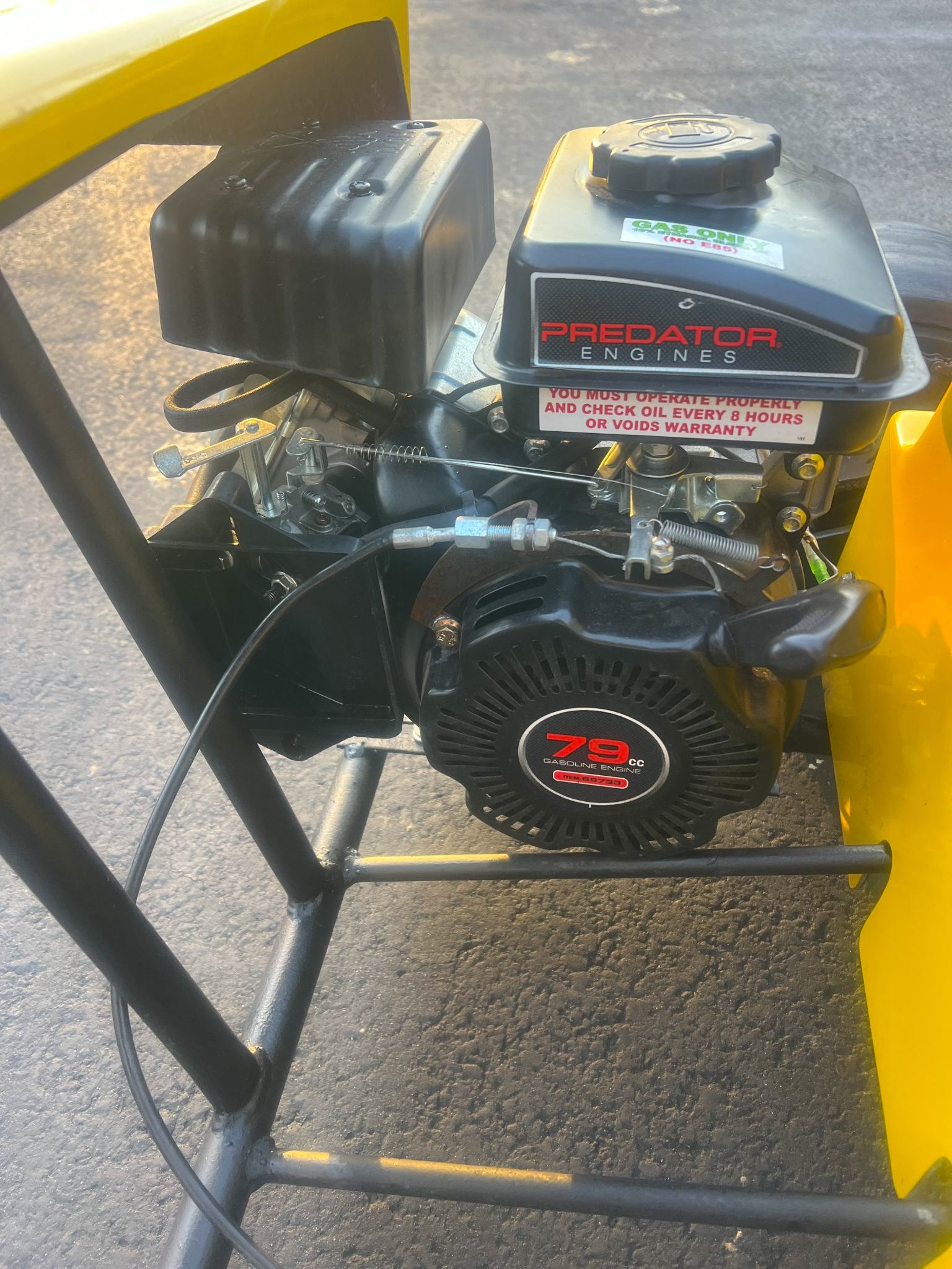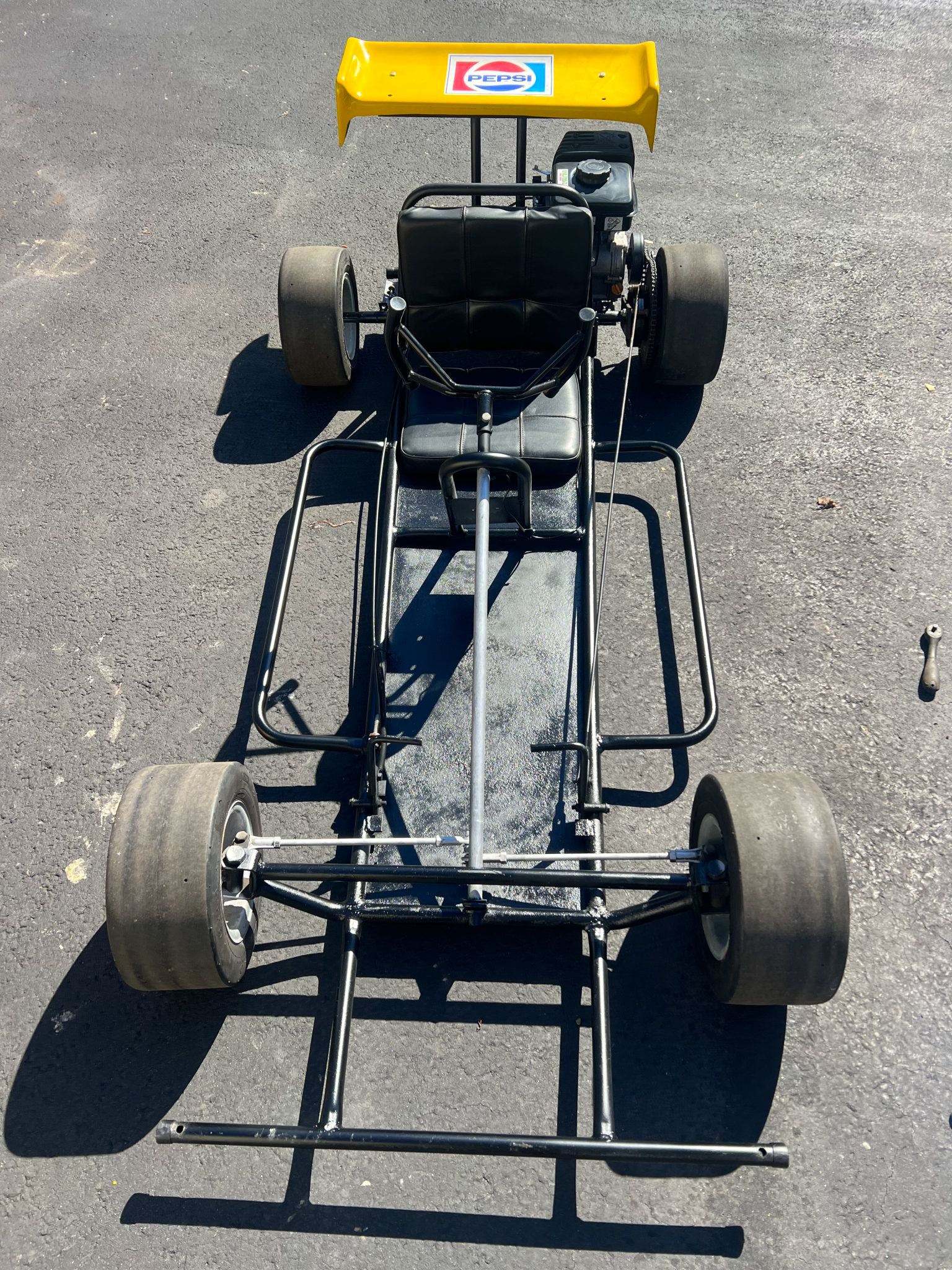 Power comes from a 79cc Predator OHV single-cylinder engine, this engine was swapped in under prior ownership and it’s linked to a centrifugal clutch and chain drive. The cockpit has a single seat trimmed in black vinyl, positioned behind a steering yoke and pedals are mounted above the front axle. The tubular steel frame was repainted in black under current ownership.