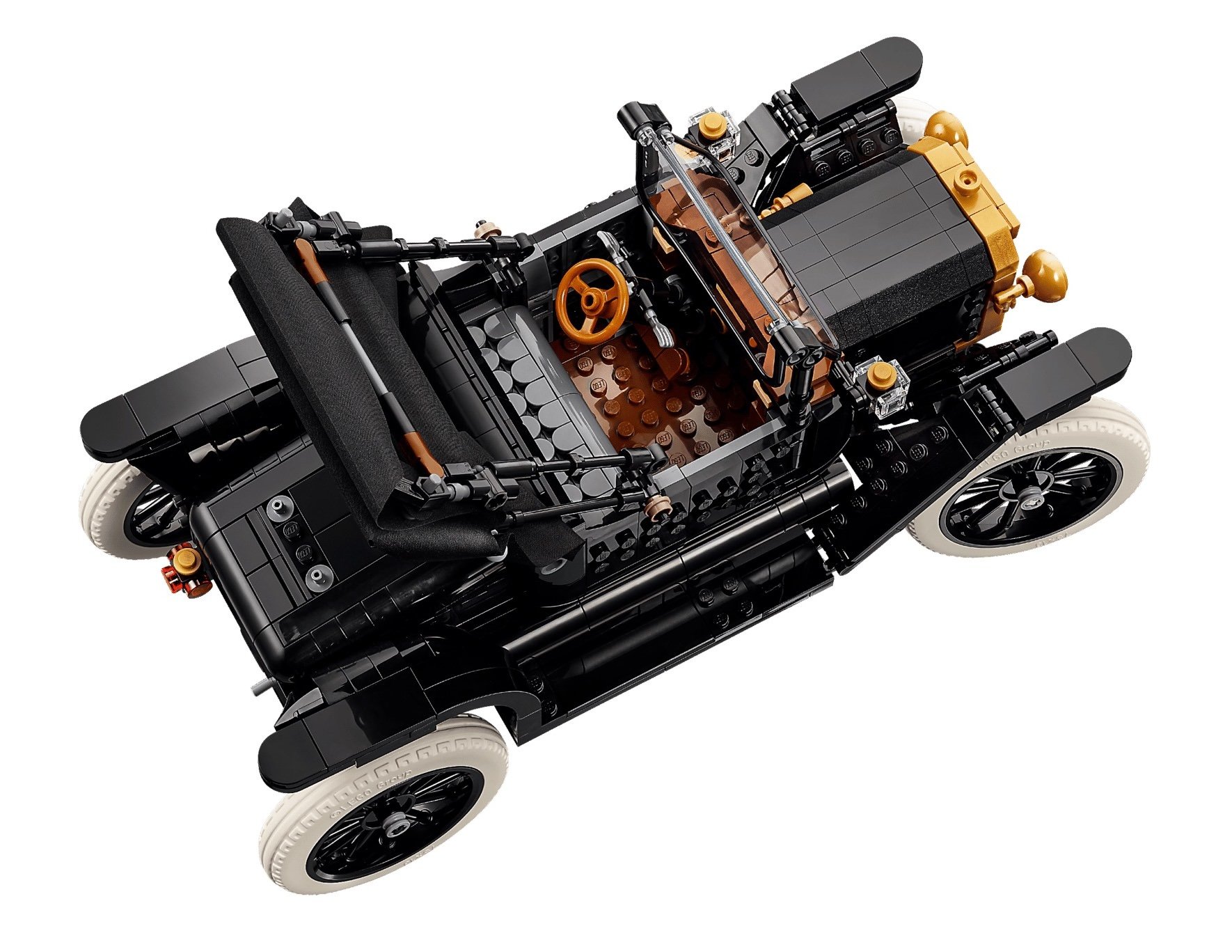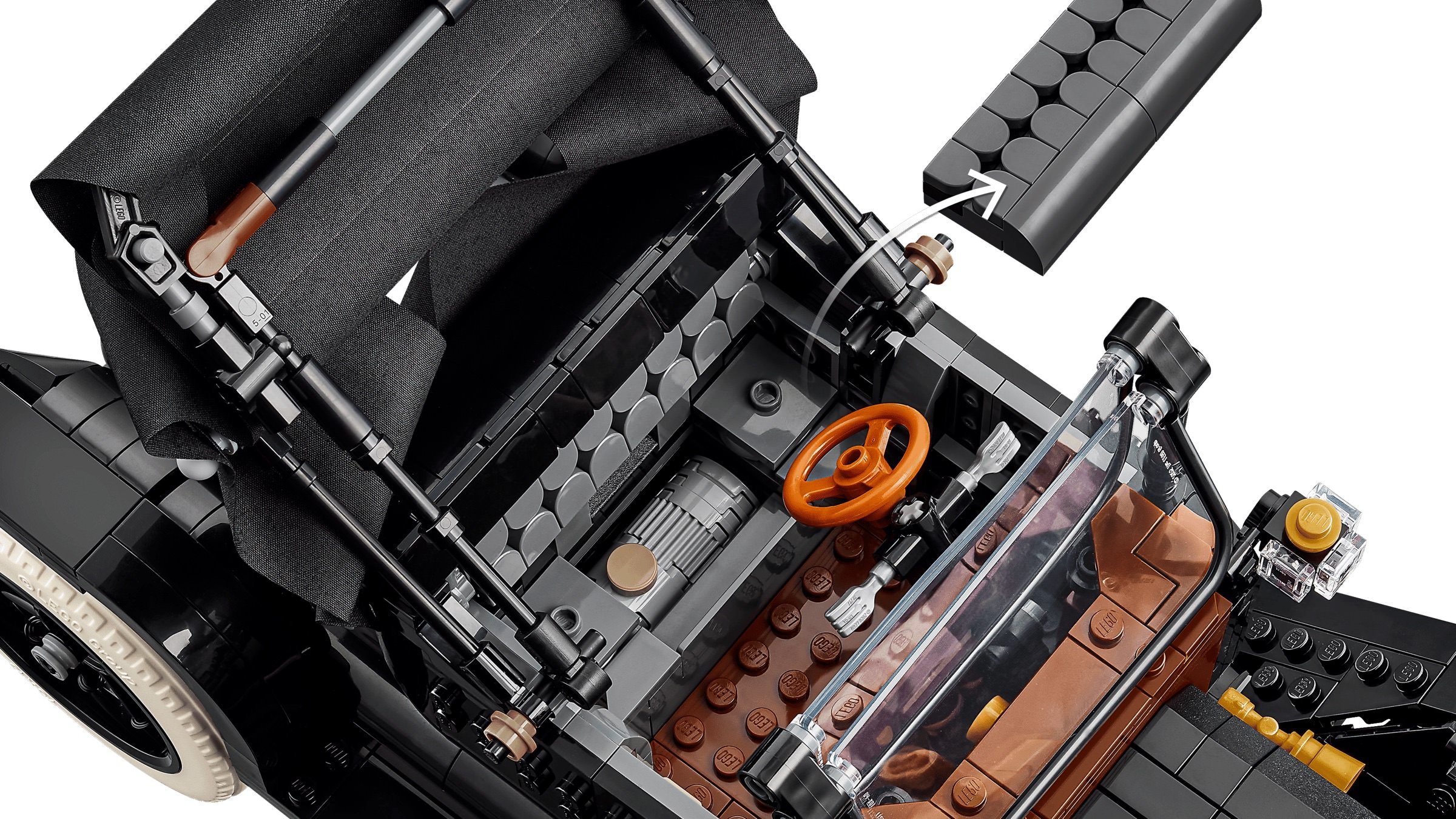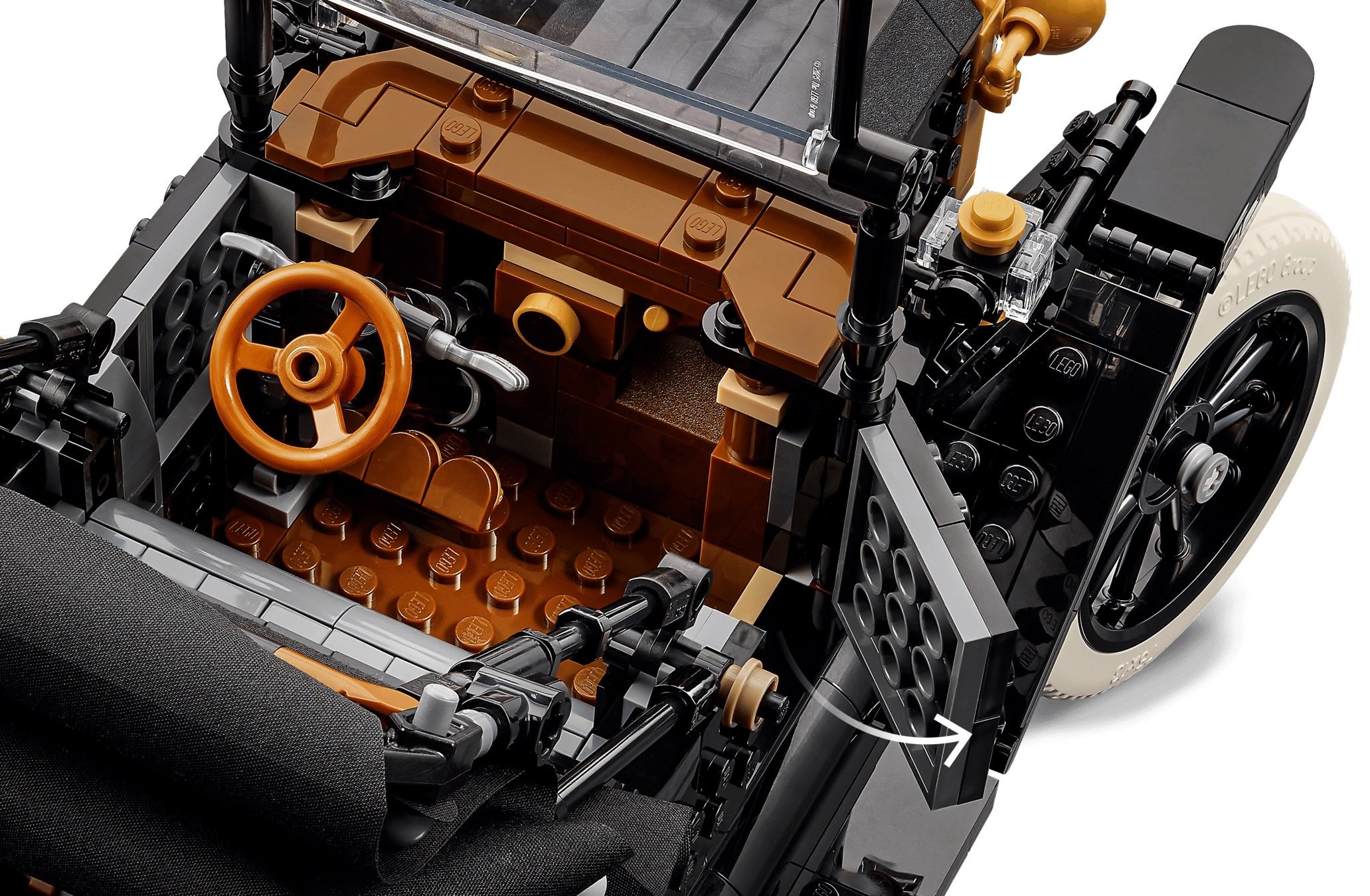 Finished in period-correct black with brass-colored accents, this Lego® model has spoked wheels with narrow white tires, a functional folding fabric roof, and a fold-down split windshield.