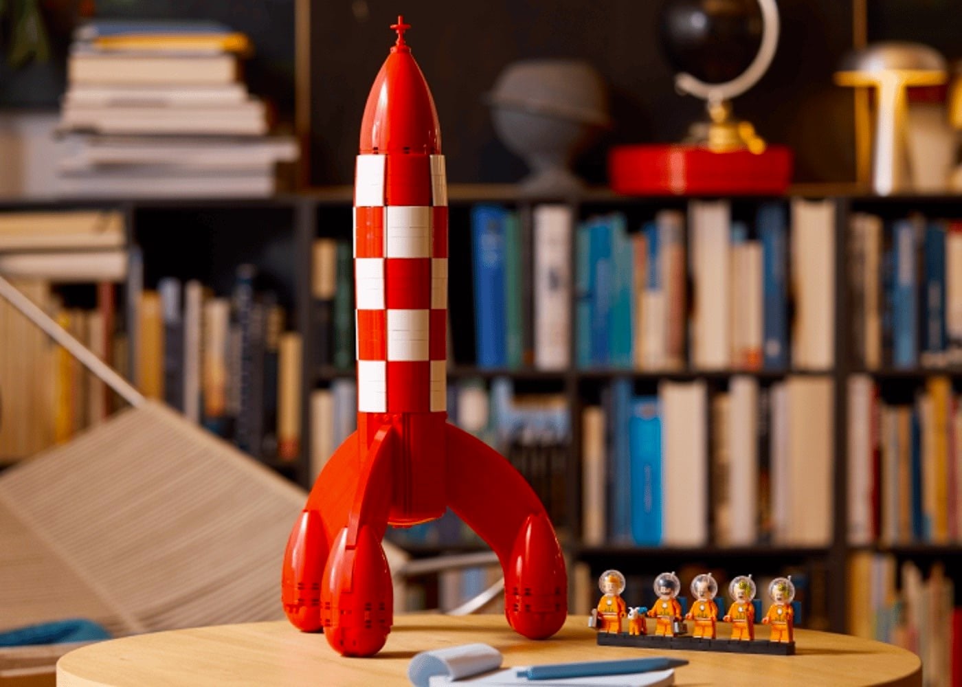 The 1,283-piece set stands over 19.5 inches (49 cm) high, finished in the rocket’s famous checkered pattern, and it has a panel in the cone that can be opened to reveal a detailed control room inside.