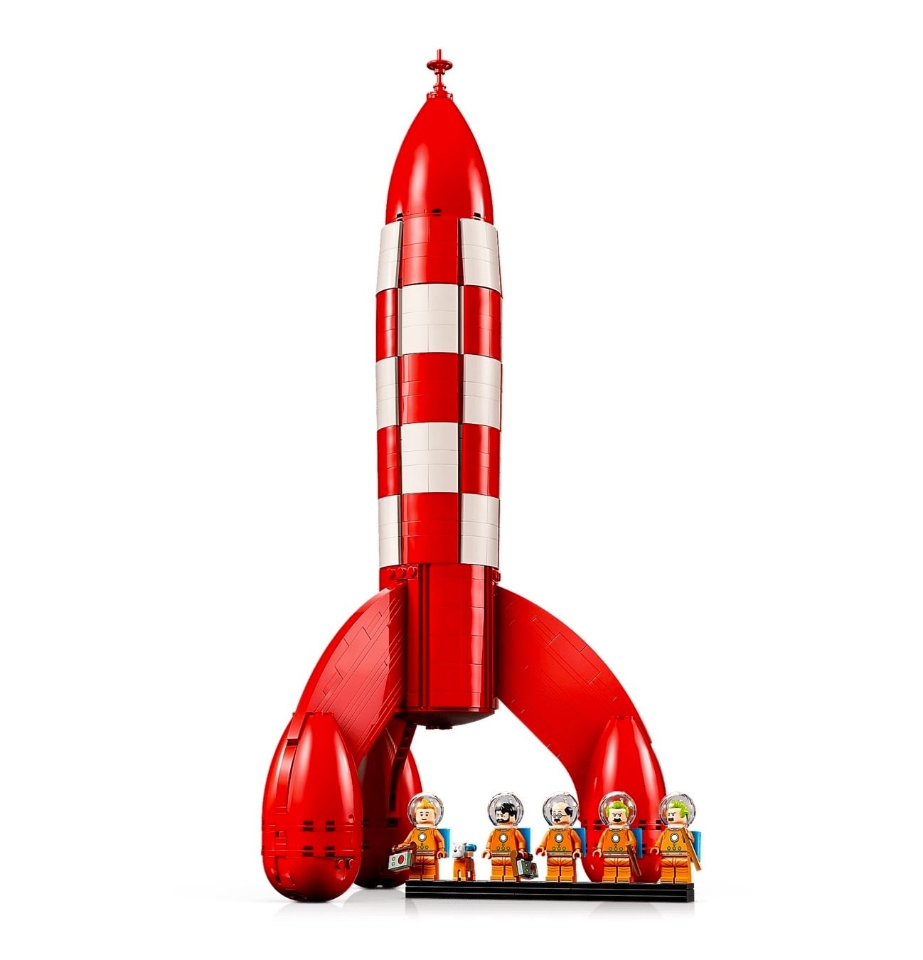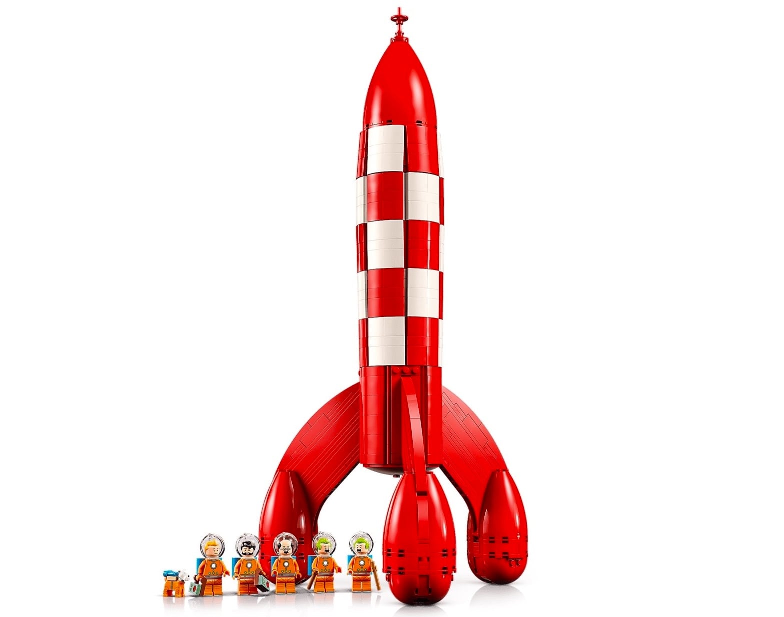 This is the new Lego® Tintin Moon Rocket, it measures in at almost half a meter high (49cm or 1′ 7″) and consists of the main rocket, and a crew of Tintin, Captain Haddock, Professor Cuthbert Calculus, Thomson and Thompson, and of course, Snowy.