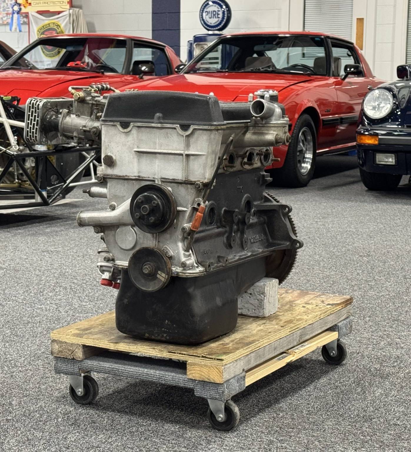 It now turns by hand, and it’s fitted with dual Weber 40 DCOE 18 carburetors, a Lucas distributor, a fuel pump, a thermostat, an oil sump, a flywheel, and a clutch. It also comes with an additional belt, alternator, and some assorted hardware.