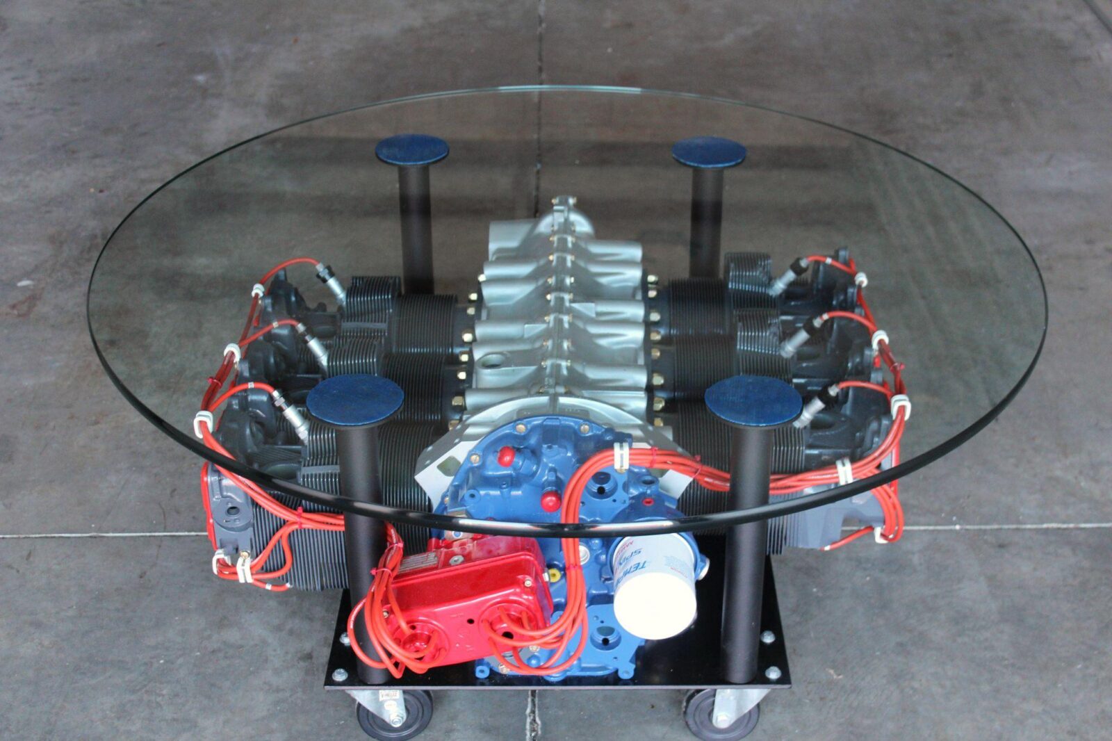 It has a tempered glass top that measures in at 48″ in diameter, and the engine assembly itself is 35″ long, 38″ wide, and 24″ tall. It’s now being offered for sale out of Miami, Florida and you can visit the listing here of you’d like to read more or place a bid.