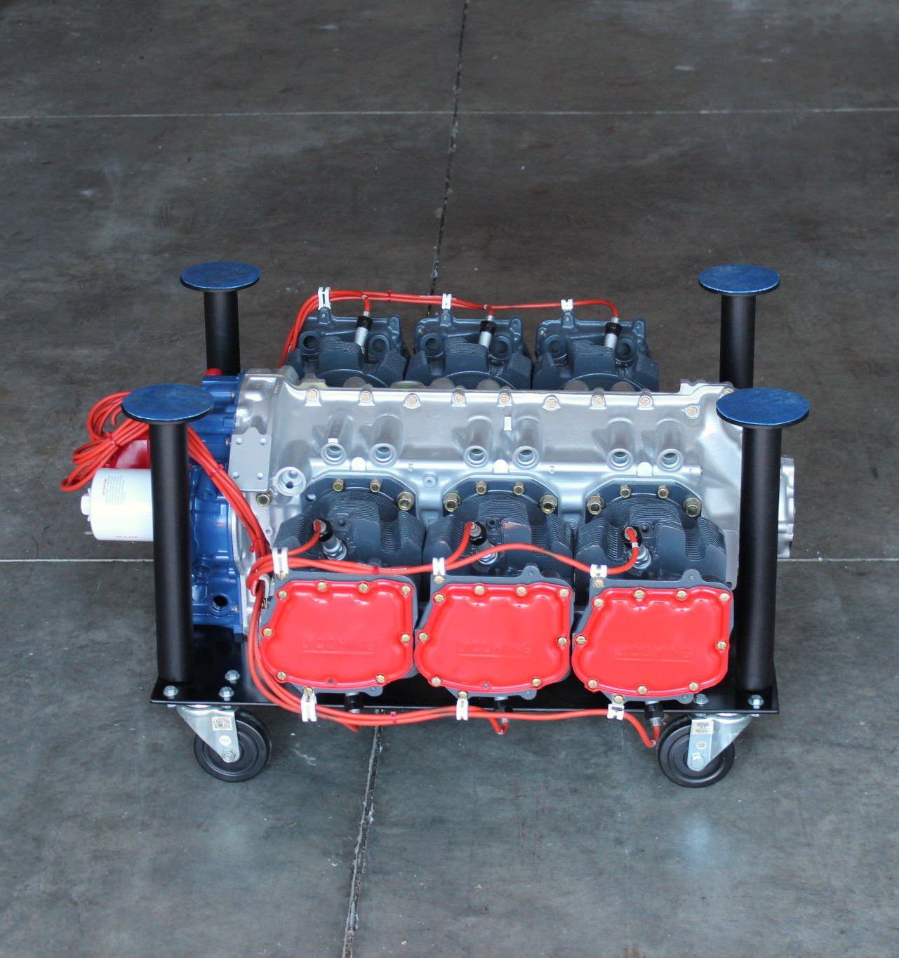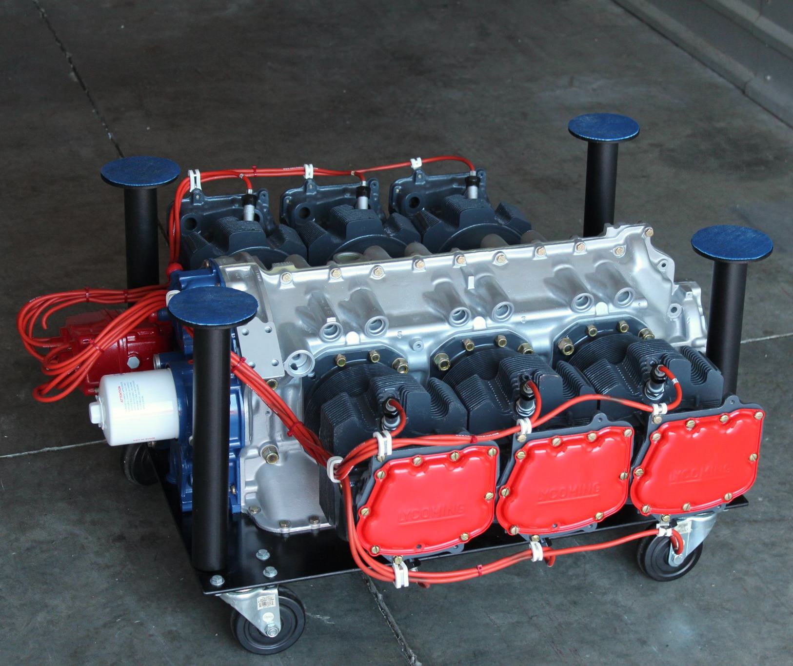 The engine was sourced from a Piper Navajo PA-31 series aircraft, and it’s now been refinished with a silver crankcase, black cylinders, and a blue accessory housing, as well as red valve covers, red ignition wires, and a red magneto housing.