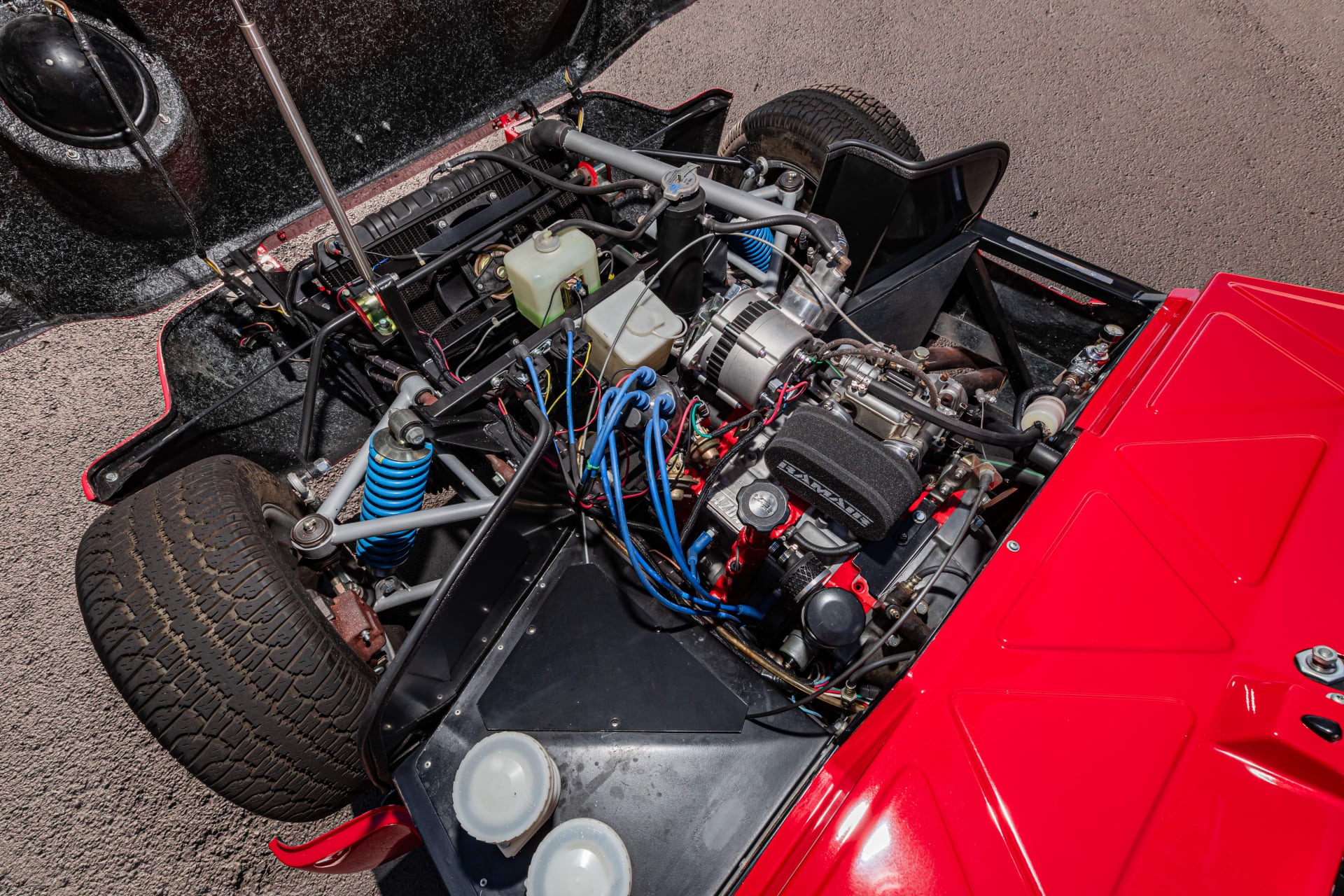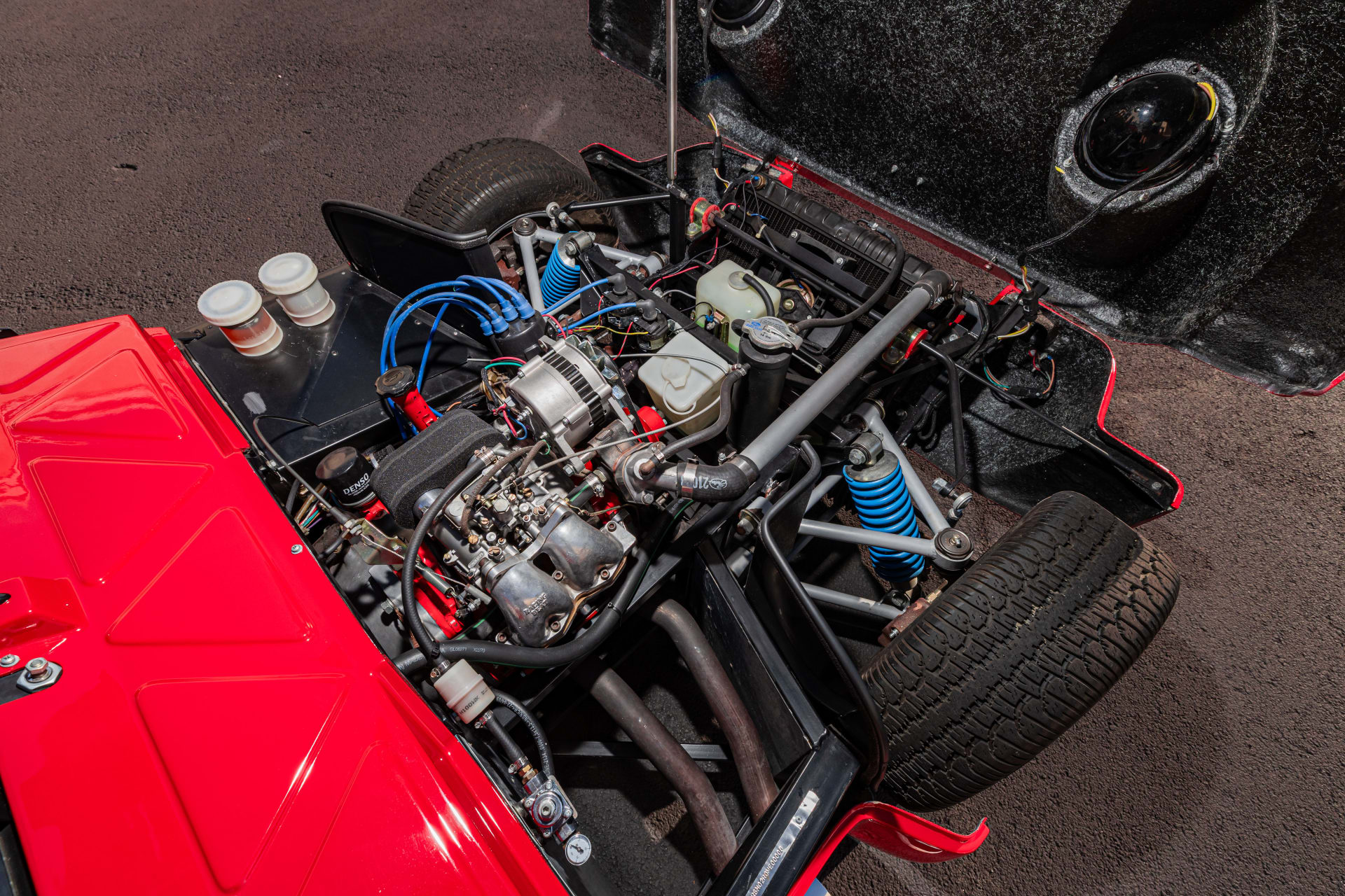 Power is provided by a 1.3 liter Mazda 13B Wankel rotary engine producing a claimed 220 bhp, fed by a Weber 45 DCOE carburetor. This engine sends power back through a Mazda 4-speed manual gearbox and a Mazda axle to the rear wheels.