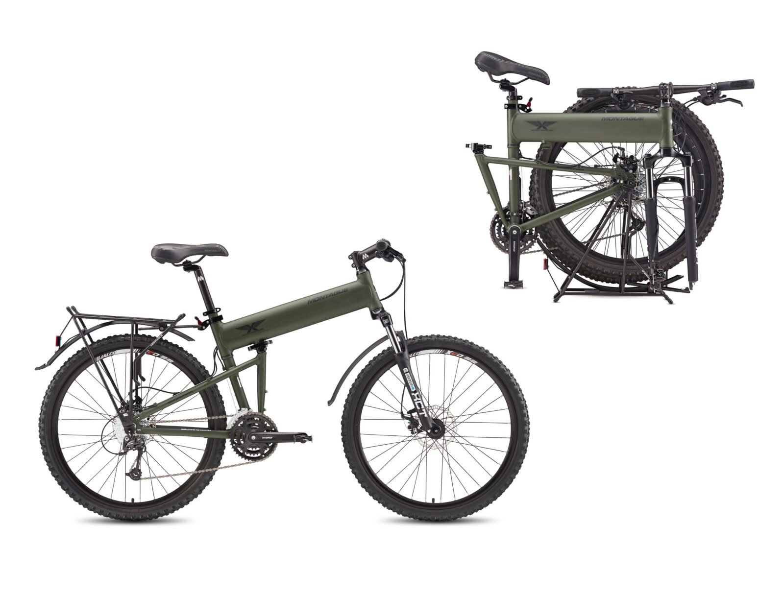 The Paratrooper was built around a full-size hardtail layout and Montague’s “X-frame” folding system. Paratrooper models all use standard mountain-bike wheel sizes (26″ on earlier and some current versions, and 27.5″ on some higher-trim models). The packed down size for Montague’s folding bikes is approximately 36″ × 28″ × 12″ when folded, and the bikes can be unfolded and be ready to ride in a matter of seconds.
