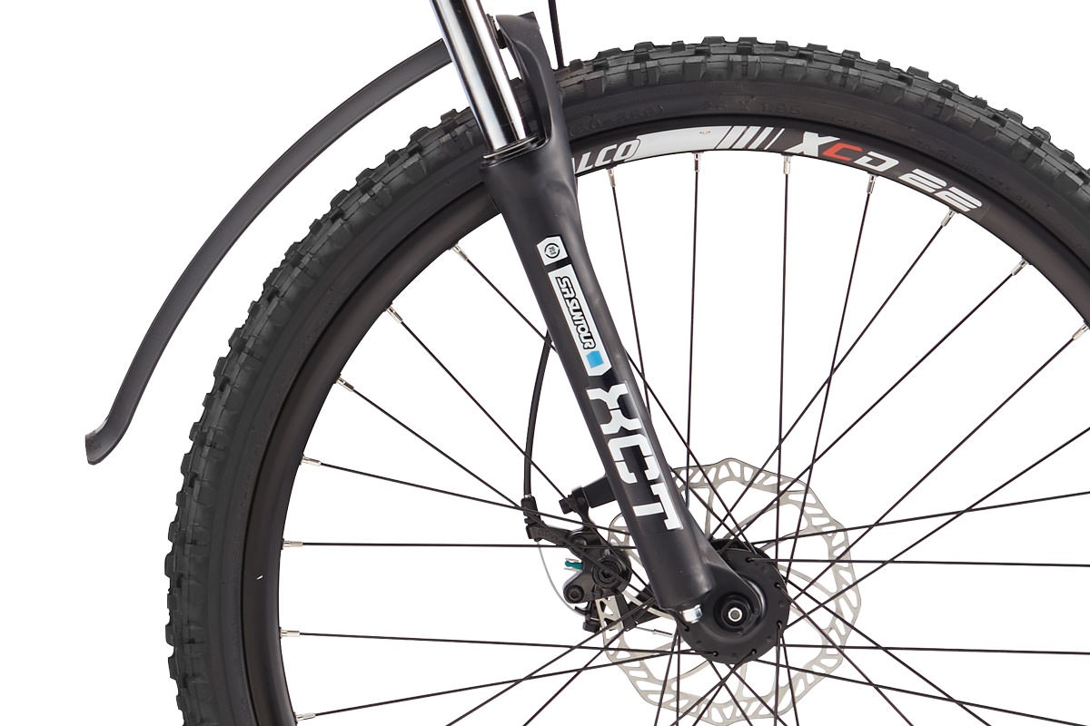 The bike has a strong, lightweight 6061 series aluminum frame. It rides on 26″ alloy wheels shod with Kenda Kinetics tires, alloy handlebars, an alloy stem, a total weight of 32 lbs or 14.5 kgs, and it comes in both medium and large sizes.