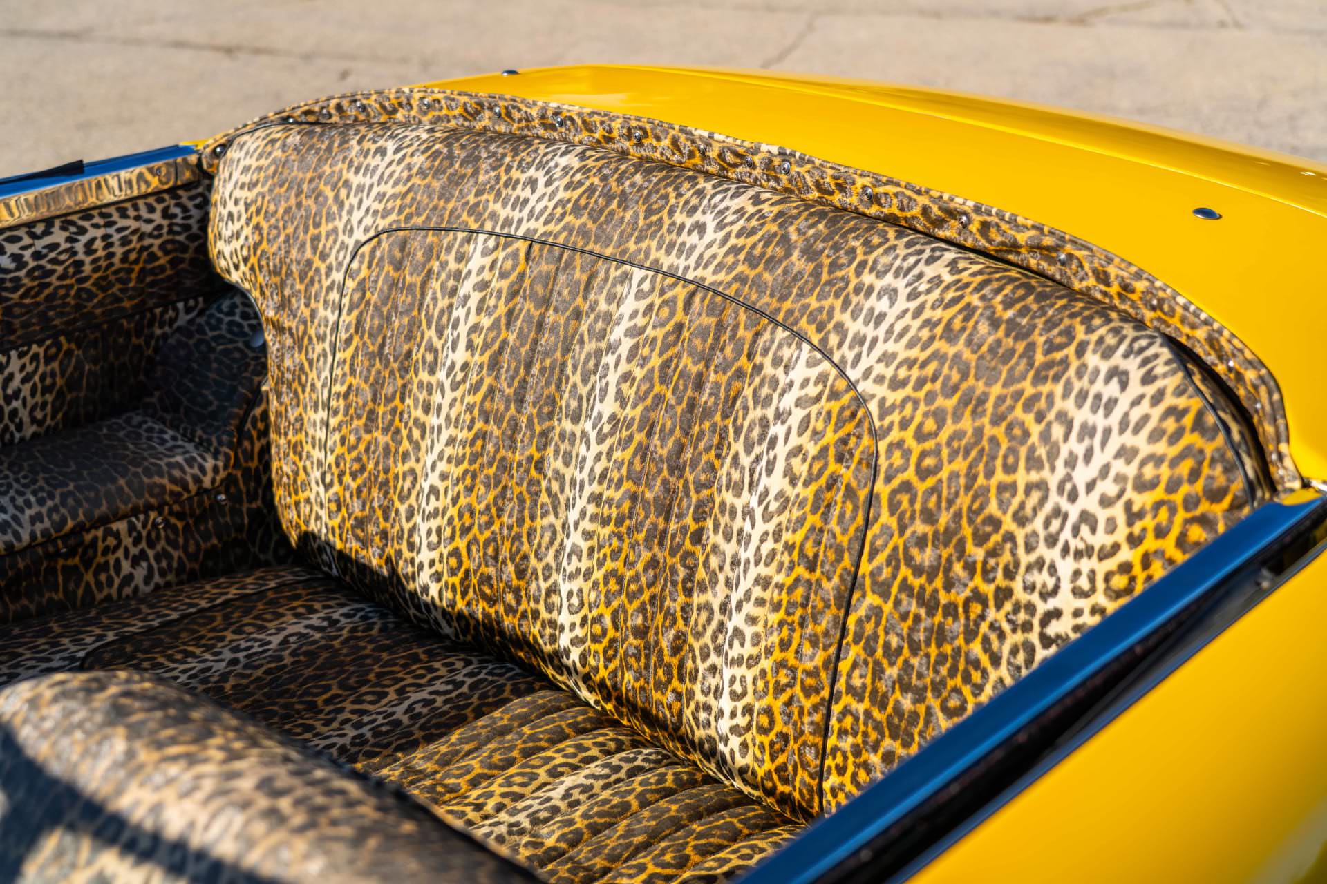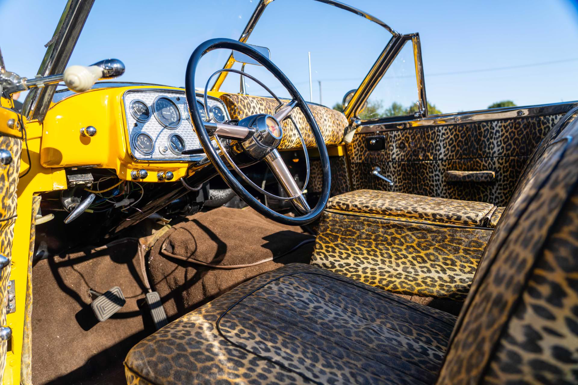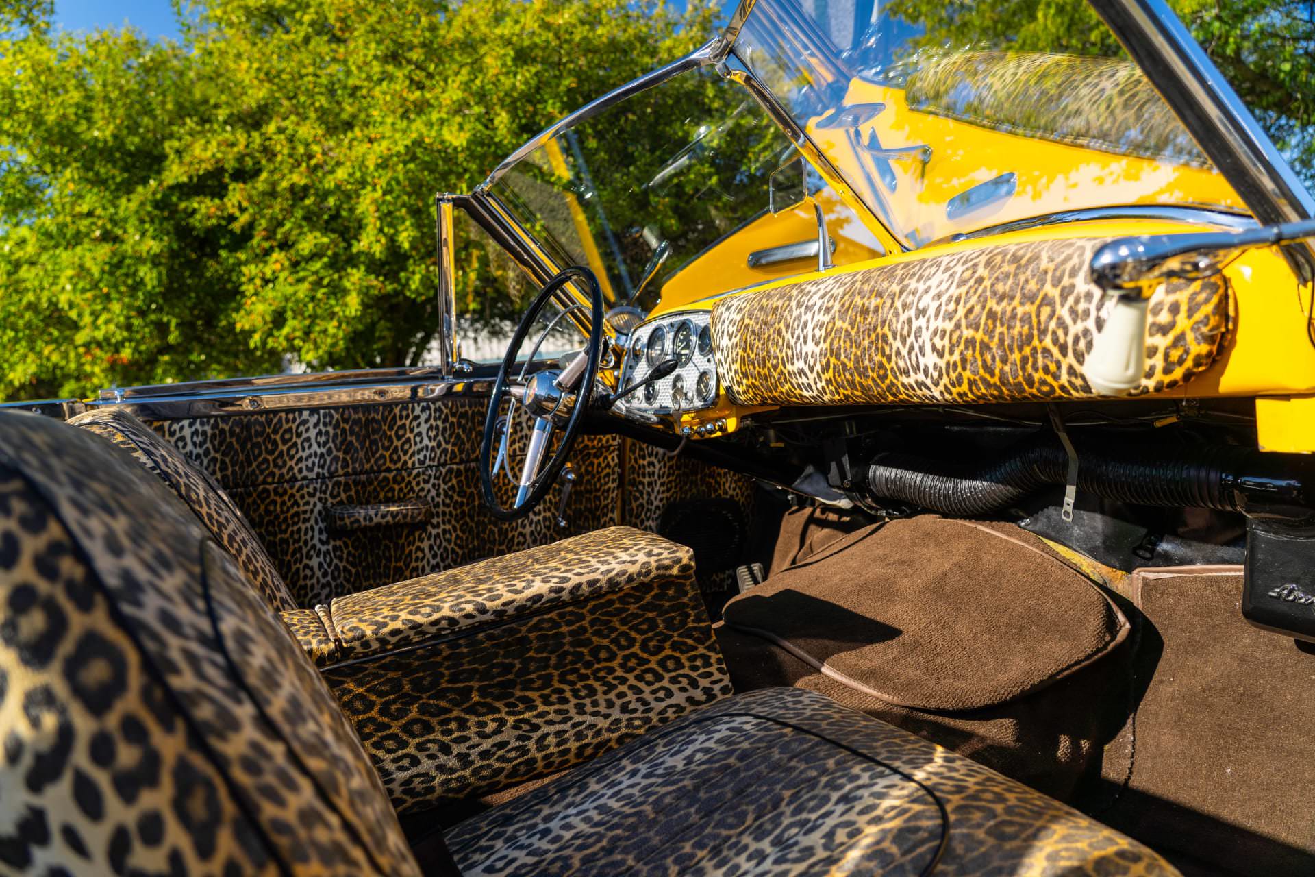 It has four-wheel hydraulic drum brakes, independent front suspension and a live axle rear end, on a 116-inch wheelbase. A black removable soft top is included, and the car is finished in bright yellow over a leopard print interior – a bold choice that Earl Muntz himself would probably have loved.