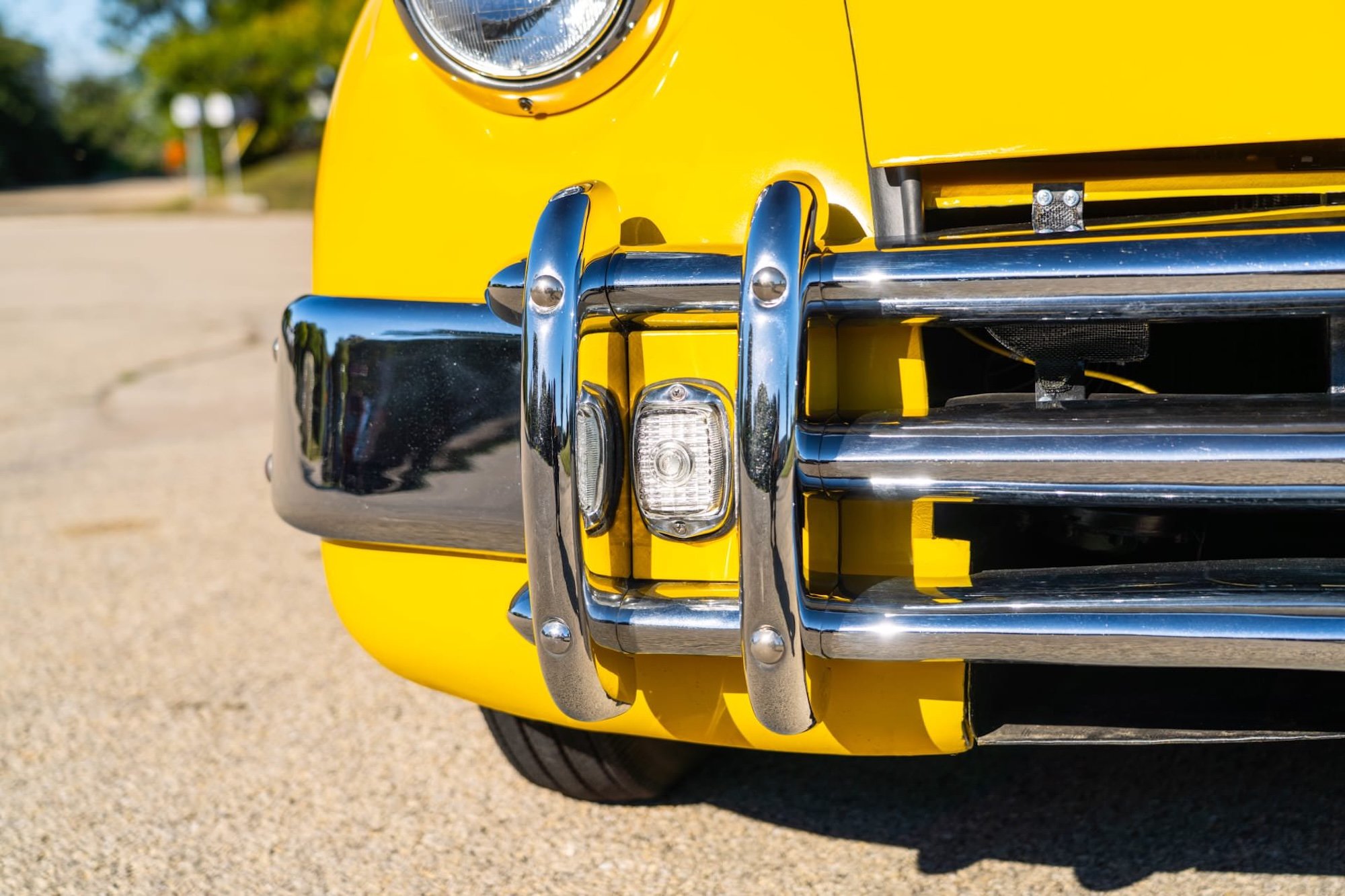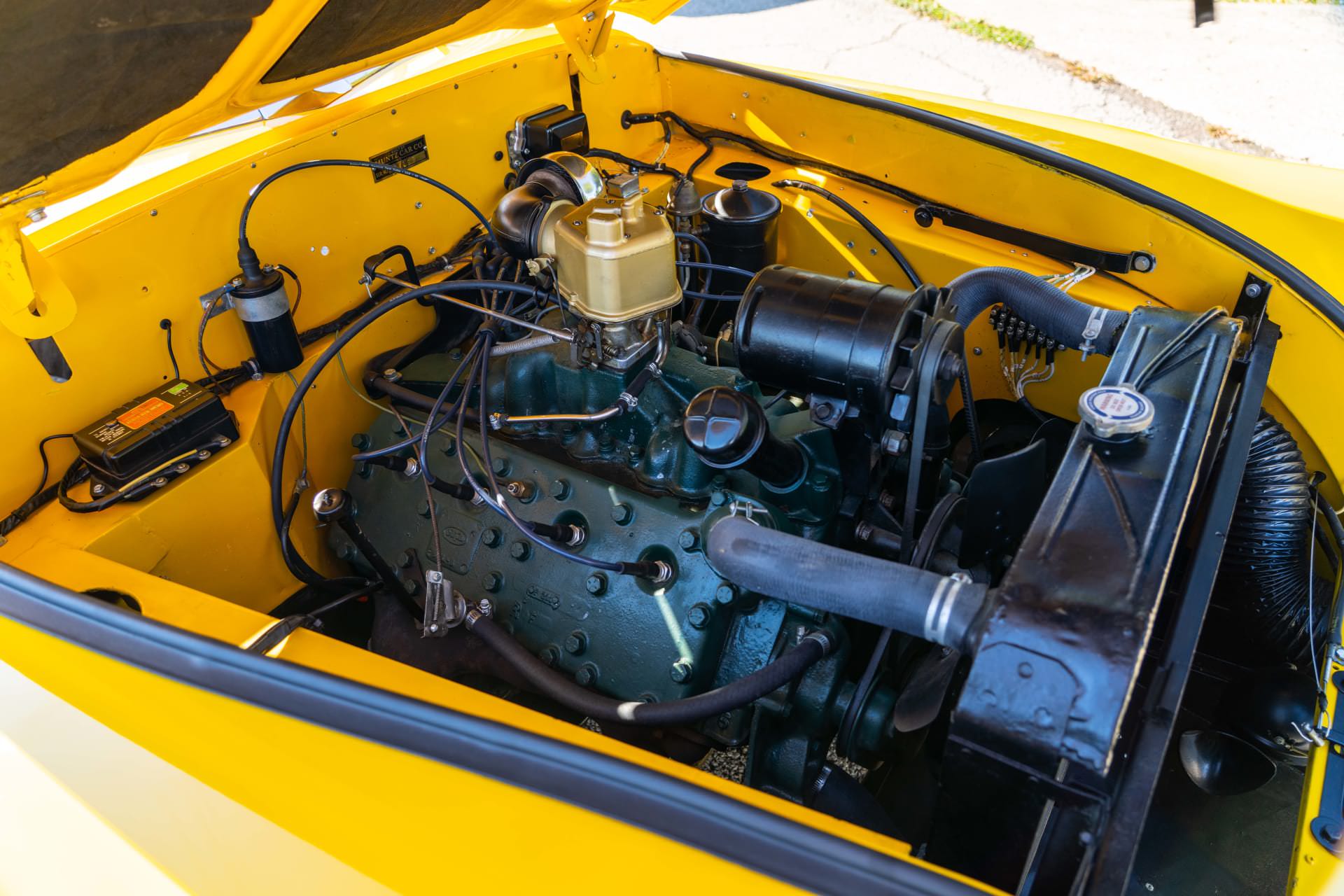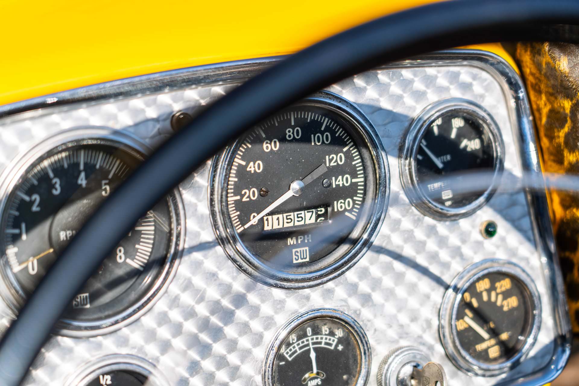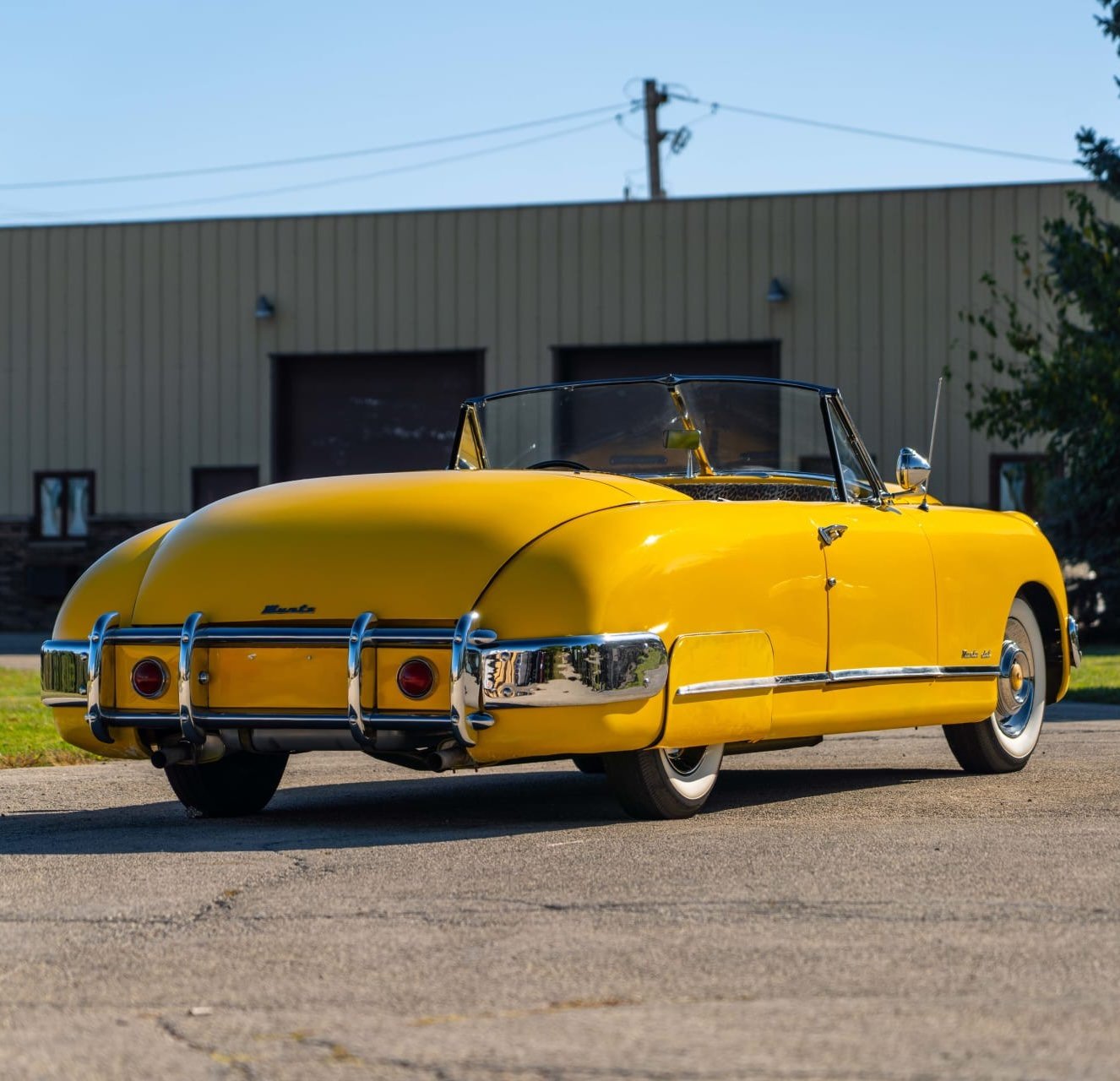 It has four-wheel hydraulic drum brakes, independent front suspension and a live axle rear end, on a 116-inch wheelbase. A black removable soft top is included, and the car is finished in bright yellow over a leopard print interior – a bold choice that Earl Muntz himself would probably have loved.