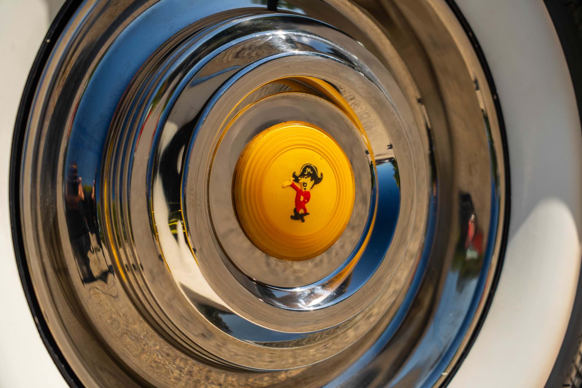 Inside you’ll find an engine-turned aluminum instrument bezel, a center console, a heater, and a padded dashboard. The car also has full-sized wheel covers, whitewall tires, fender skirts, dual spotlight mirrors, and prominent chrome trim.