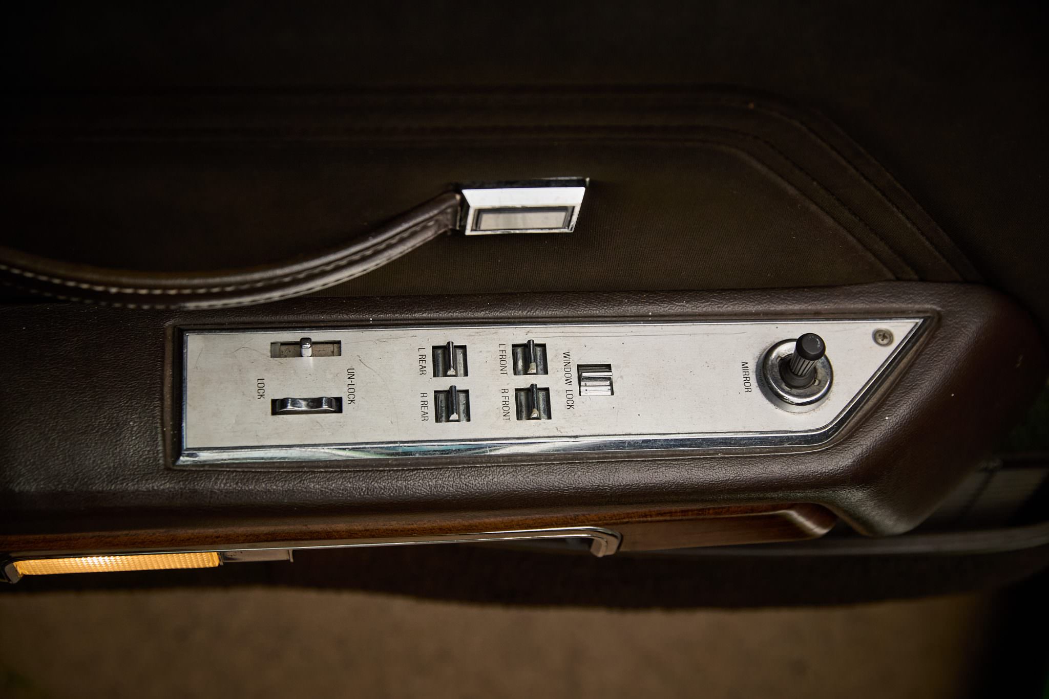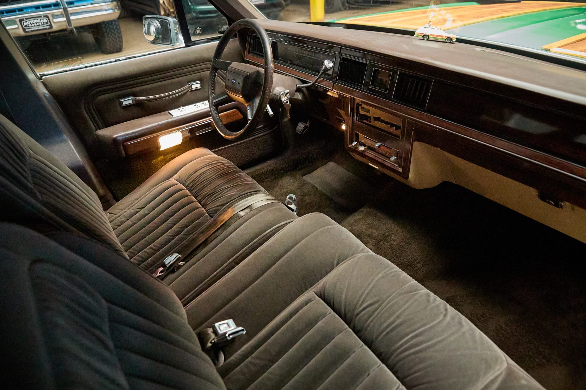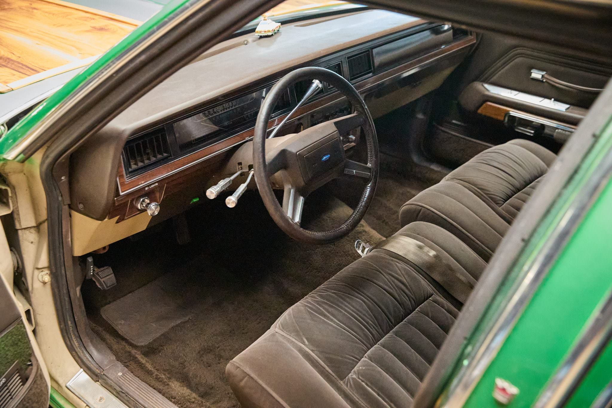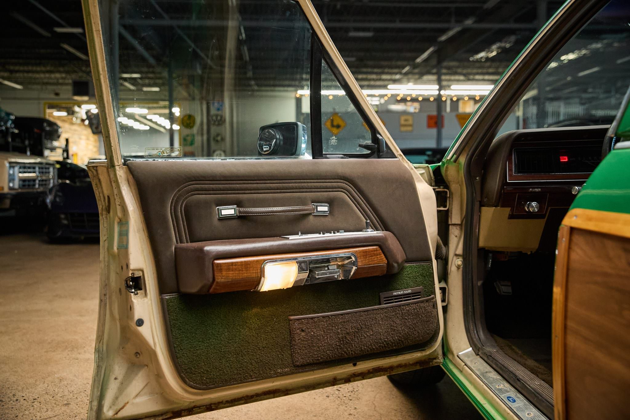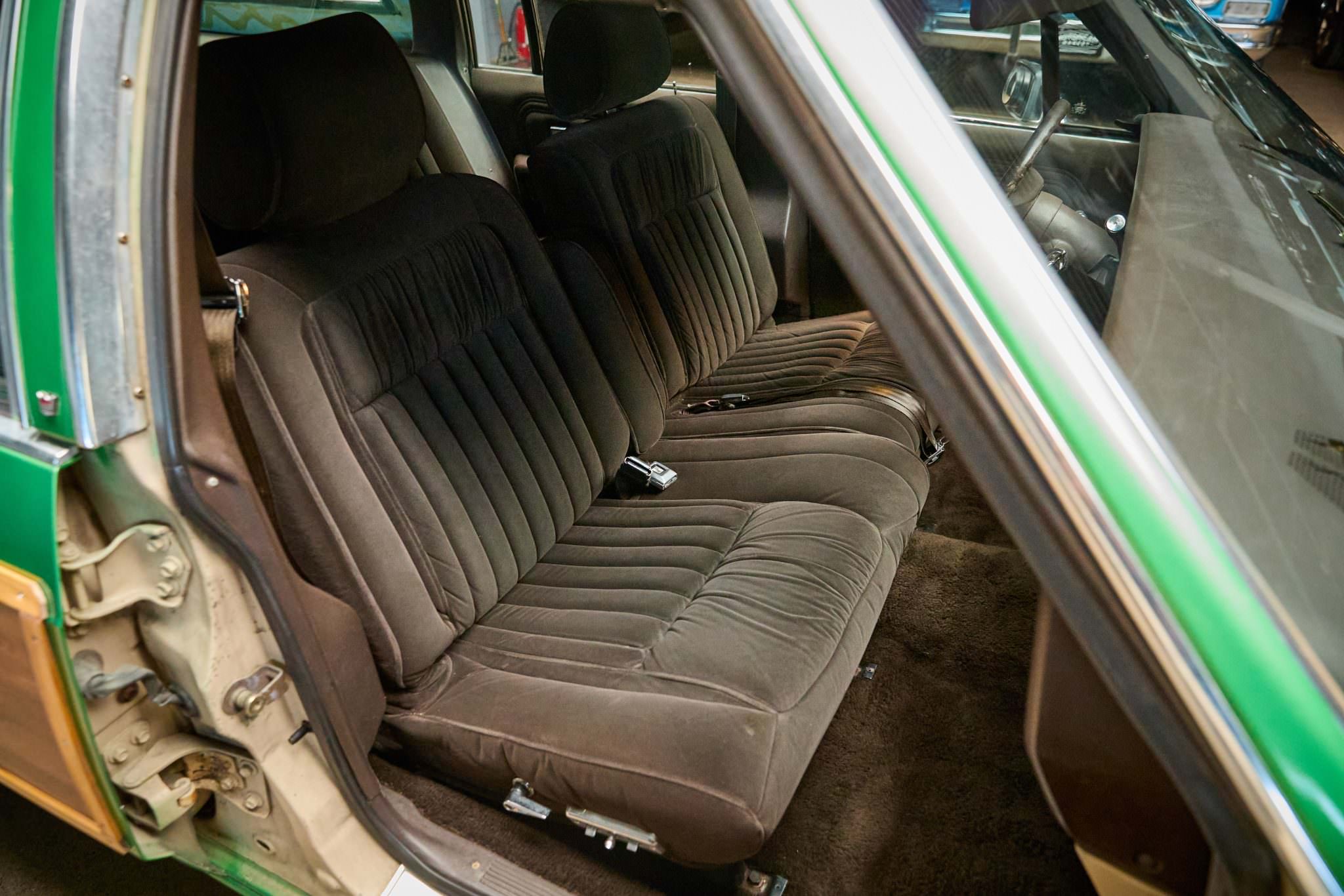 It has now been refinished in green with all that wood paneling to match the movie car, as well as the double stacked lights up front, the quad taillights in the rear, and that unusual grille up front. Inside, the car has brown cloth upholstery and seating for eight, with wood veneer and those distinctive sideways-facing seats in the rear.
