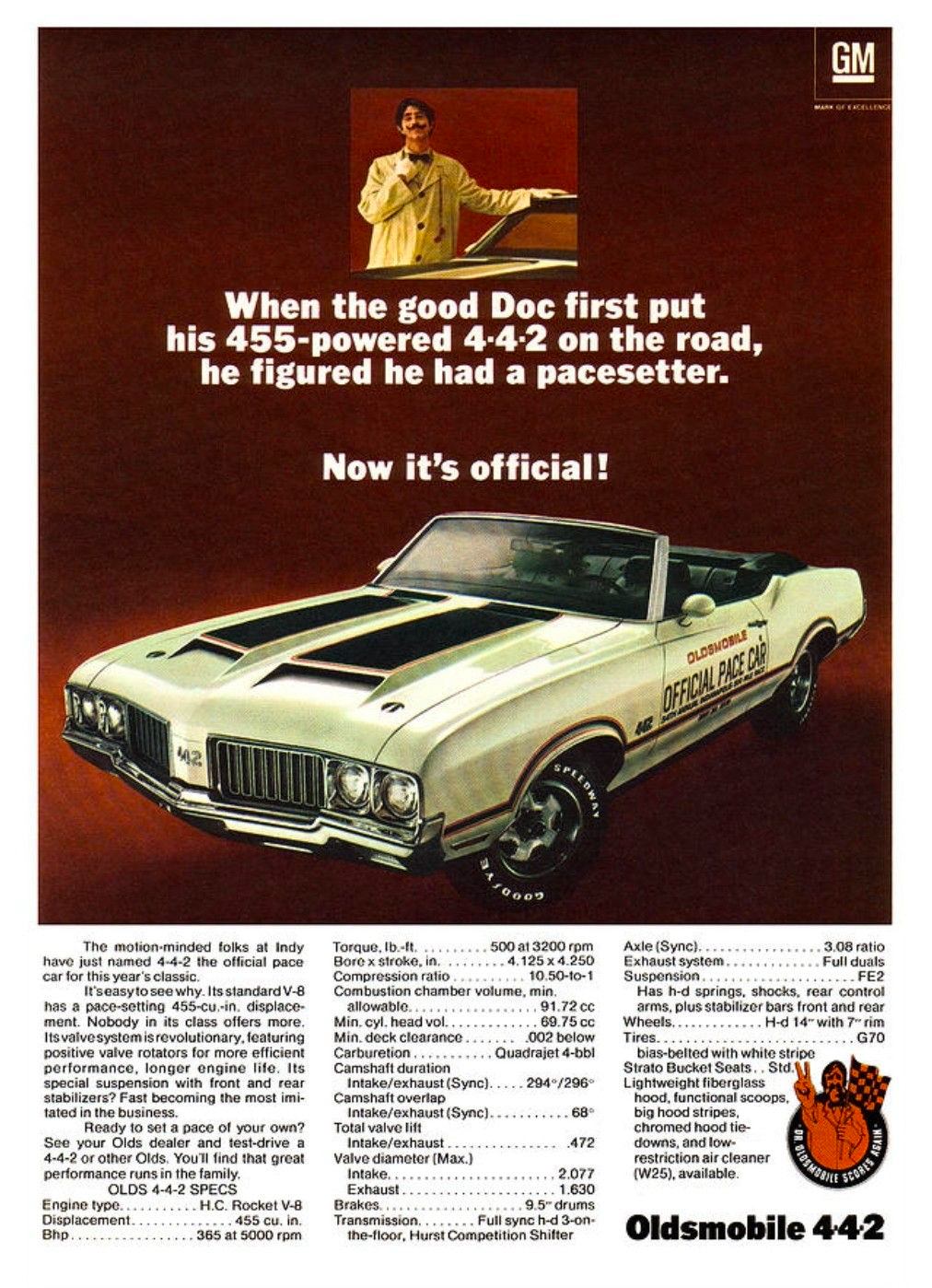 - In 1970, GM’s ban on engines over 400 cubic inches was lifted, allowing Oldsmobile to introduce the 455 cubic inch V8 in the 442. The W-30 version was officially rated at 370 bhp and 500 lb ft of torque, with real figures closer to 400 bhp. These cars featured fiberglass hoods, functional scoops, and could run quarter miles in the low-14s.