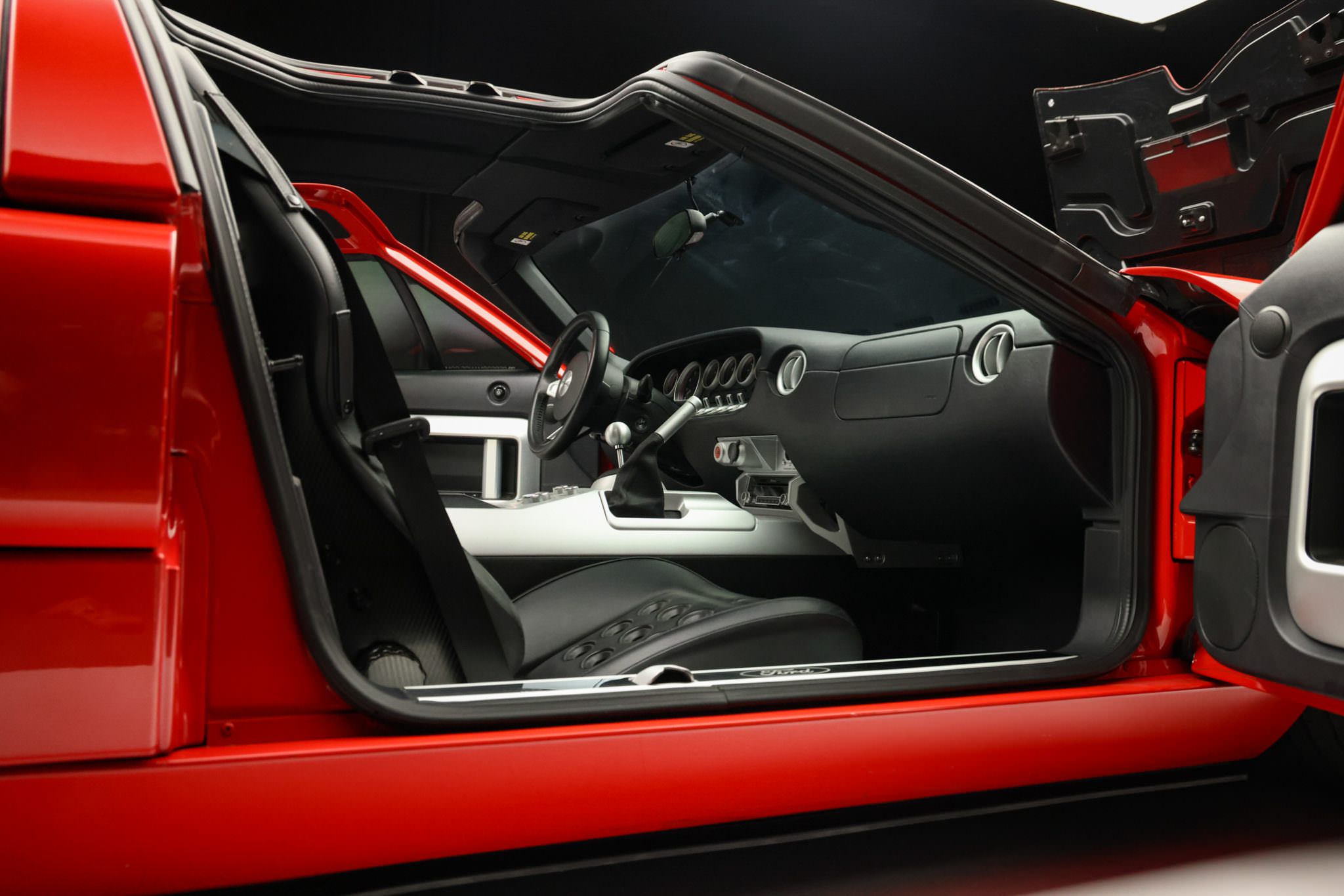 Inside you’ll find Sparco-seats with carbon-fiber shells and GT40-style ventilation grommets, which are paired with rubber-matted aluminum floors and a center-tunnel console with rotary HVAC controls.