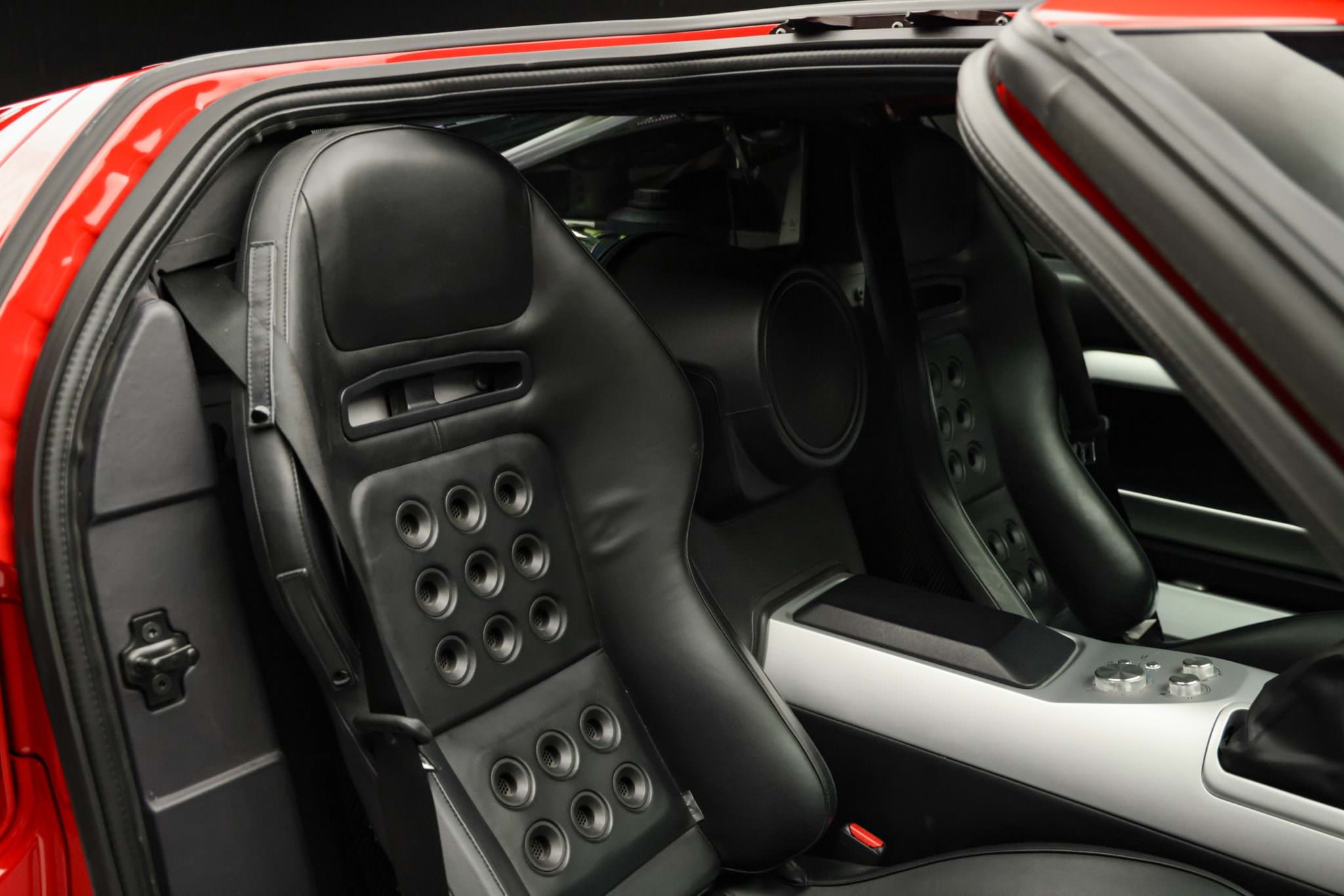 Amenities include a McIntosh CD stereo, air conditioning, push-button ignition, and remote keyless entry. The GT40-inspired gauge layout retains its central tachometer and 220 mph speedometer, and a digital odometer.