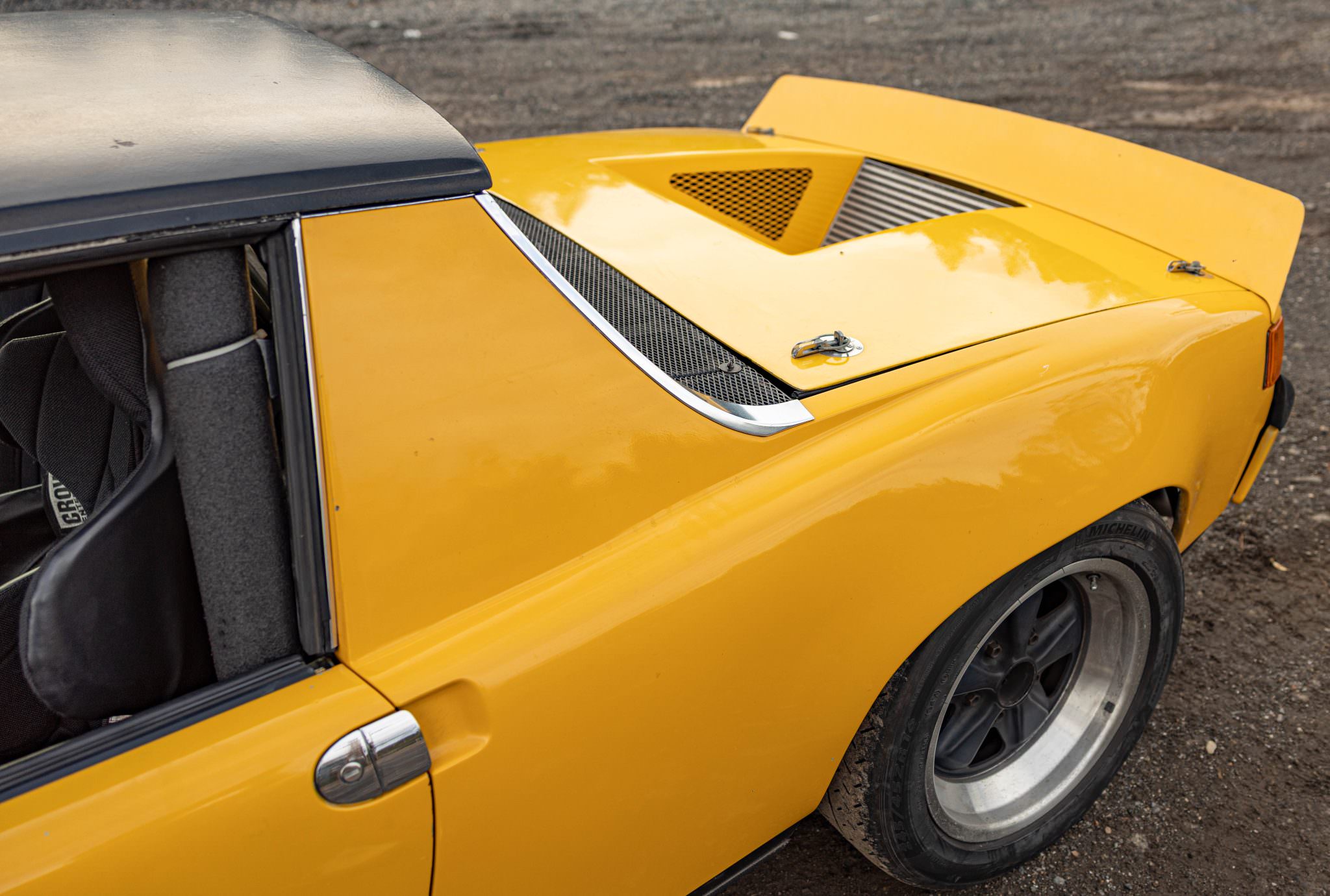 This 1971 Porsche 914 started life as a regular four-cylinder car before being re-engineered by Richard Clewett of Clewett Engineering with a turbocharged Porsche 911 flat-six built from a 3.0 liter case and 3.3 liter pistons. It’s finished in yellow paint with a black removable Targa top, and the exterior shows typical signs of age and some track use.