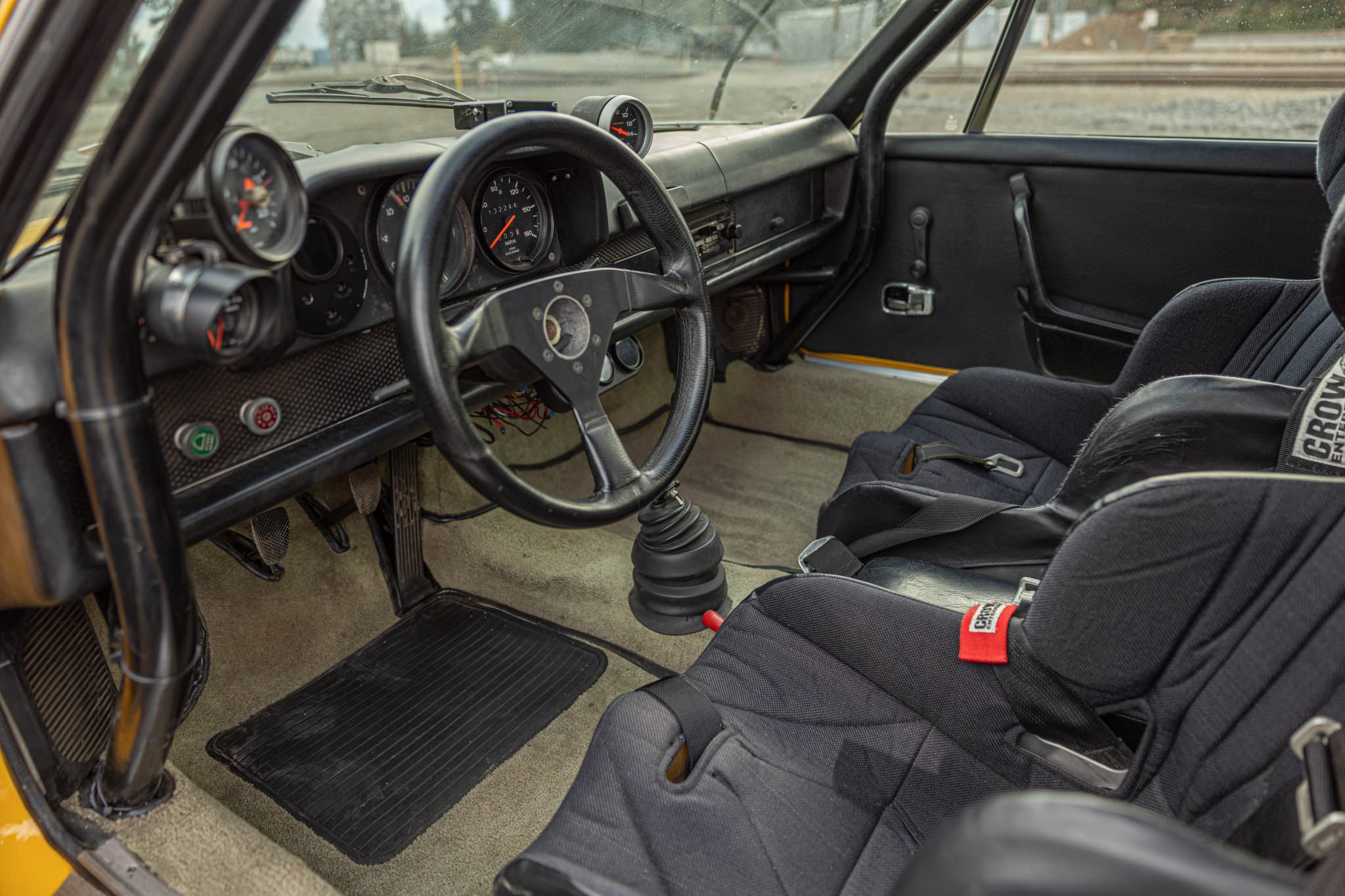 Underneath, the car has G-body 911 suspension parts and a comprehensive set of upgrades including adjustable Bilstein rear coilovers, Sway-A-Way torsion bars, reinforced mounting points, and a larger front sway bar. It’s fitted with 911SC vented rotors and calipers at all four corners, with Michelin Pilot Sport Cup tires on 16 inch Fuchs-style wheels.