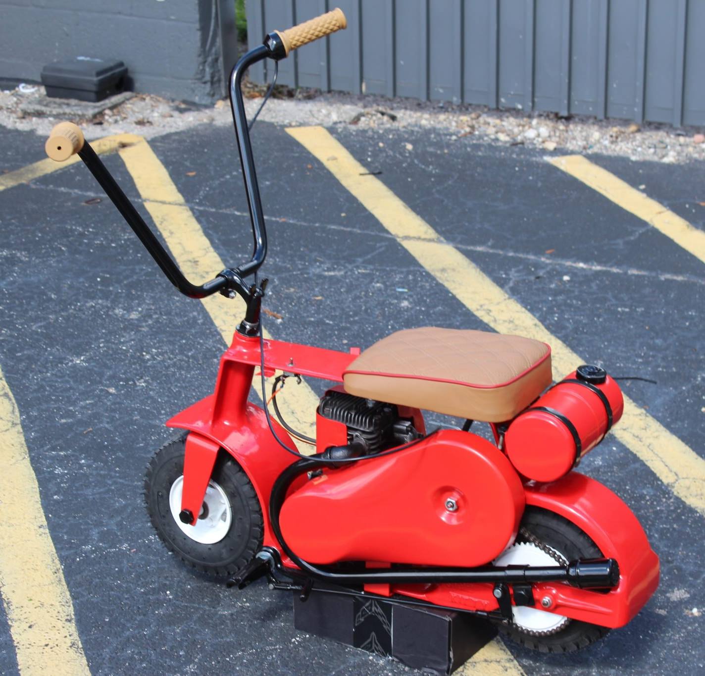 The minibike you see here is an original Projects Unlimited Skat Kitty from 1965. It has been fully refurbished, with the frame now powdercoated in red, the Tecumseh four-stroke single and centrifugal clutch refreshed, and the solo seat reupholstered.