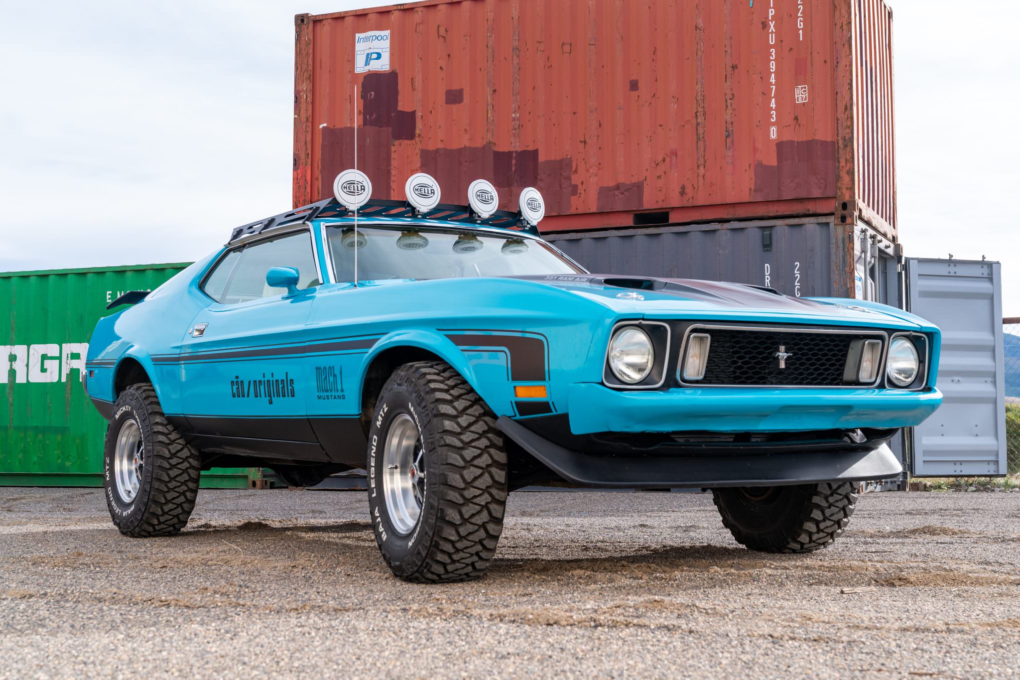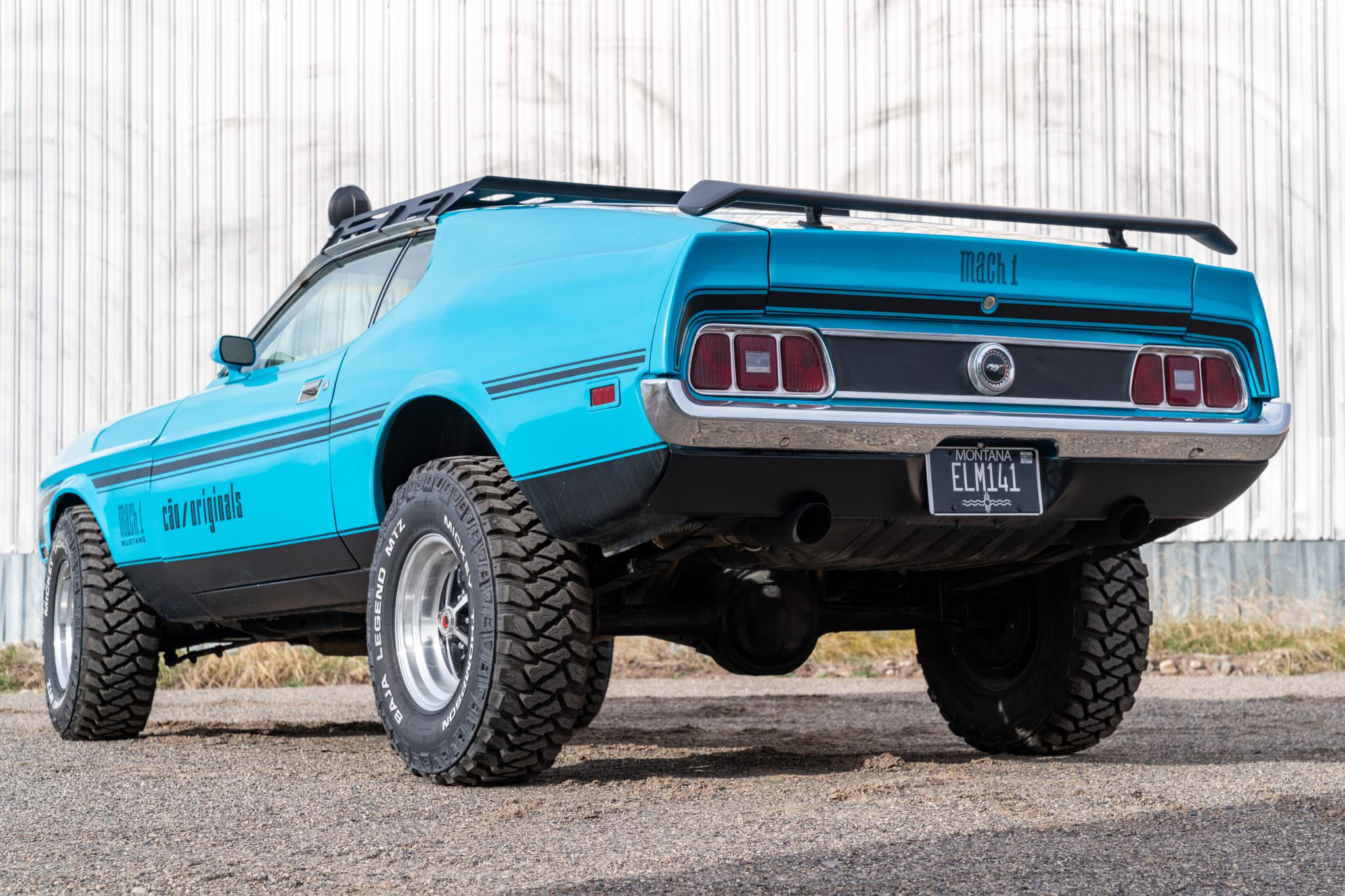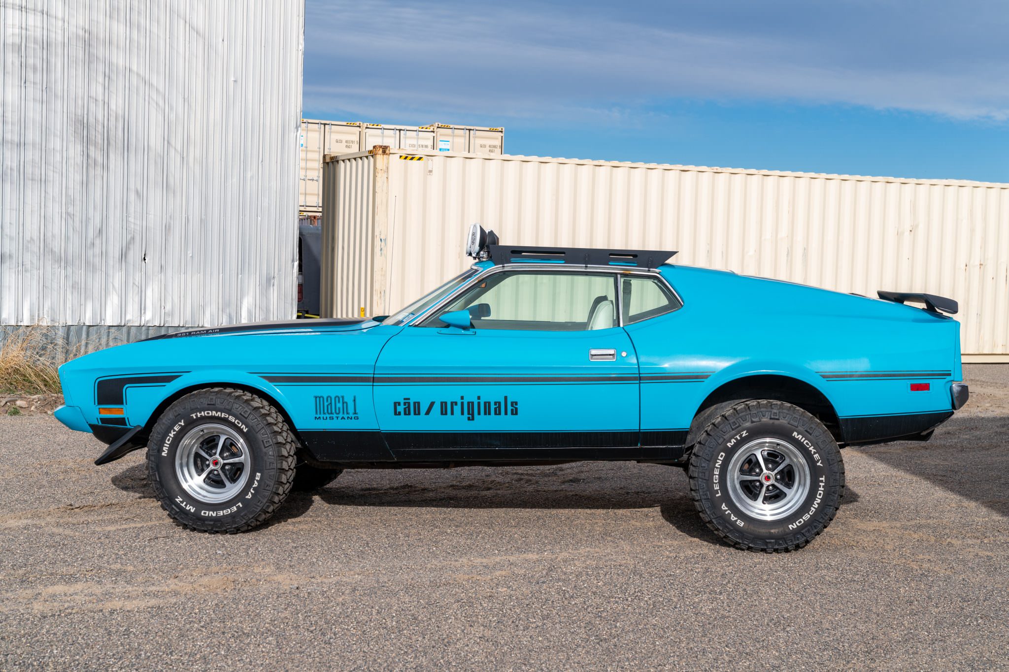 - This 1973 Mustang SportsRoof was rebuilt as a safari-style car with a lifted suspension, 31×10.50 Mickey Thompson tires, and 15″ Magnum 500-style wheels. It runs a 351 V8 backed by a 3-speed automatic. Added gear includes a roof rack with Hella spotlights, as well as upgraded suspension, braking, and steering systems.