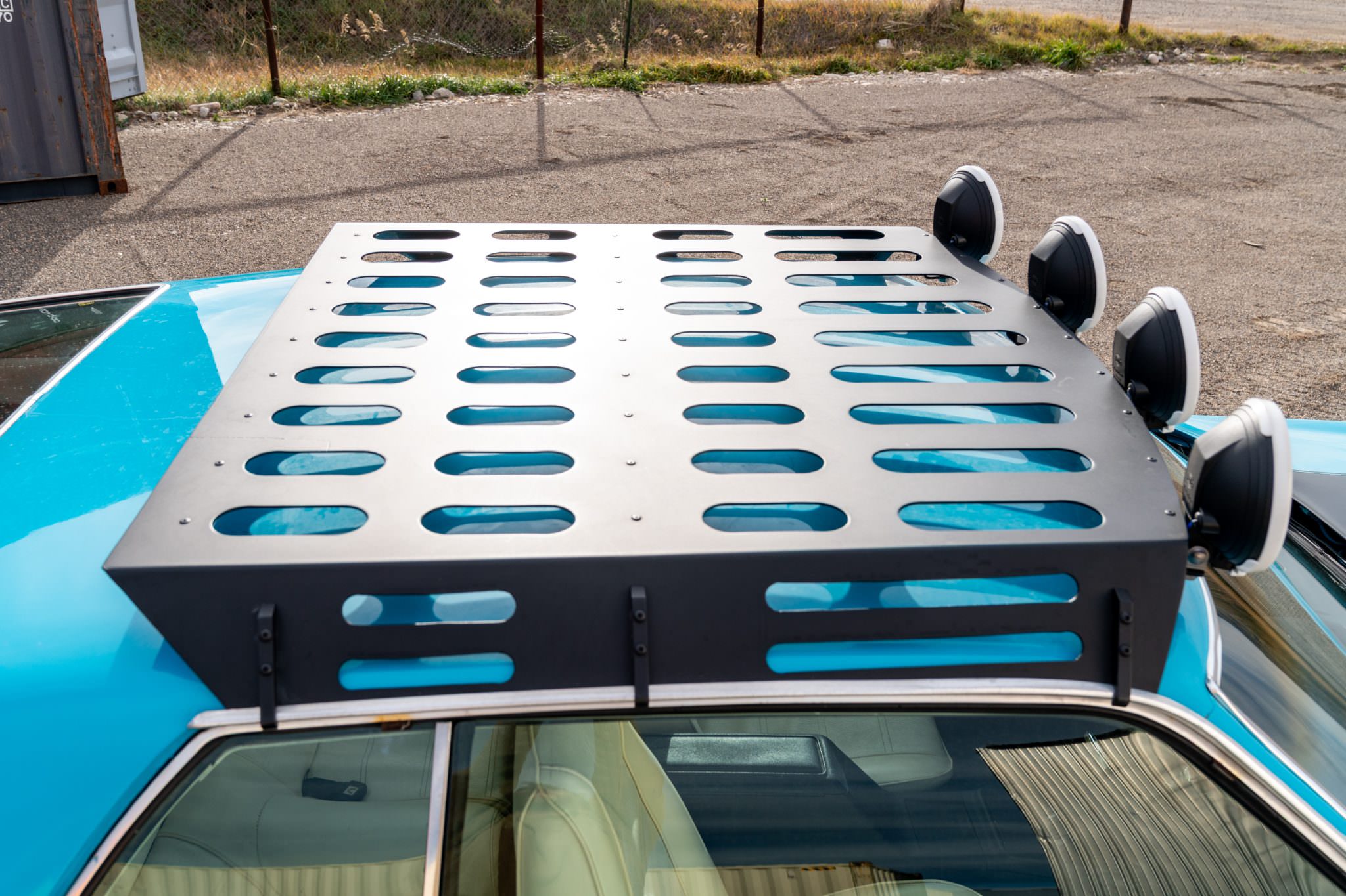 The car is now powered by a 351 cubic inch V8 which sends power back through a 3-speed automatic transmission to the rear wheels. The suspension was completely rebuilt for the safari conversion, and a roof rack and Hella driving lights have been added to complete the look.