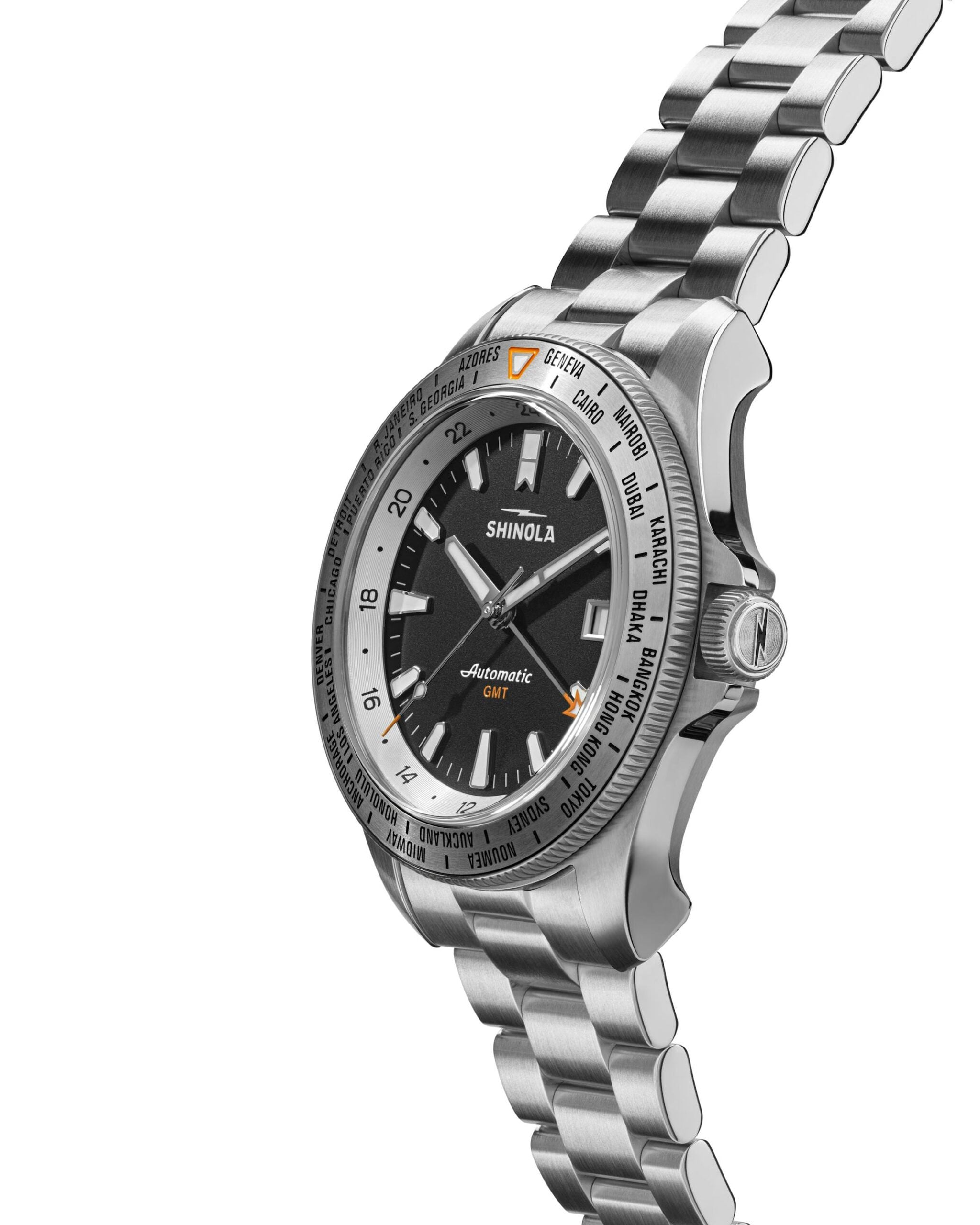 This is the new Shinola GMT World Timer, each one is built in Detroit using Swiss parts, including a Sellita SW330-2 automatic mechanical movement offering 25 jewels and a 42+ hour power reserve.