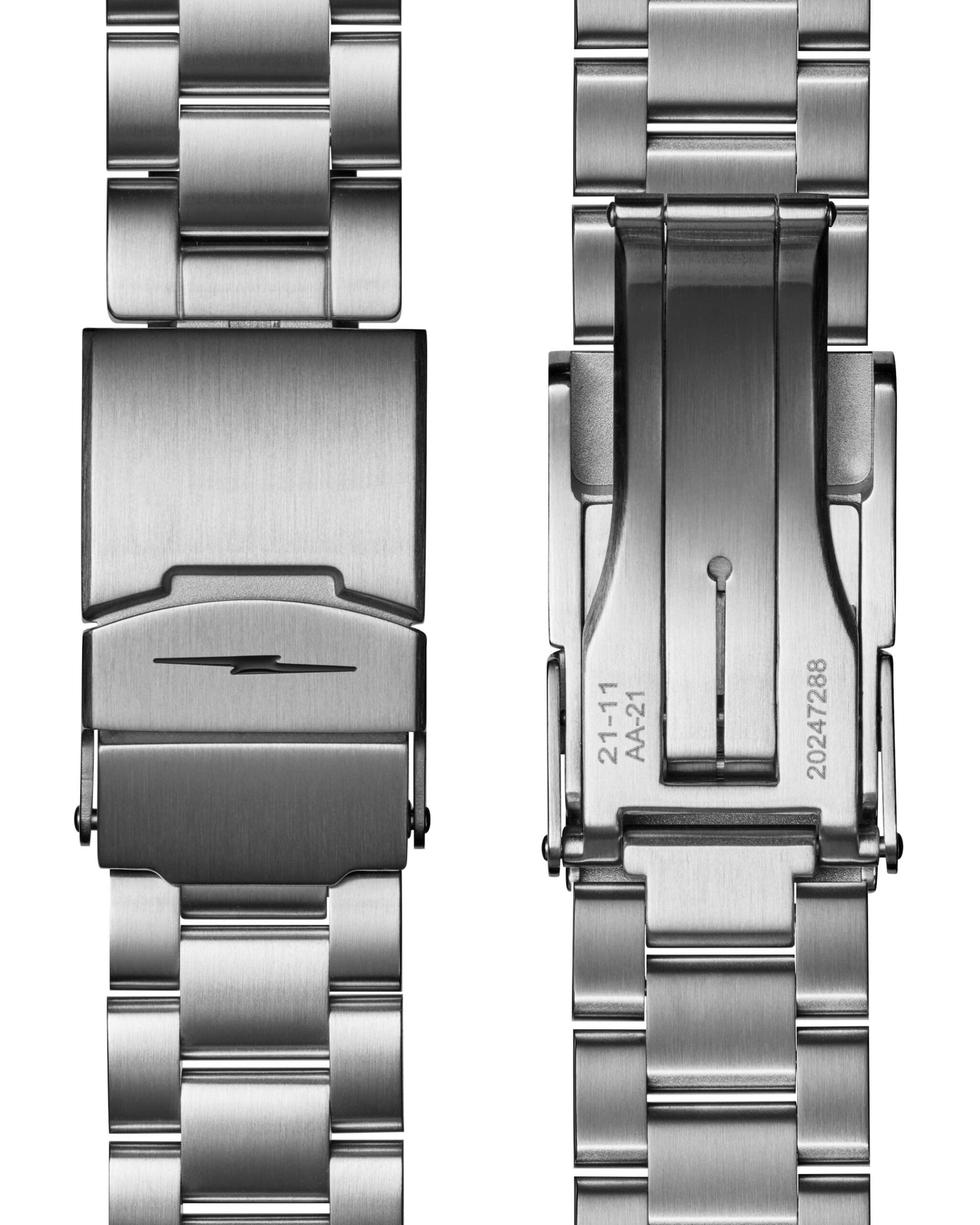 The stainless steel case measures in at 40mm, and it sits on a polished and brushed stainless steel bracelet fitted with a quick-release system and push-button removable links, meaning the wearer can adjust the fit on the fly without tools.