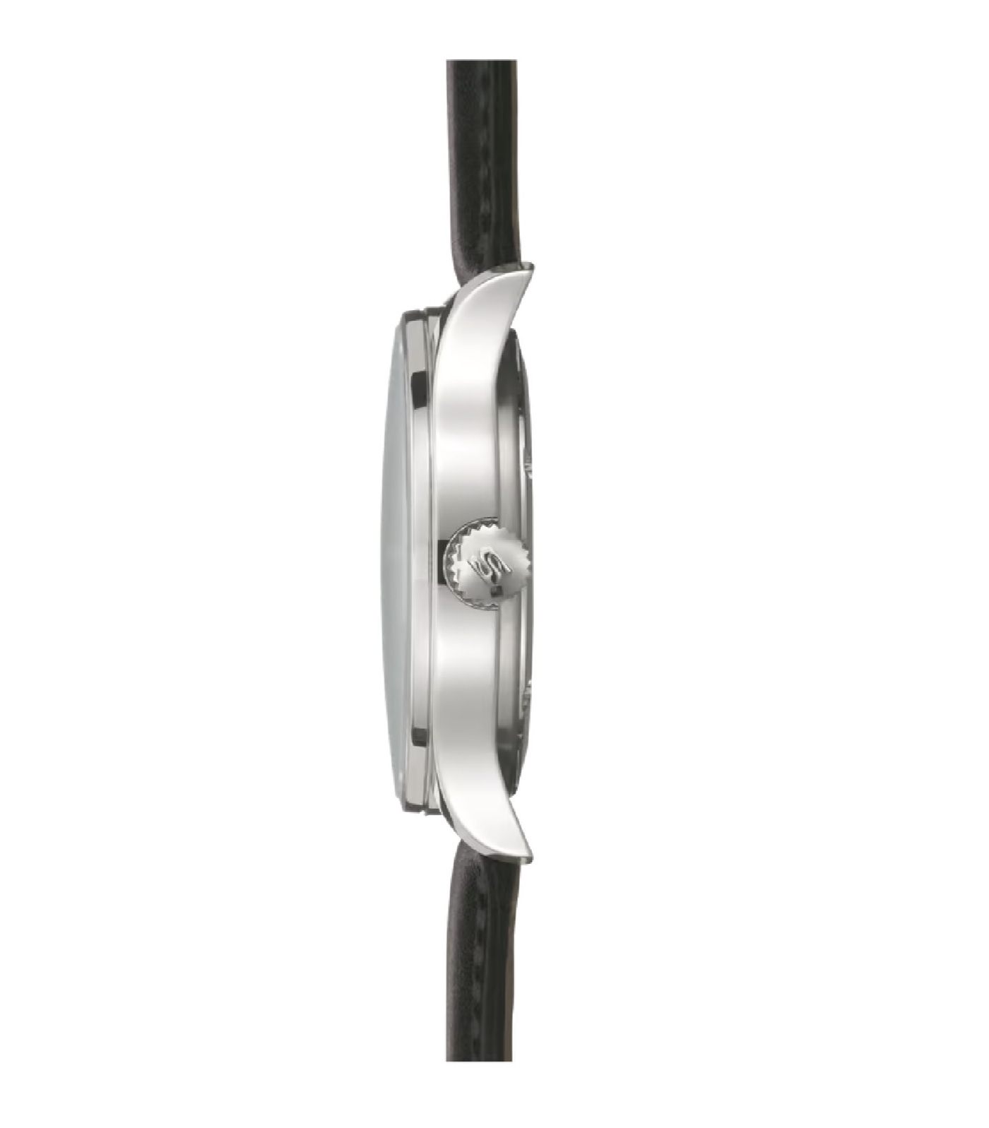 The watch has a stainless steel case, with a sapphire crystal face and back, allowing you to see the SW 330-1 automatic mechanical movement at work. That movement has 25 bearing jewels, 28,800 semi-oscillations per hour, and a 42 hour power reserve.