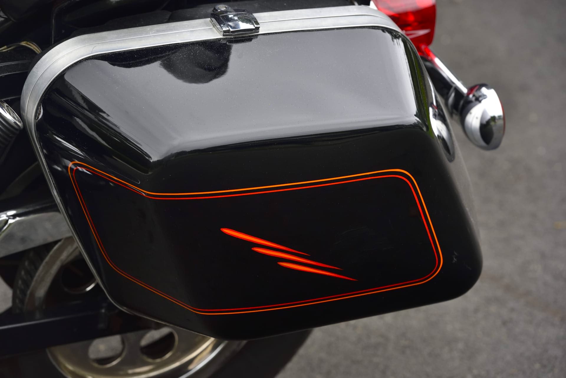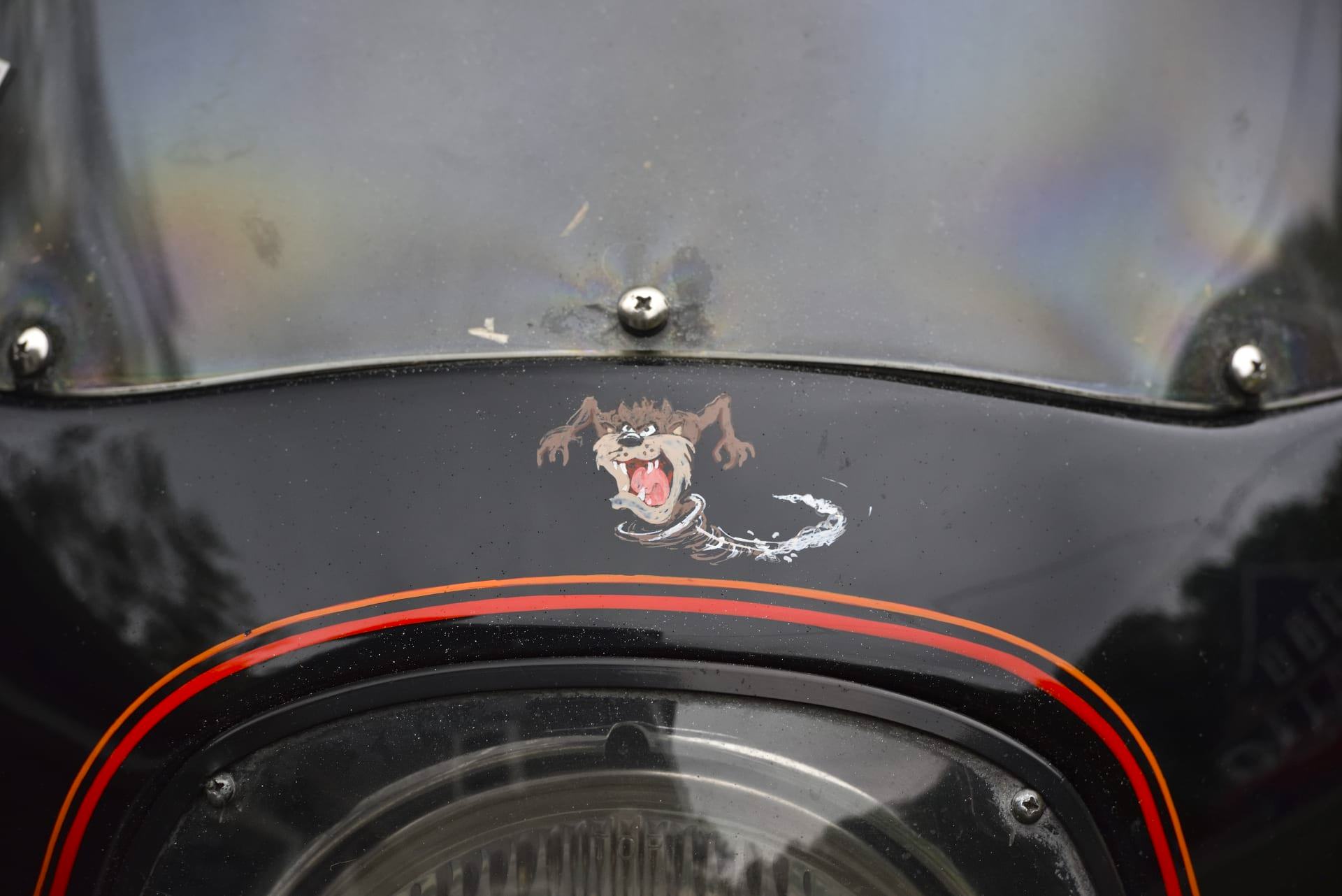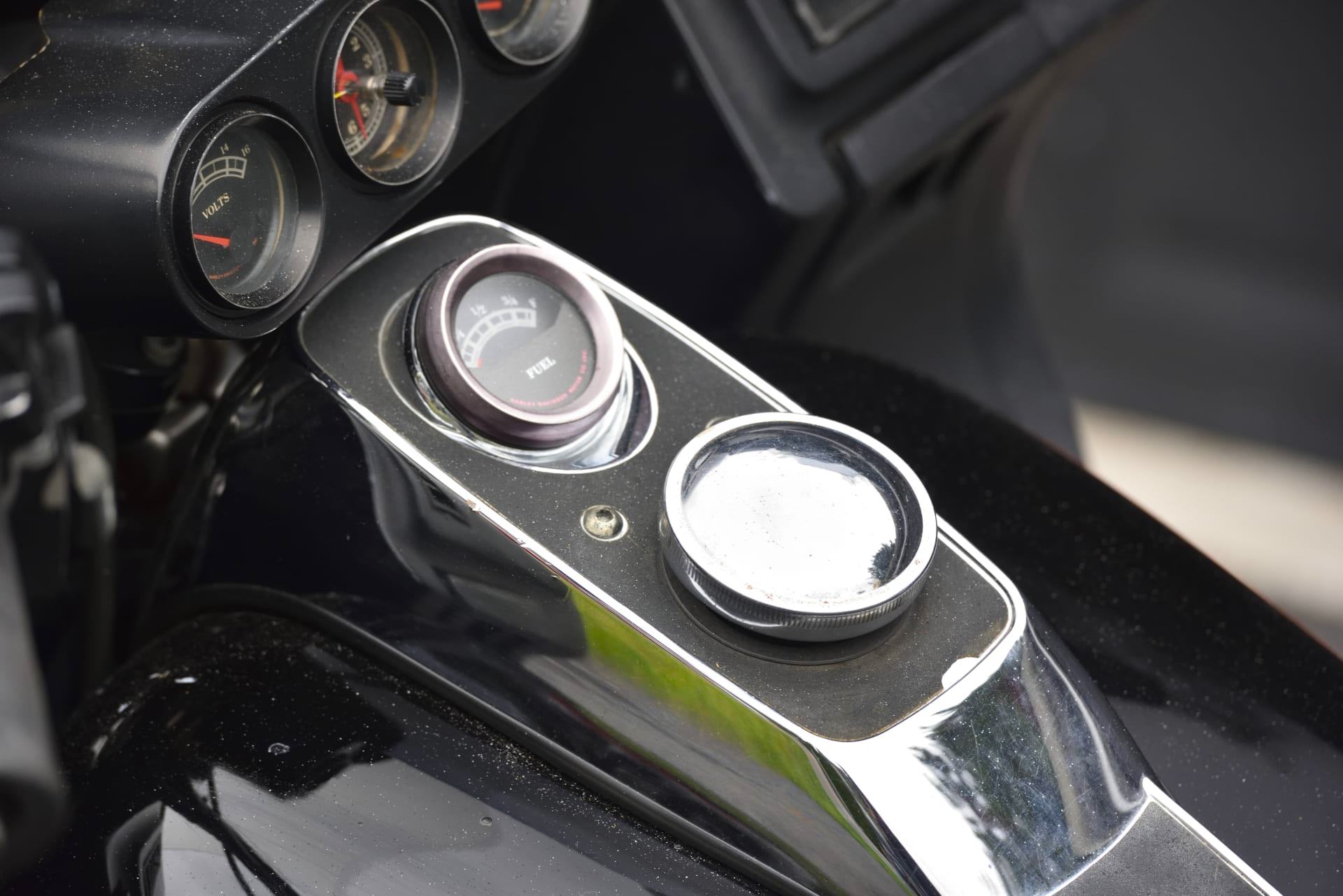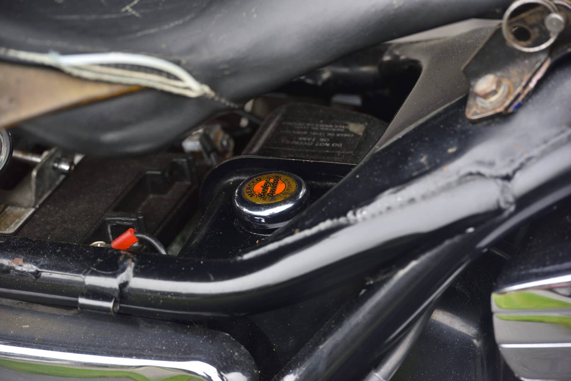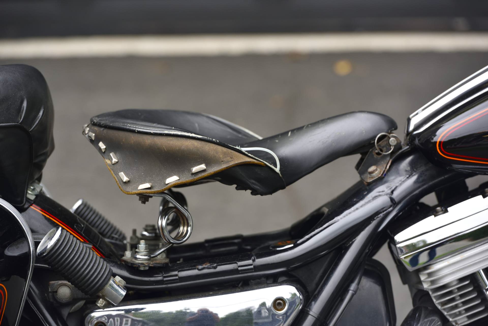Unusually, this bike has a sprung saddle, a feature not offered by the factory on this model, and it has an additional rear pillion seat with a backrest. It has an aftermarket exhaust, and it’s finished in custom black paintwork with red detailing – including the addition of Sonny Barger’s name on either side of the fuel tank.