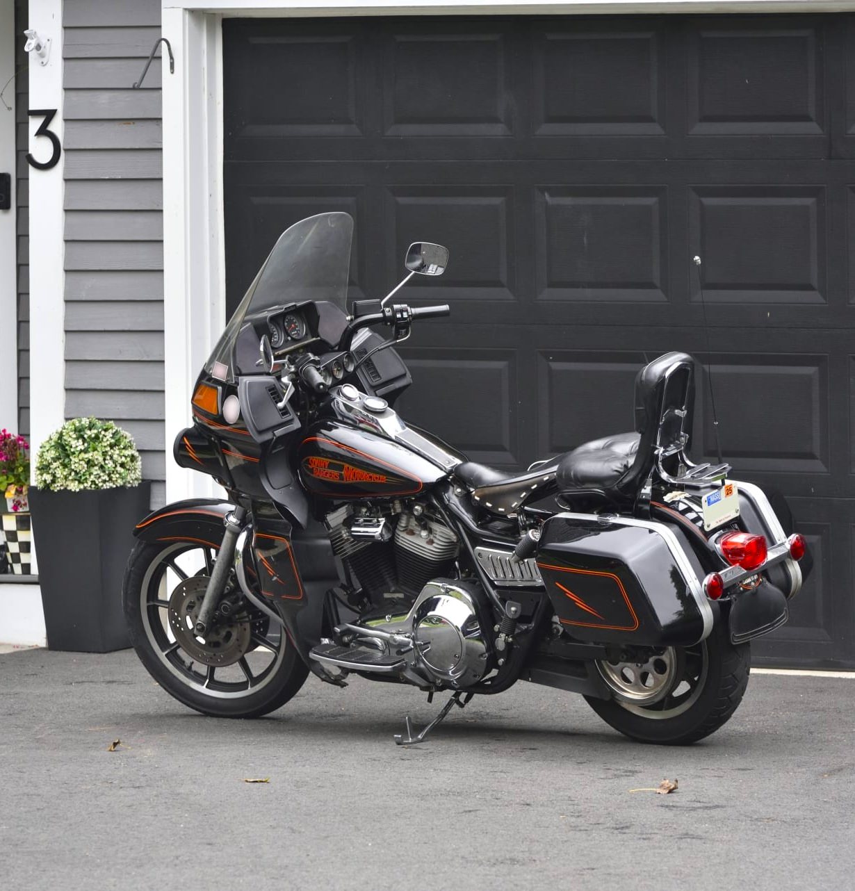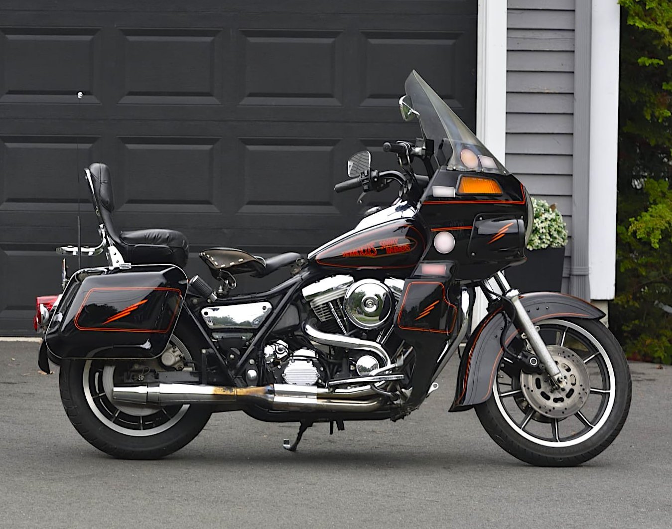 The 1992 Harley-Davidson FXRT you see here is the full touring model, that’s what the “T” appended to the name stands for. It has the front fairing to keep the wind at bay when riding cross country, and it has a pair of hard panniers for luggage.