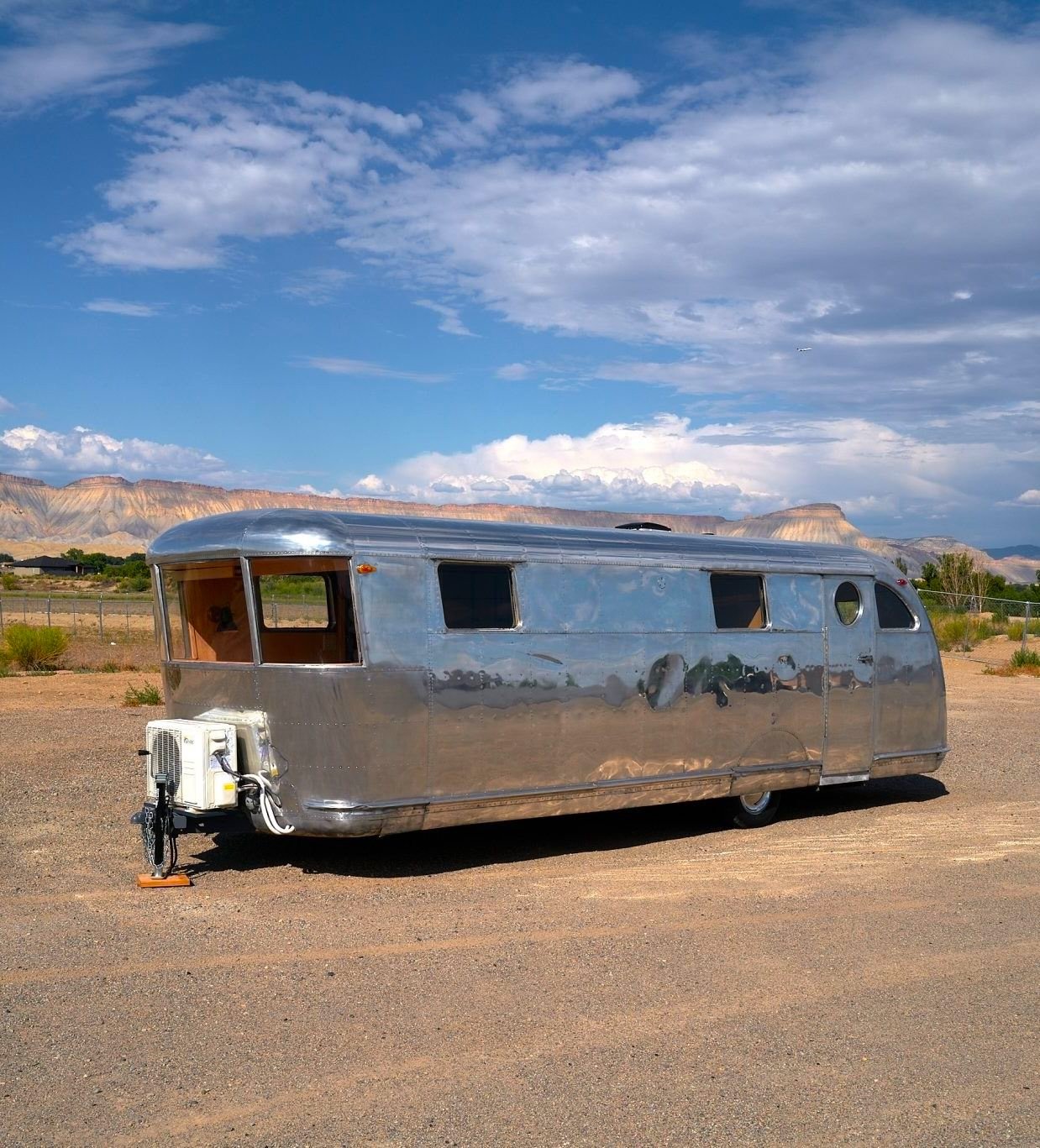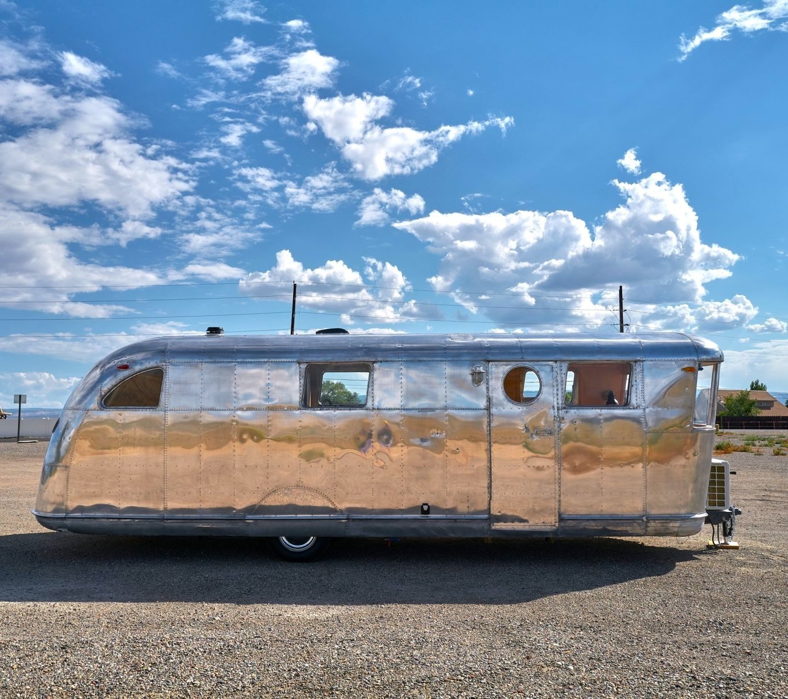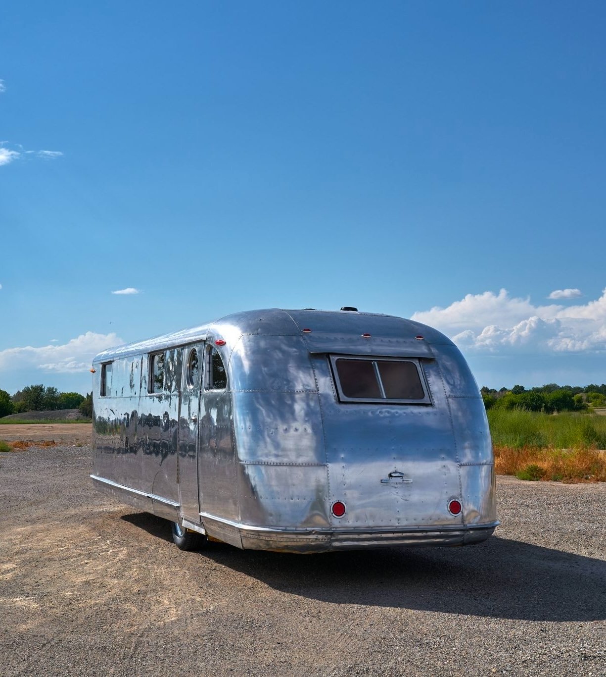 It keeps its classic polished aluminum exterior and aircraft-style riveted construction, but it now has an upgraded interior with a maple-paneled cabin, Marmoleum flooring, custom cabinetry, and a full wet bath.