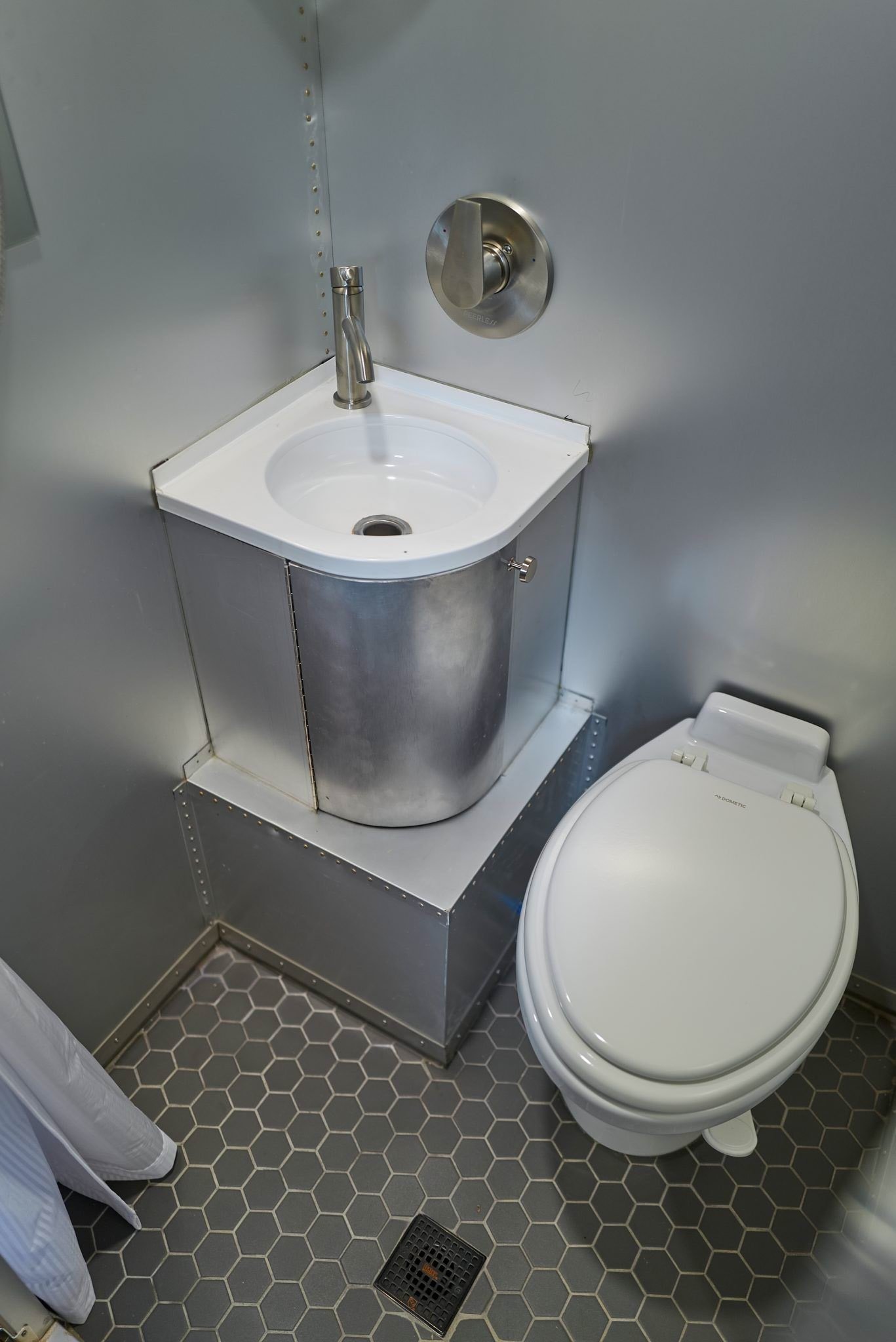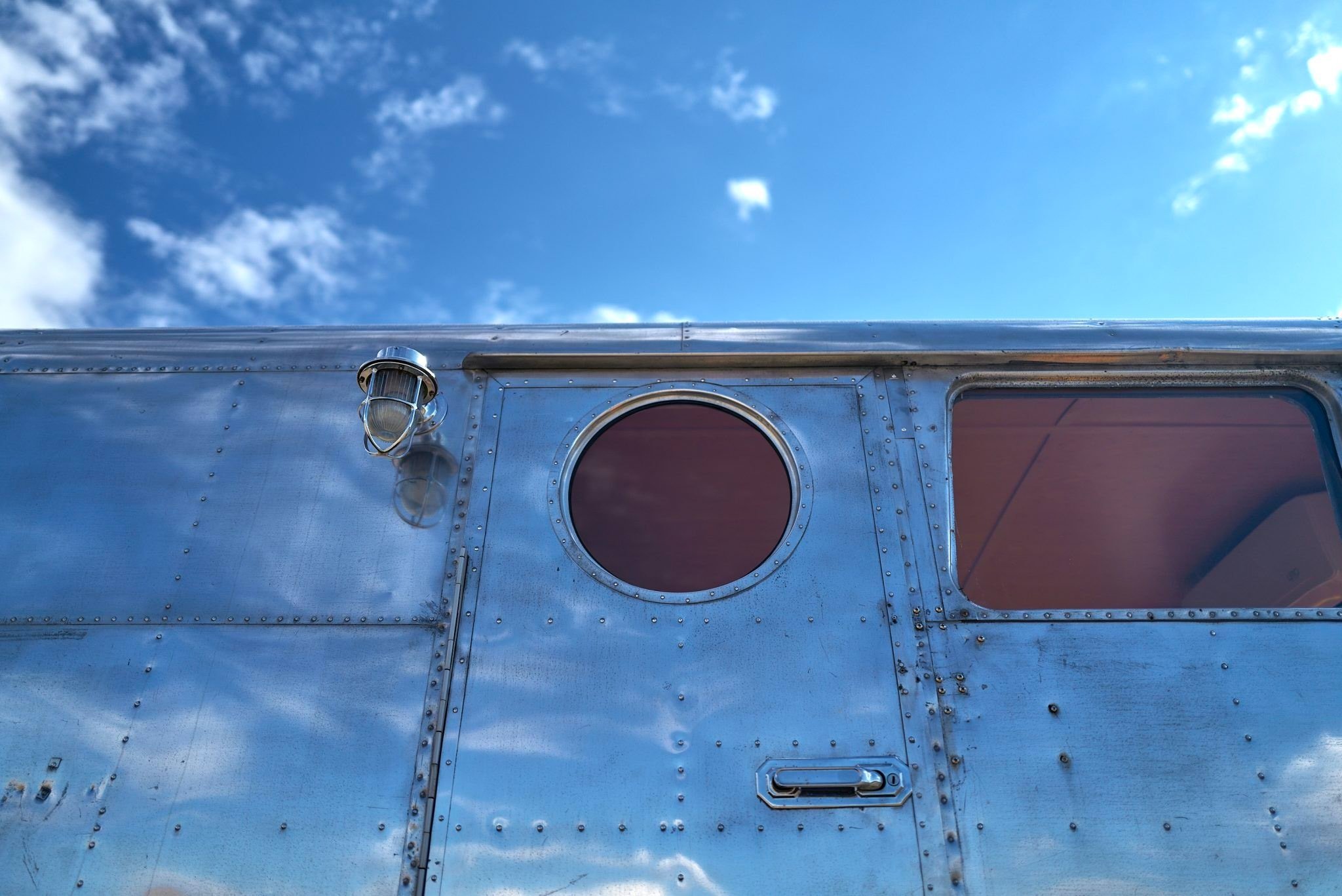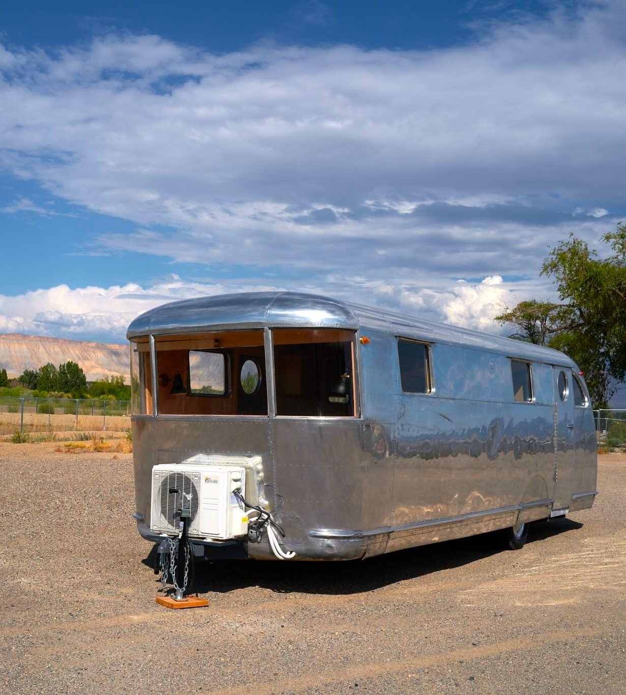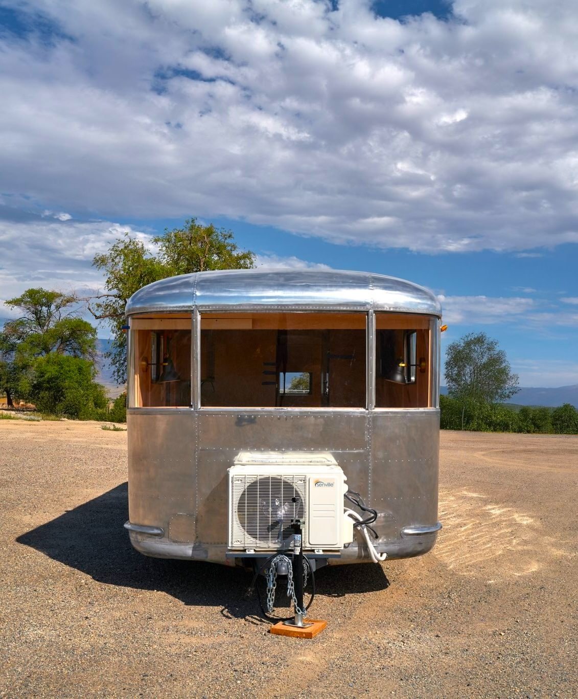 It keeps its classic polished aluminum exterior and aircraft-style riveted construction, but it now has an upgraded interior with a maple-paneled cabin, Marmoleum flooring, custom cabinetry, and a full wet bath.