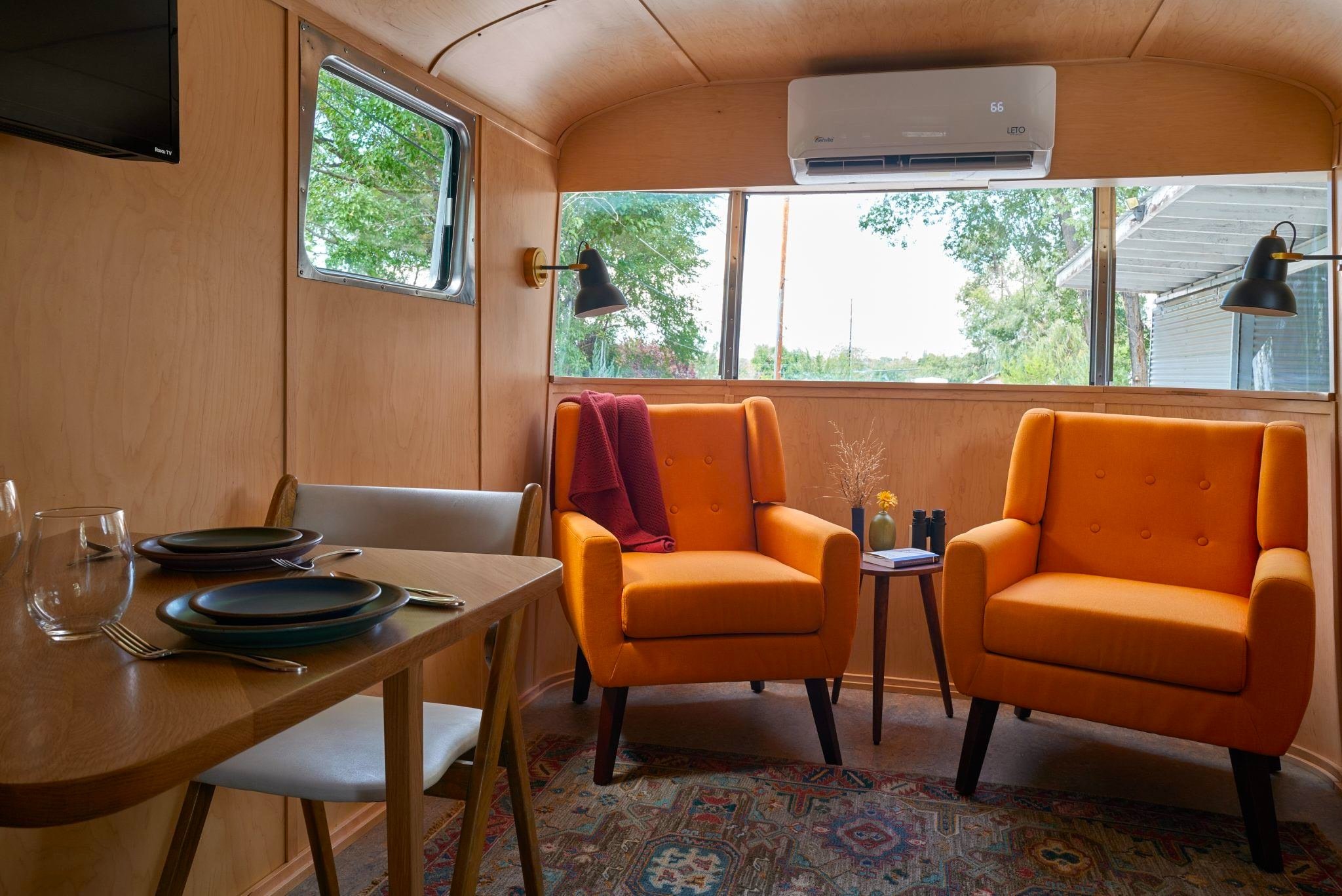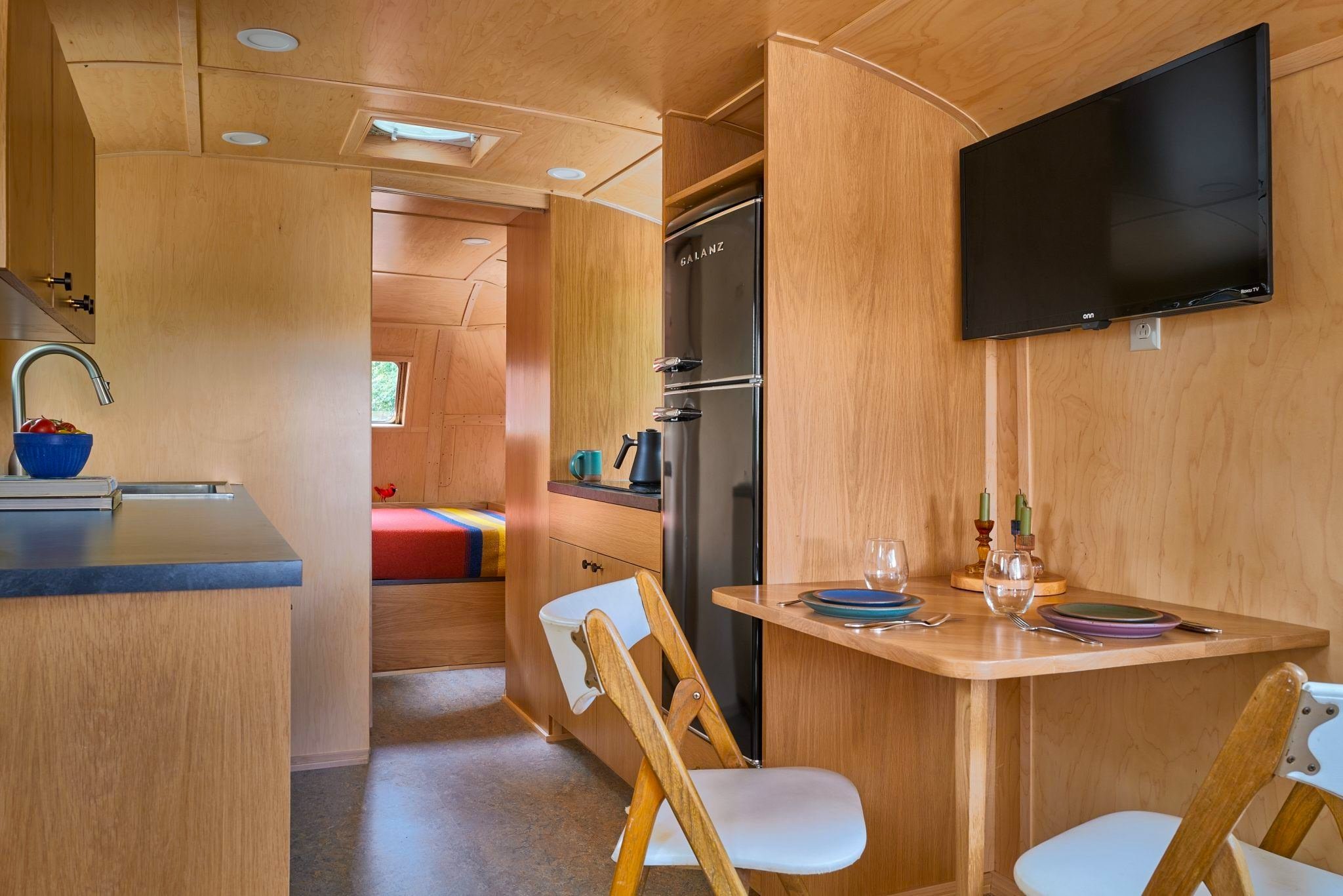 It now has hot and cold running water, insulation in the walls and floors, and a new interior with tastefully executed mid-century furniture. Inside you’ll find a double bed, a toilet with shower, a kitchenette, dinette, and sitting area.