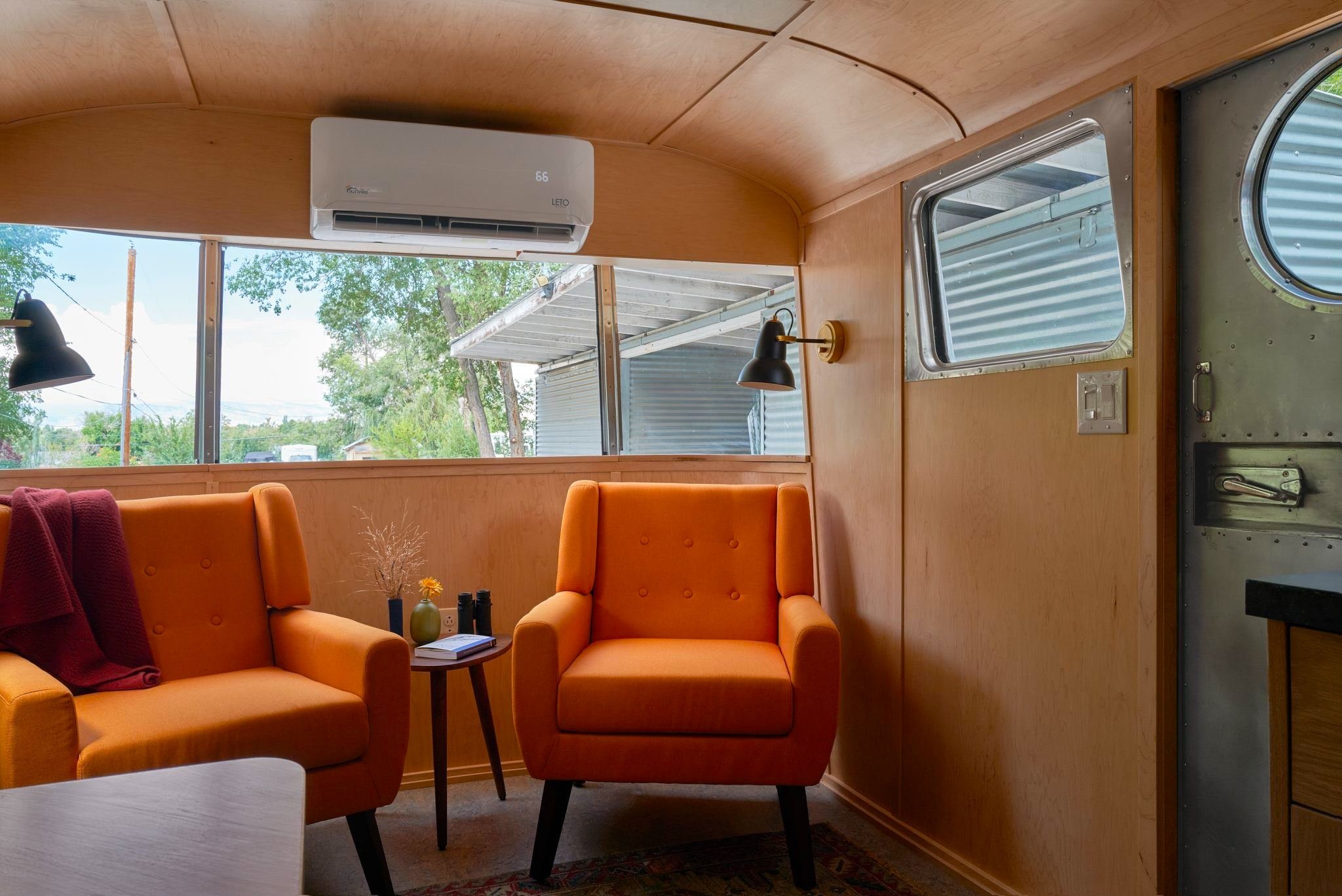 Inside, the observation lounge now centers around a pair of salmon-upholstered chairs, wall-mounted lamps, a corner table, and a television. A Senville LETO mini-split system provides both heating and cooling, giving it genuine year-round usability.