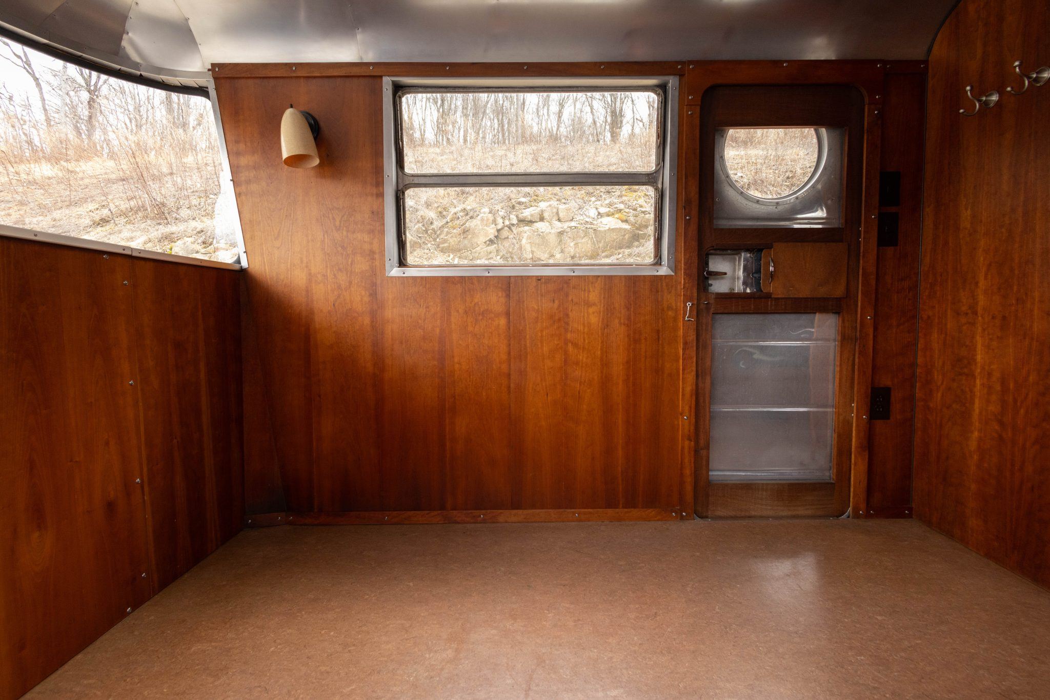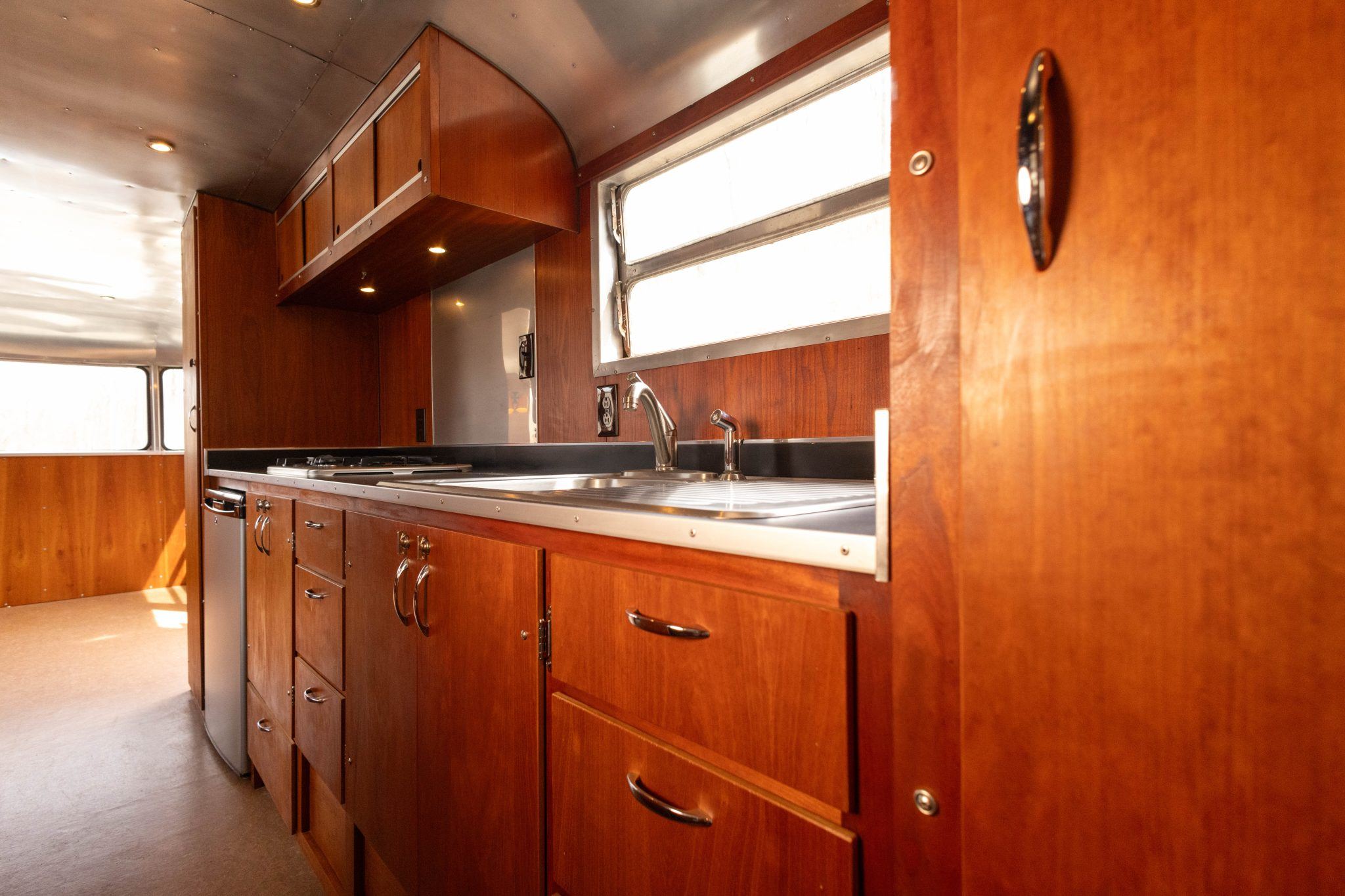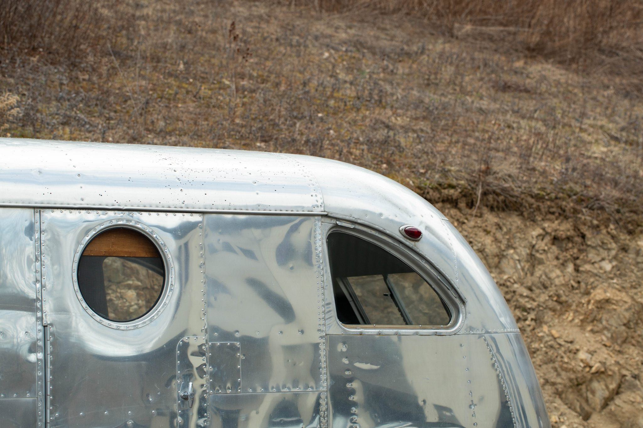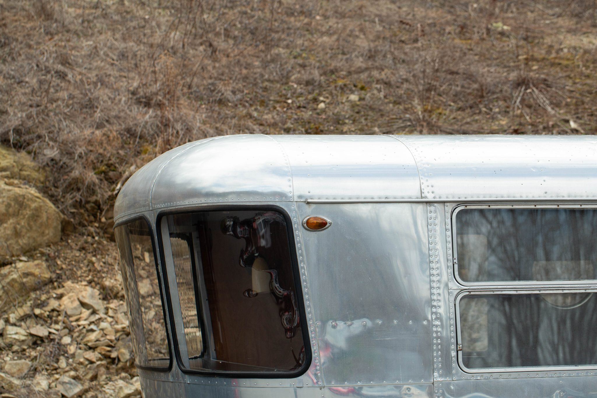 The exterior work during that refurbishment included polishing the riveted aluminum shell, replacing the window seals, and installing rebuilt exterior lighting. It has two doors fitted with porthole windows positioned at the front right and left rear, retractable step plates beneath each door, wrap-around front windows, dual-horizontal-pane side windows, and a lighting sconce next to the front door.