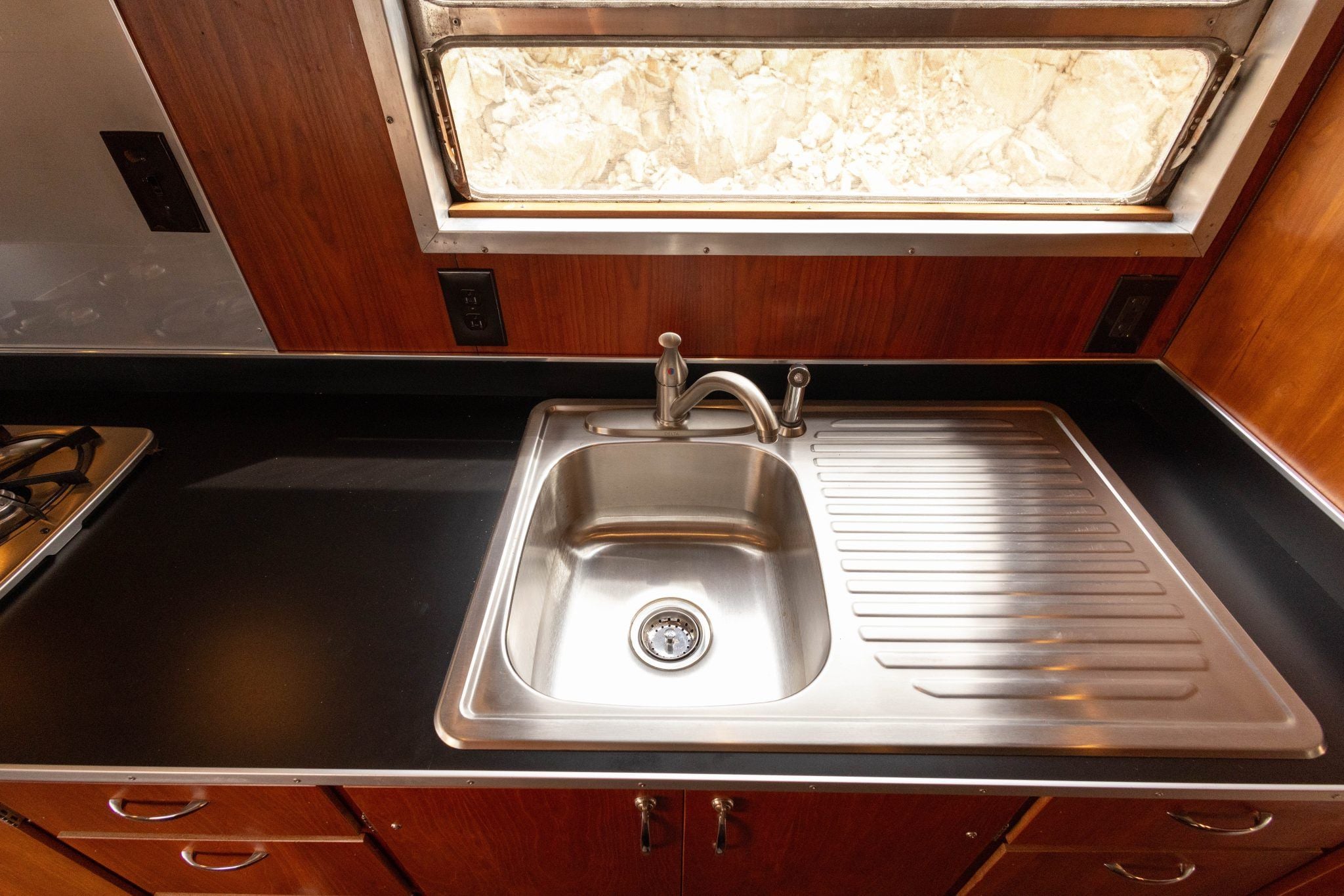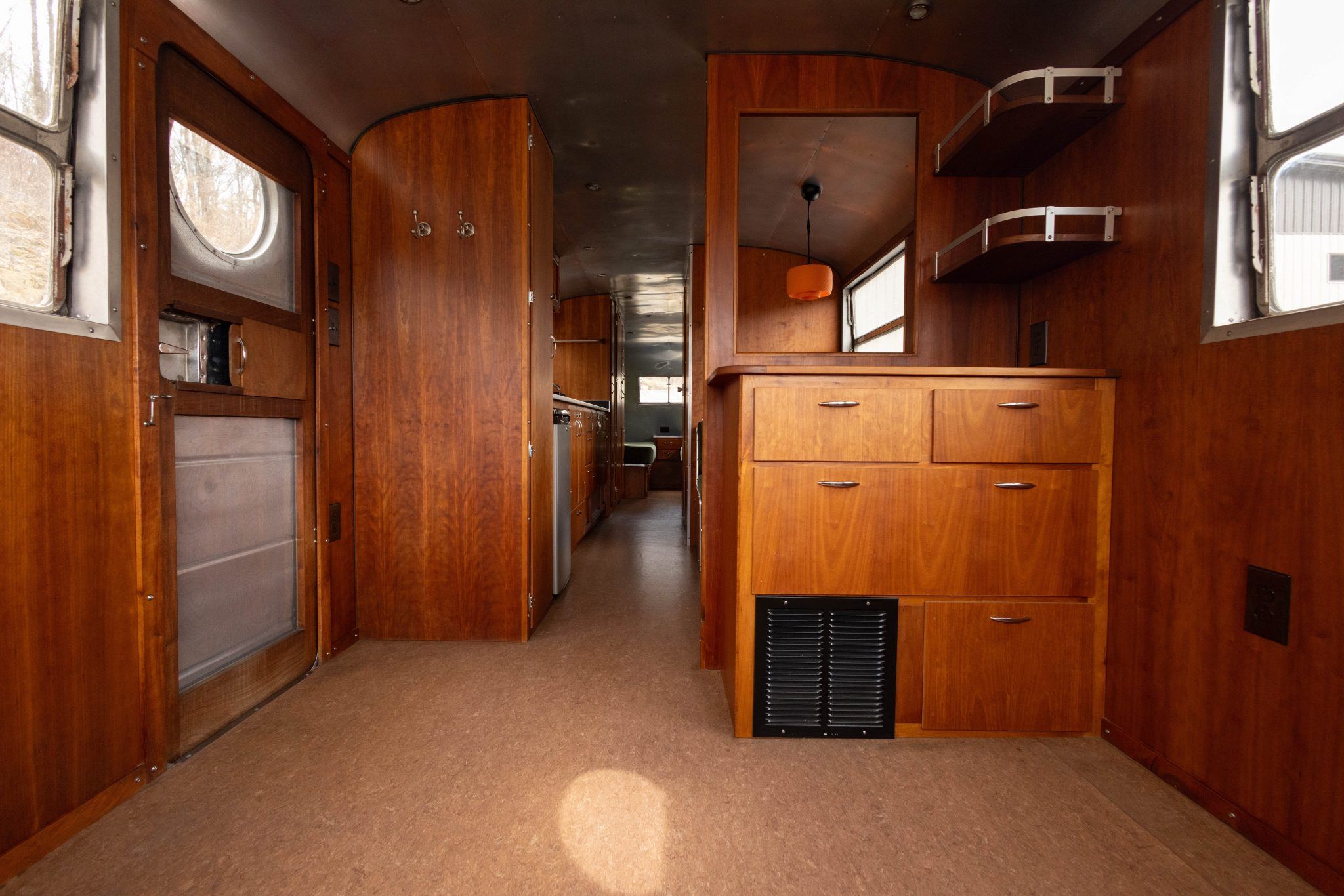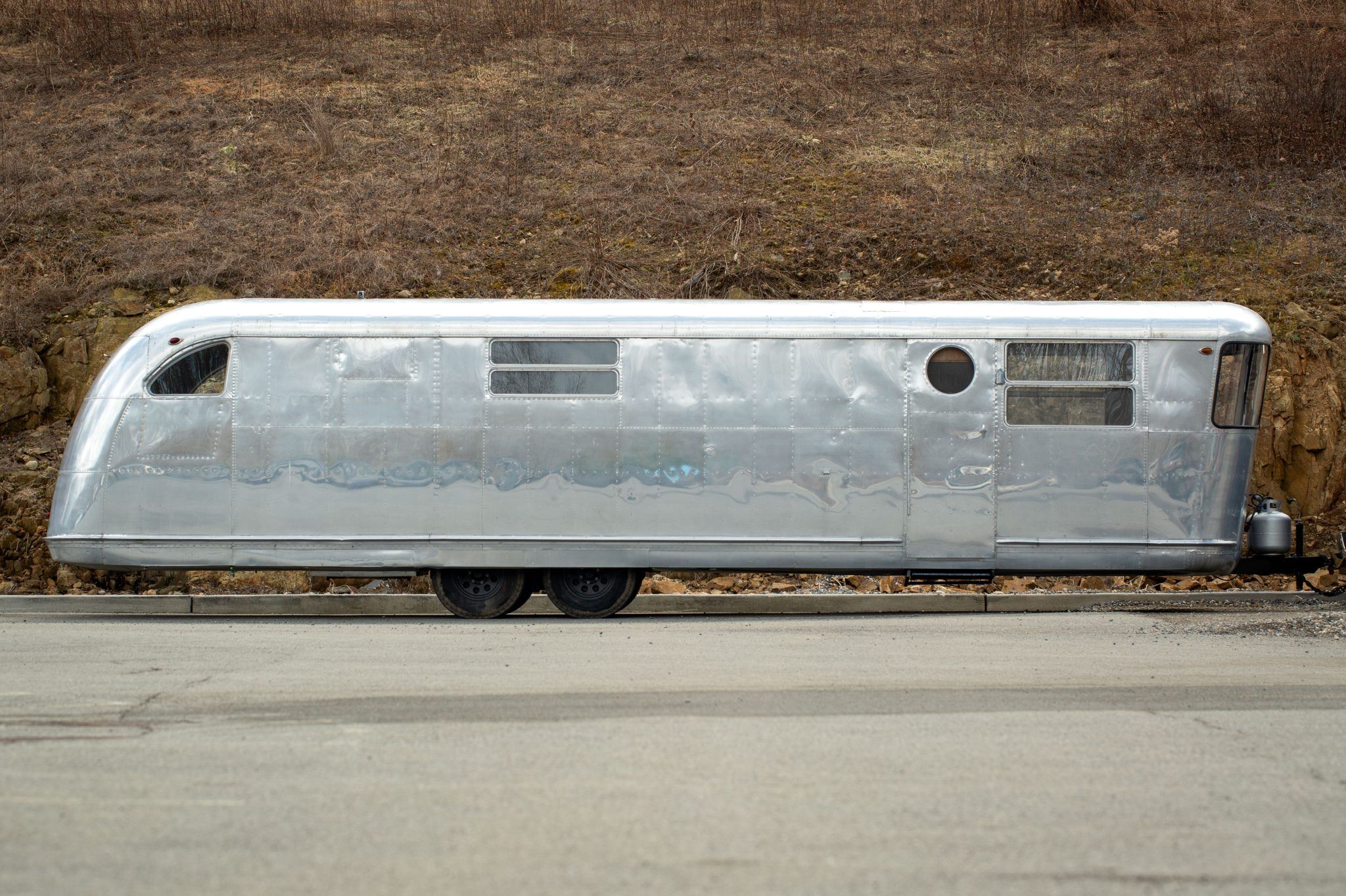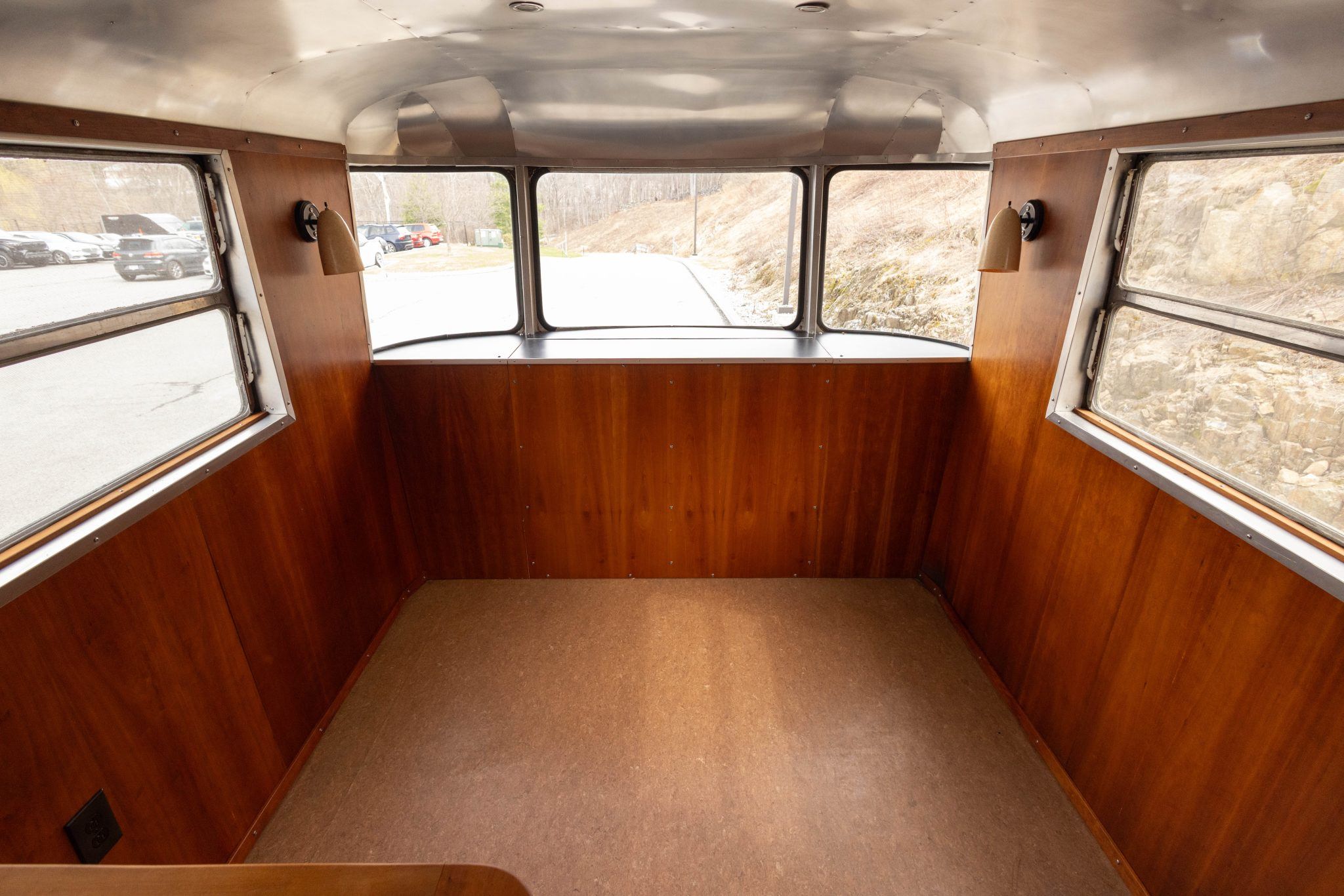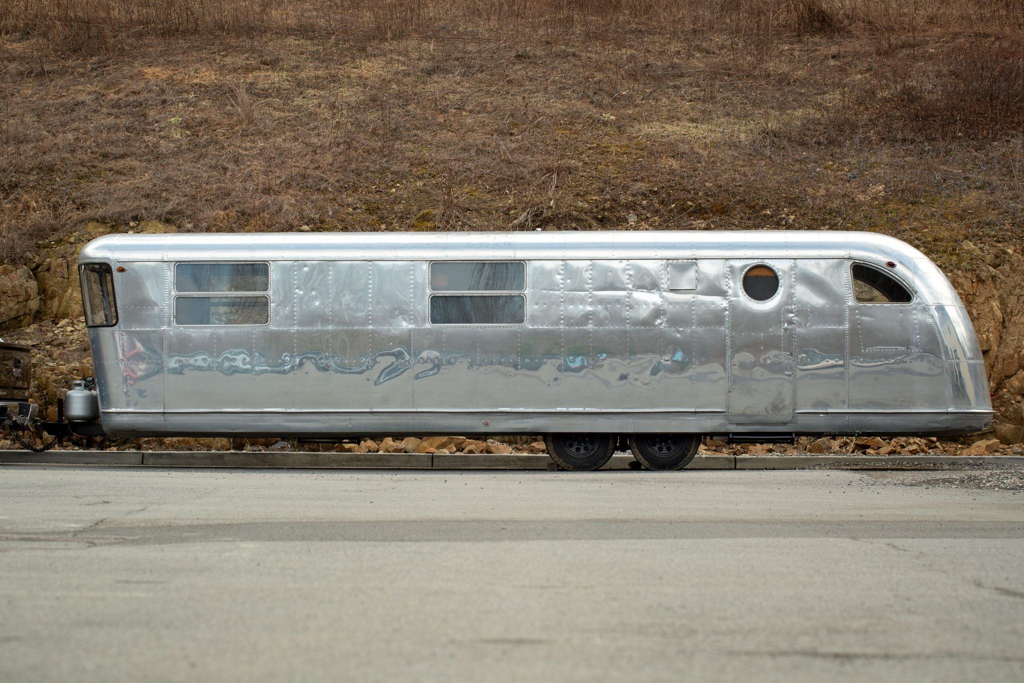 The exterior work during that refurbishment included polishing the riveted aluminum shell, replacing the window seals, and installing rebuilt exterior lighting. It has two doors fitted with porthole windows positioned at the front right and left rear, retractable step plates beneath each door, wrap-around front windows, dual-horizontal-pane side windows, and a lighting sconce next to the front door.