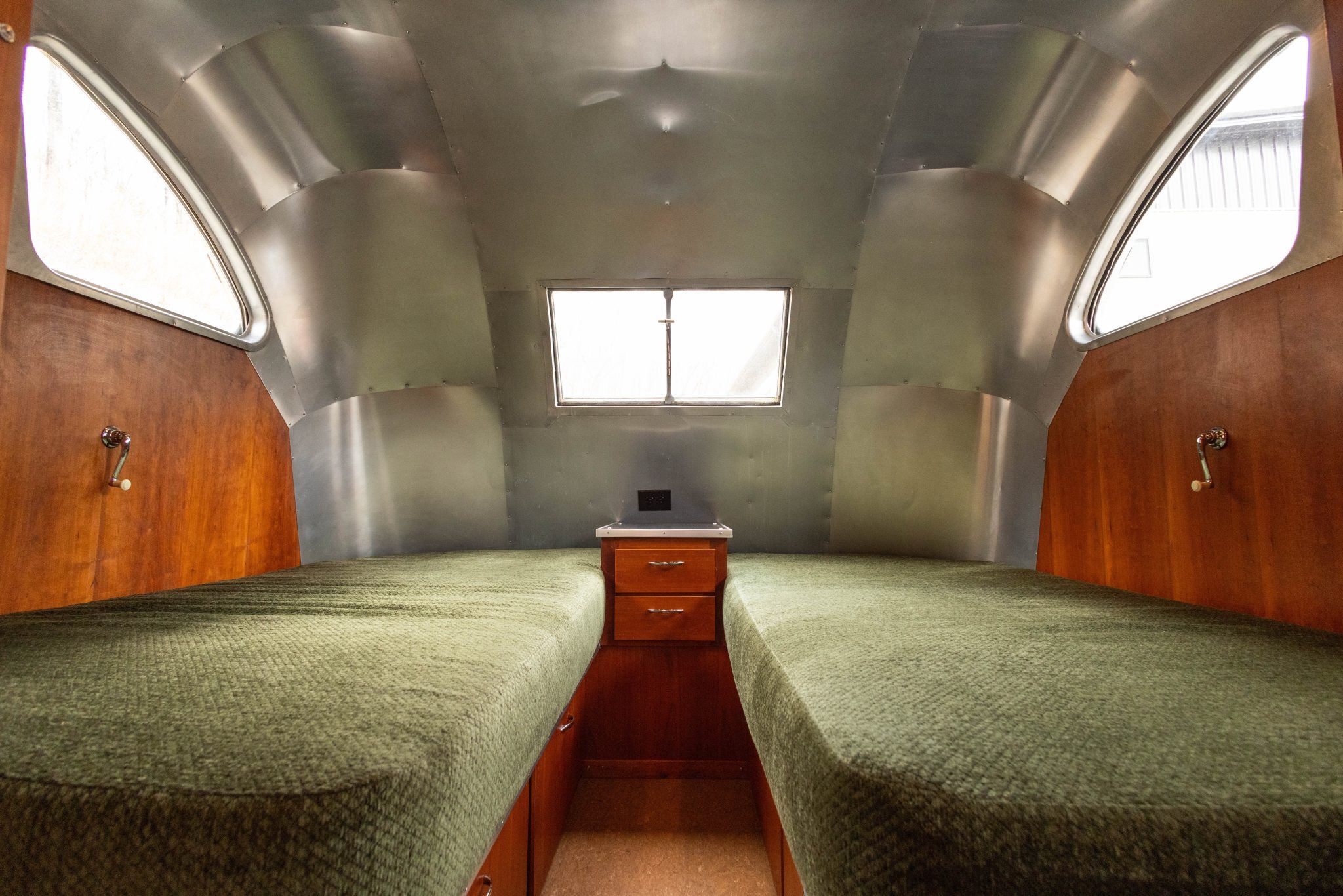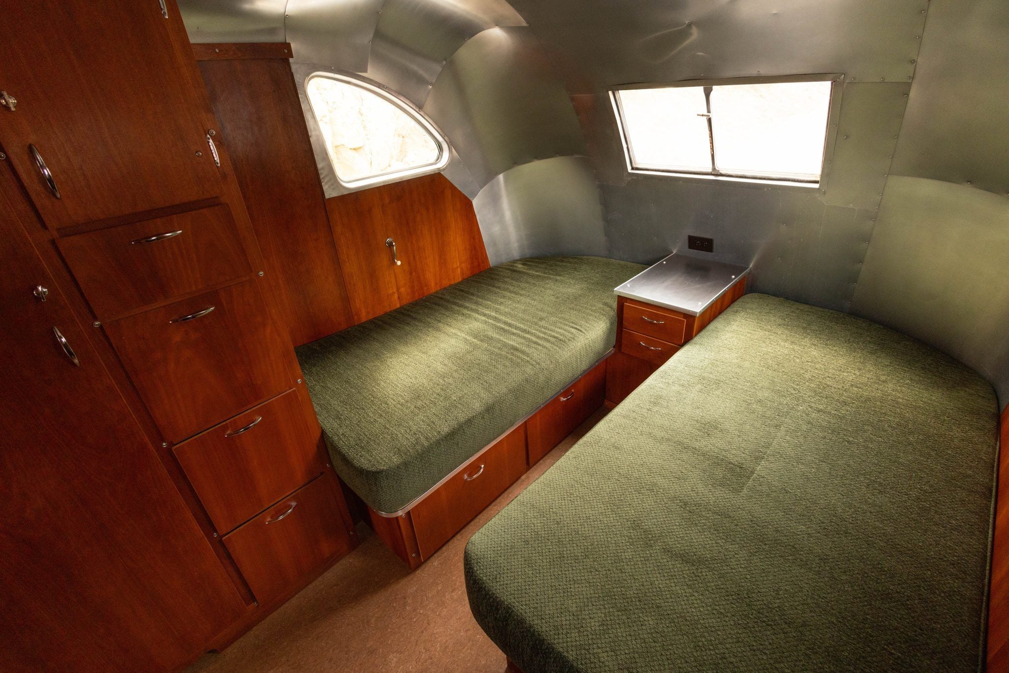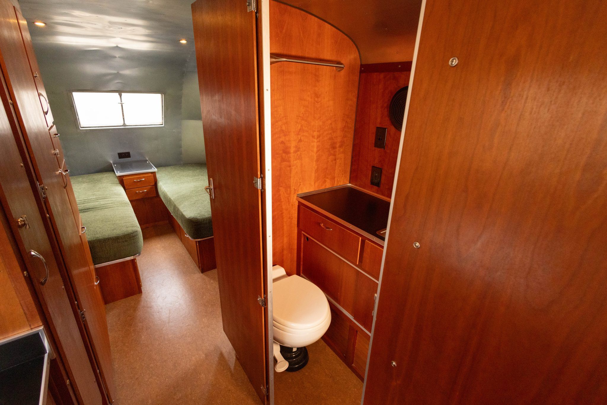 The rear of the trailer is configured as a sleeping area with twin mattresses upholstered in matching green cloth, mounted on cherry bases that incorporate underbed storage drawers. The bathroom includes a stand-alone shower lined with 26 gauge stainless steel, a pedal-flush toilet, and a counter with a stainless-steel sink.
