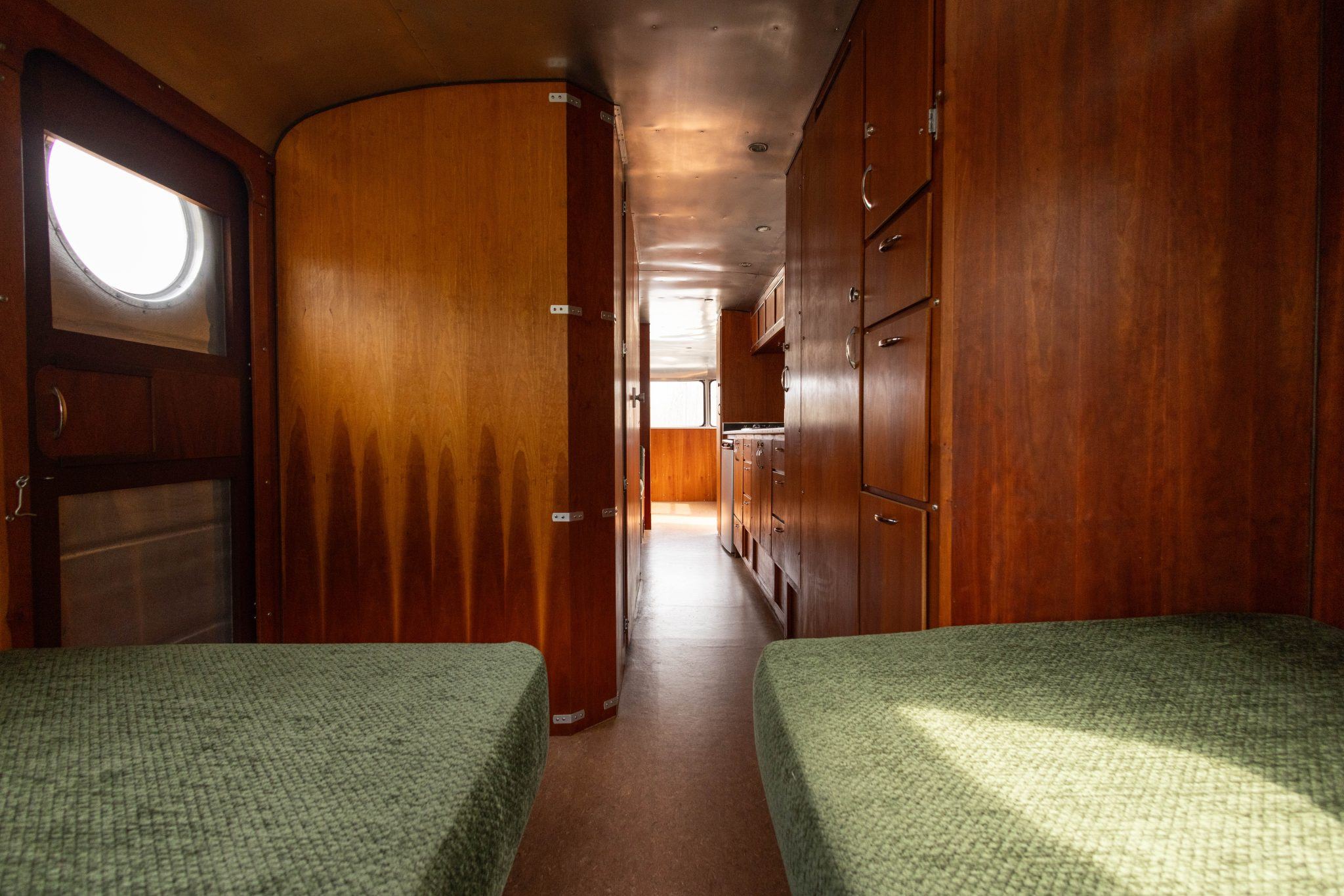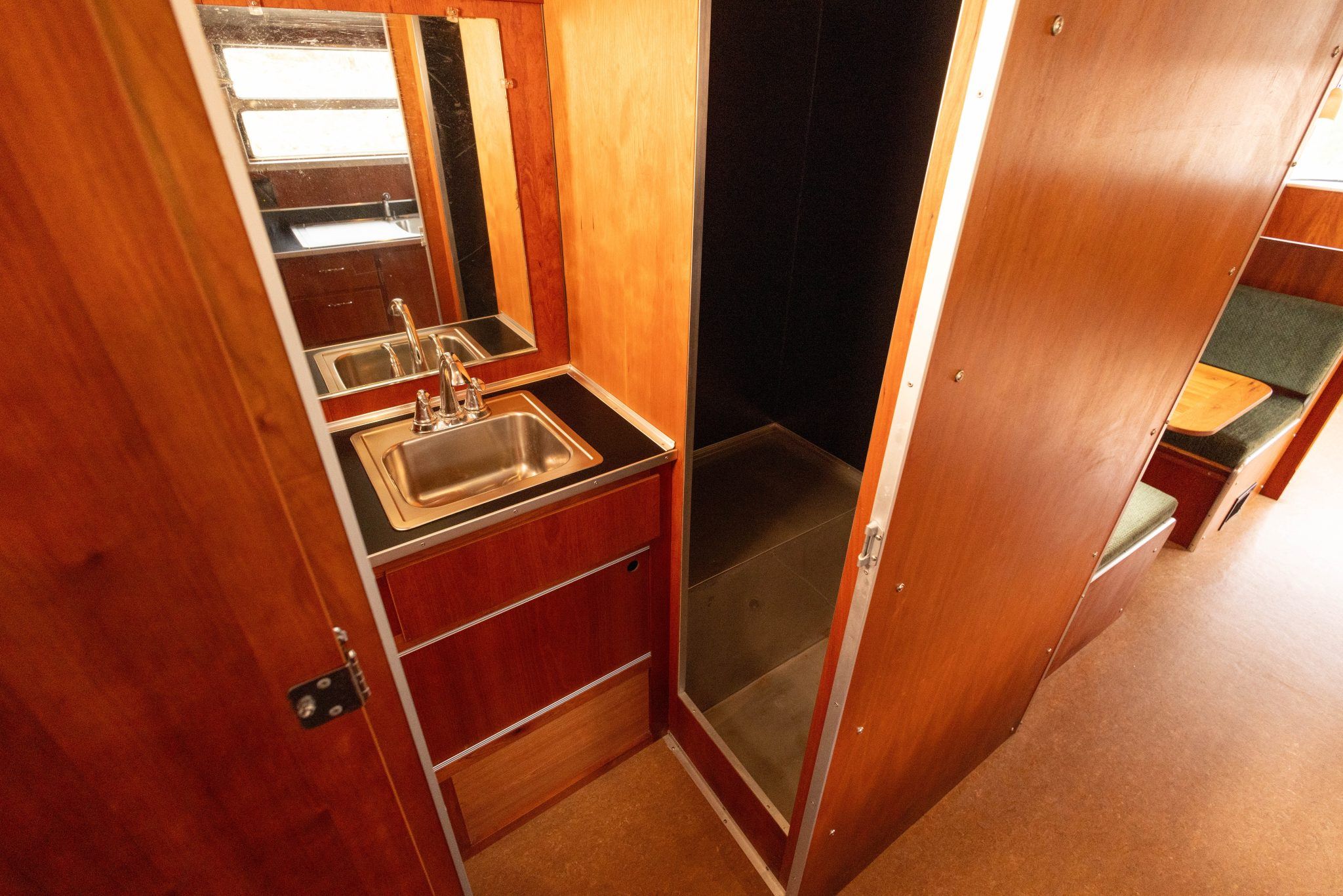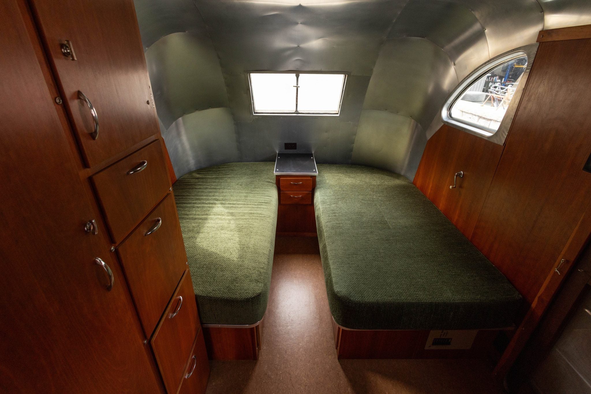 The rear of the trailer is configured as a sleeping area with twin mattresses upholstered in matching green cloth, mounted on cherry bases that incorporate underbed storage drawers. The bathroom includes a stand-alone shower lined with 26 gauge stainless steel, a pedal-flush toilet, and a counter with a stainless-steel sink.