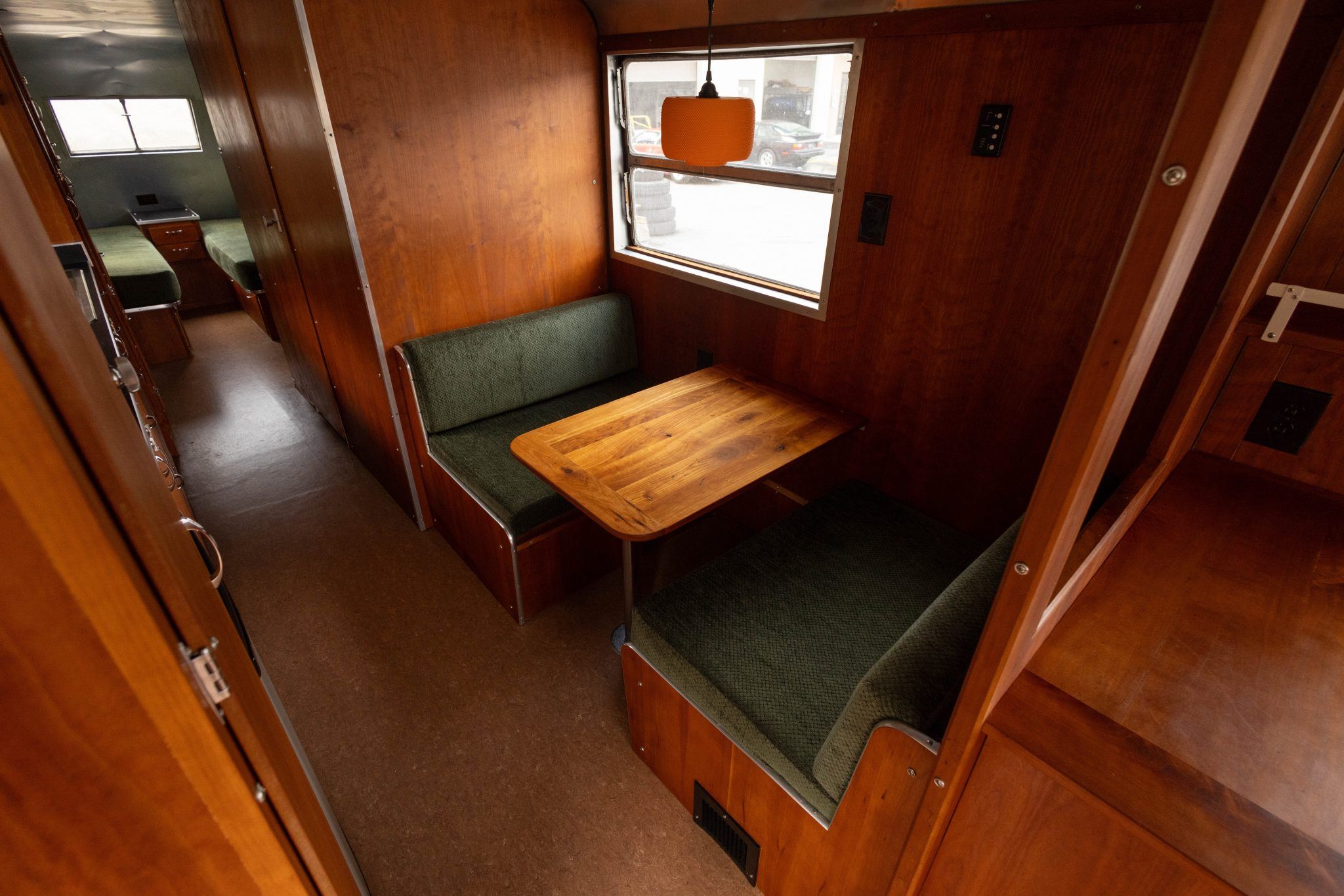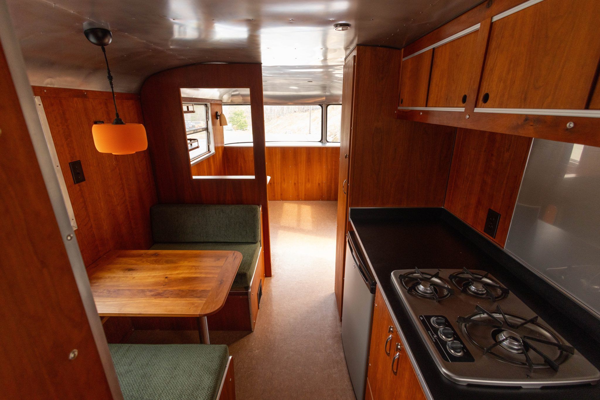 Inside, the team at Texas Vintage Travel Trailer essentially rebuilt the trailer from the structure outward. Replacement wiring, plumbing, and insulation were installed before new interior wall panels went in, followed by Armstrong vinyl flooring, aluminum ceiling panels, updated lighting fixtures, and cherry cabinetry.