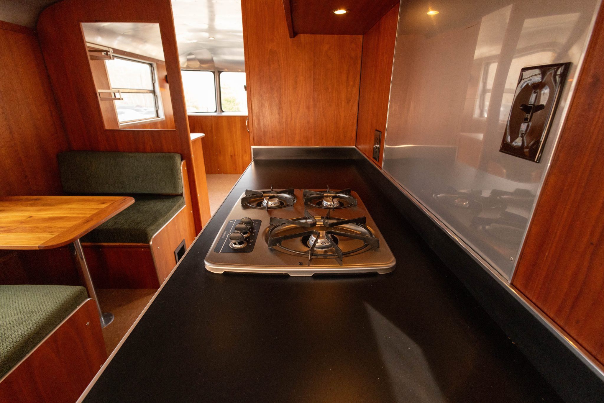 The galley contains a dinette with green cloth upholstery, a Wedgewood Vision three-burner propane stove, a Frigidaire refrigerator, and a stainless-steel sink. Climate control comes from a Dometic HVAC unit cleverly tucked under one of the dinette benches, while a Whale six-gallon electric unit handles water heating.