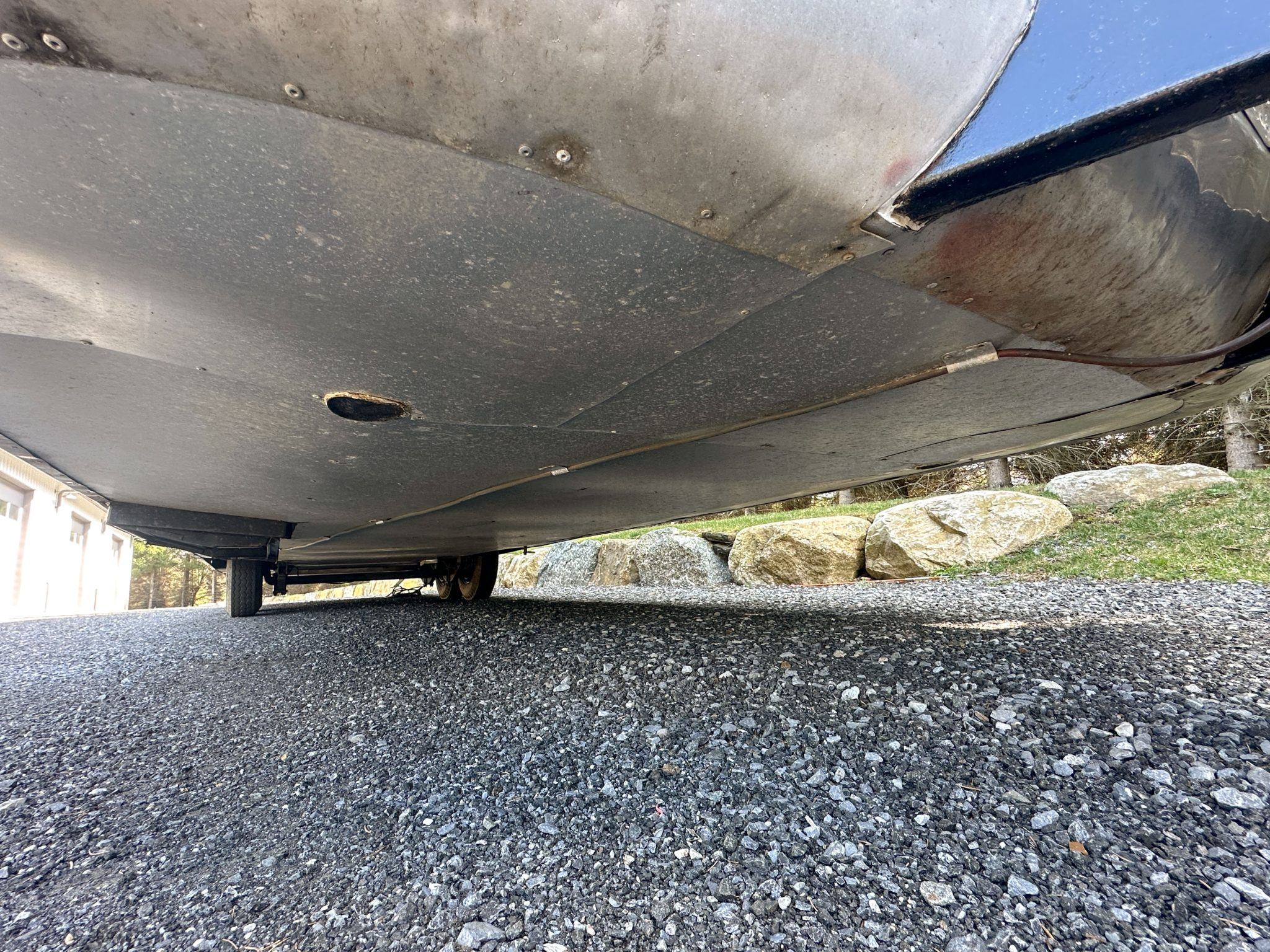 Underneath, the 2012 refurb work was equally extensive – the frame was repaired and partially repainted, the wood sub-flooring was replaced, and the axles, leaf springs, and electric drum brakes were all renewed, with black-painted wheels fitted. The tongue carries a manual jack installed during the refurbishment along with twin propane tanks, and replacement aluminum panels were fitted to the underside of the trailer.