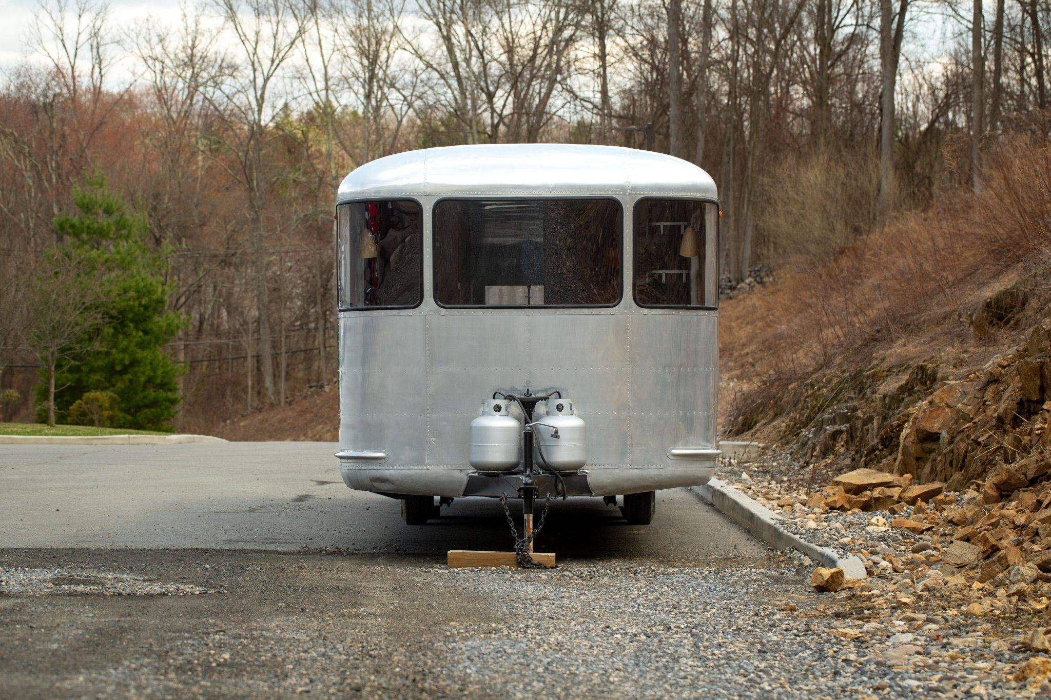 - Underneath, the refurbishment renewed the frame, wood subflooring, axles, leaf springs, electric drum brakes, and underside aluminum panels, with black-painted wheels fitted and a manual jack and twin propane tanks added to the tongue. Inside, replacement wiring, plumbing, insulation, vinyl flooring, aluminum ceiling panels, and cherry cabinetry were installed.