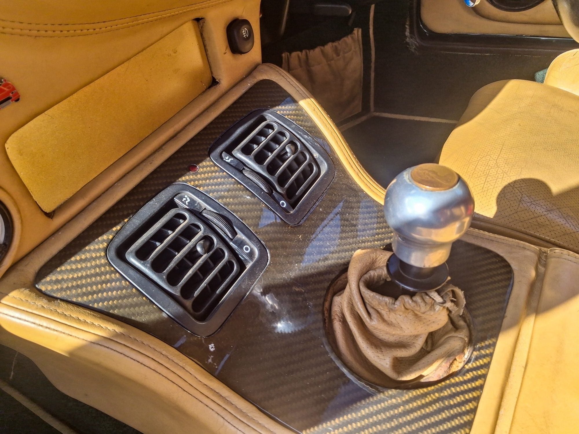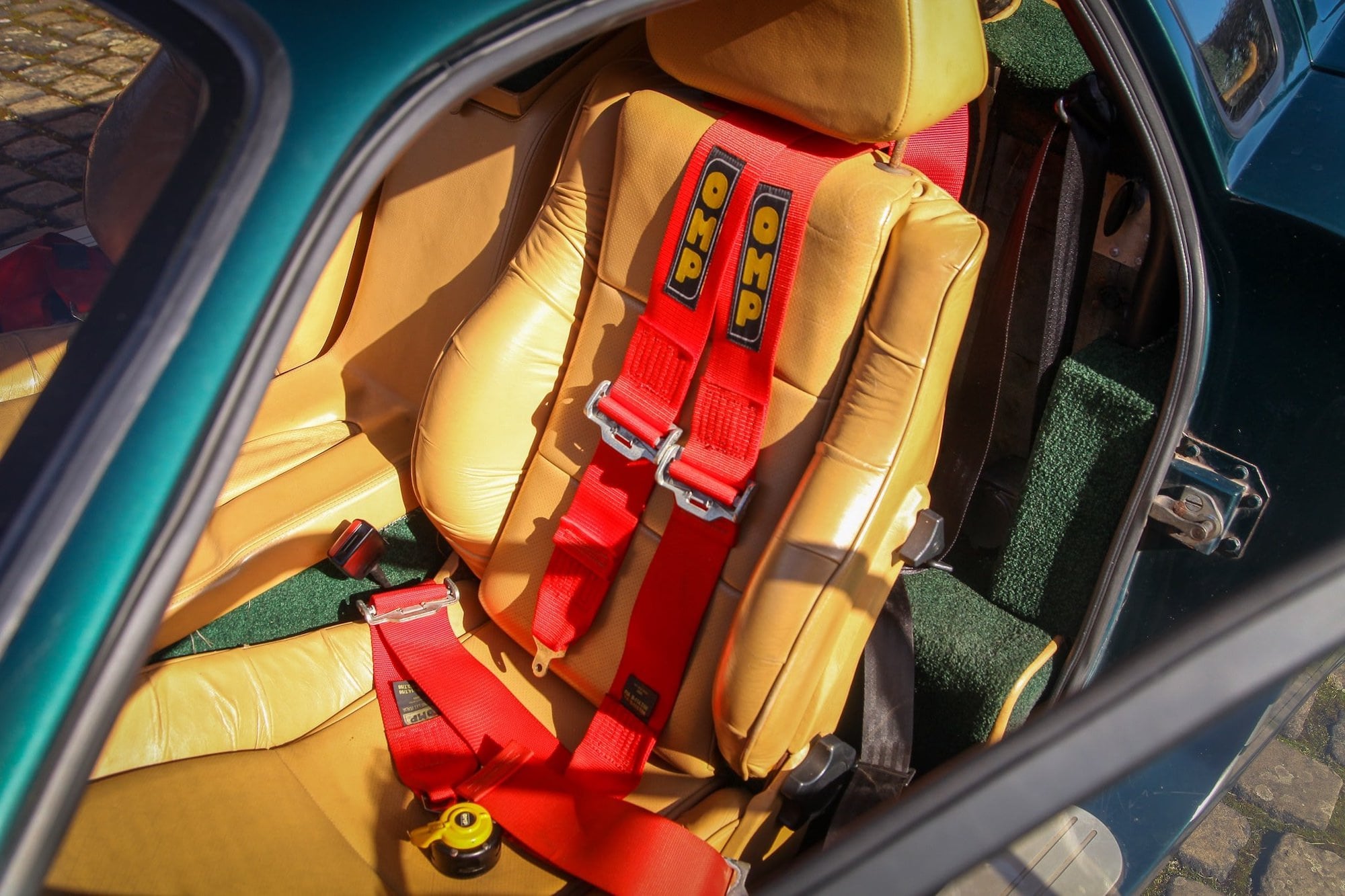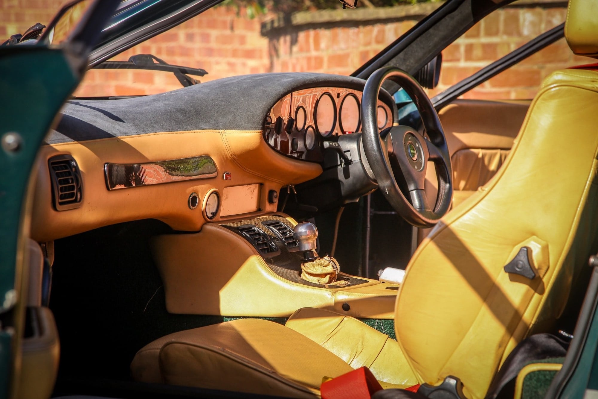 Inside, the car has a beige leather interior with Wilton carpet, OMP harnesses, a veneered dashboard, and white-faced dials. The listing also notes that the aluminium and honeycomb composite chassis shows no structural advisories on the MOT, and the car carries an MOT valid until the 7th of July 2026 with no advisories.